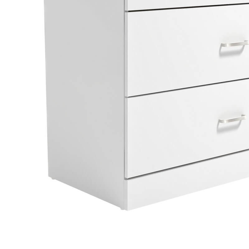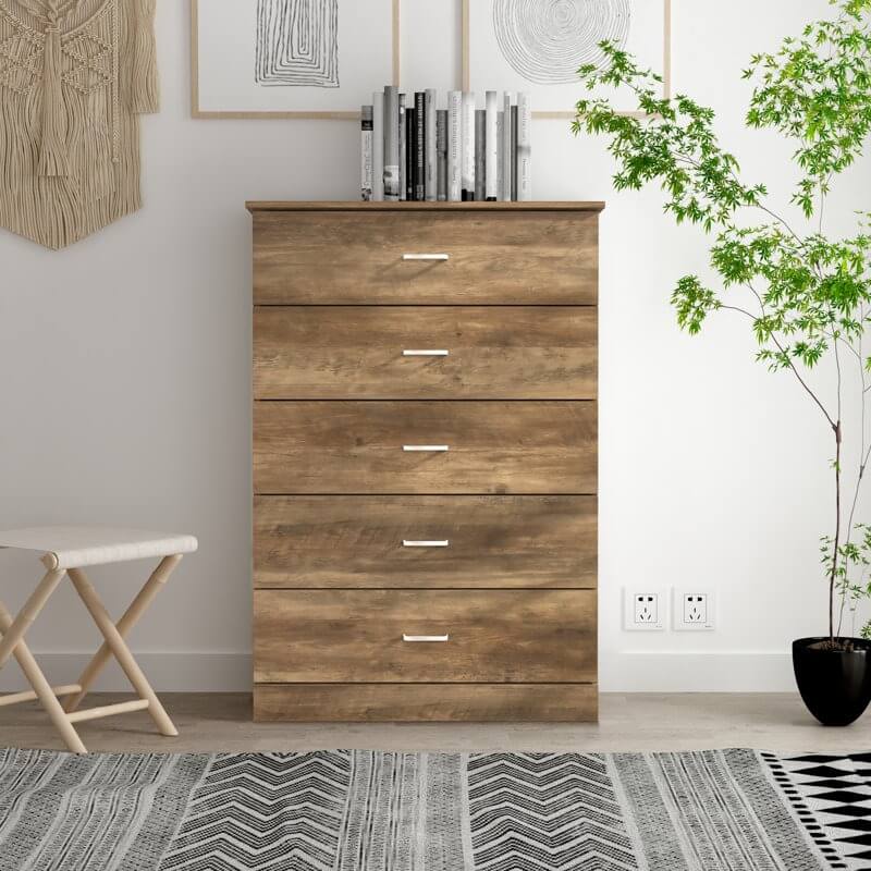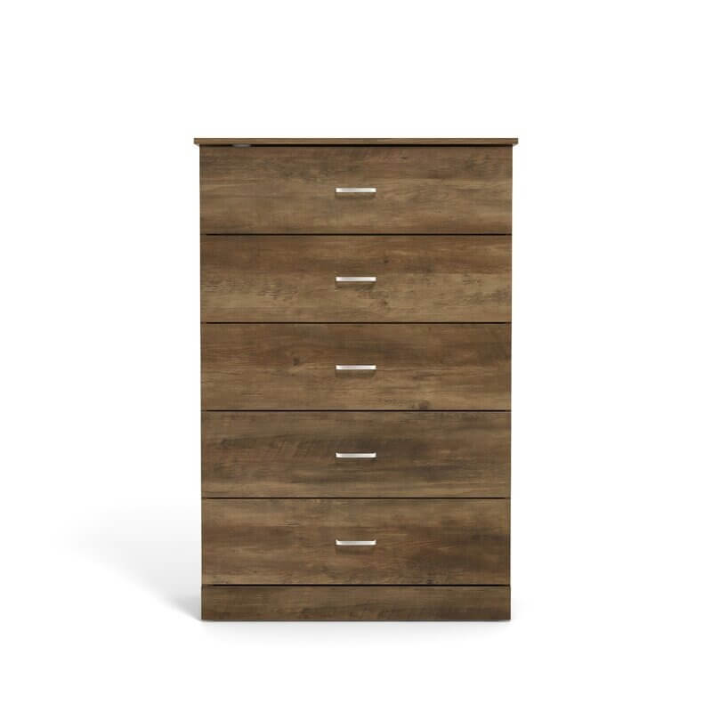 This 5-drawer dresser delivers sleek materials and a clean-lined look. Ultra-fast assembly method eases your assembly time. It's built from engineered wood with a neutral finish, and it features a streamlined rectangular design. The five stacked drawers provide a place for everything from sweaters to denim, and its top surface easily holds a couple of decoration items. Plastic drawer pulls and a barely-there plinth base round out the modern look. Plus, a wall anchor is included for added safety.
