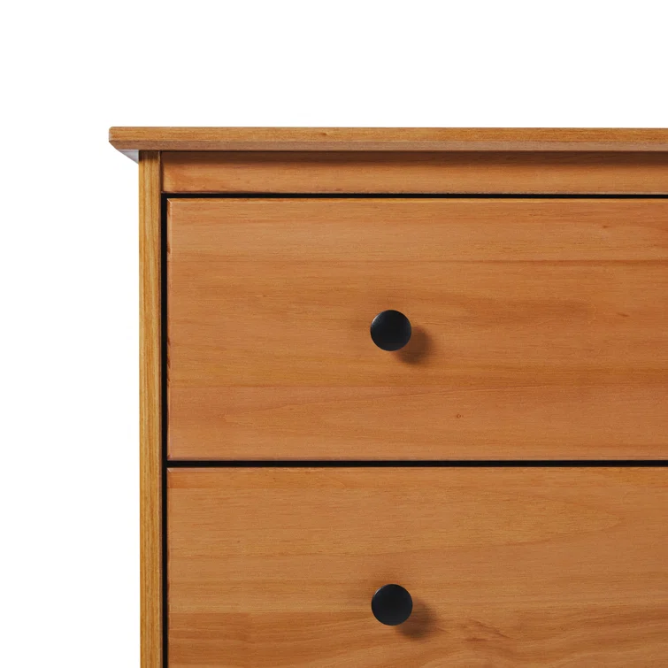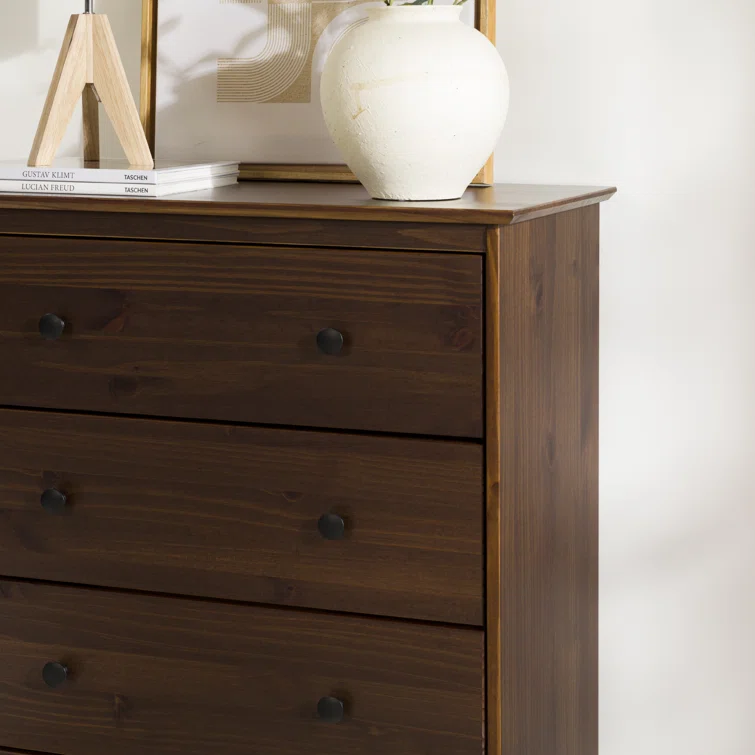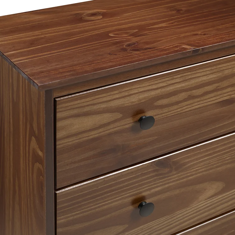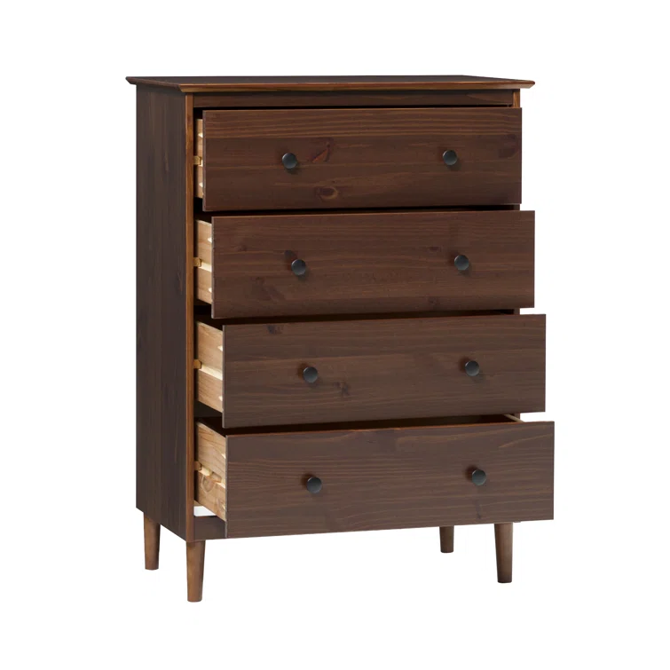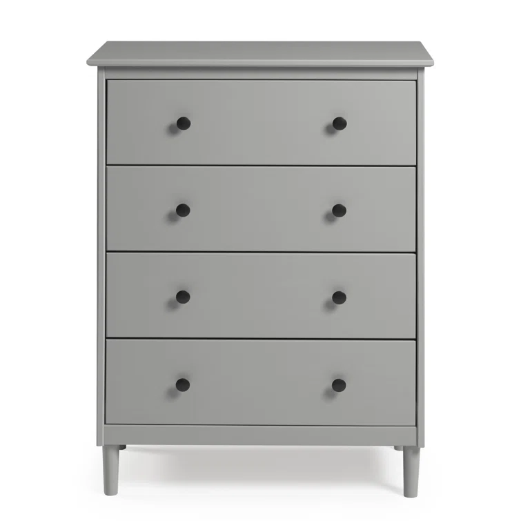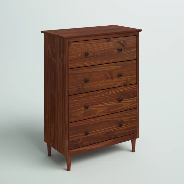 This 4-drawer chest rounds out your bedroom with its mid-century modern design and traditional style. The boxy frame is crafted from solid pine and engineered wood with a rustic and weathered finish, and it rests on tapered dowel legs. The four drawers with black metal handles give you lots of room to organize your wardrobe, linens, and delicates. And safety stops on the drawers keep fingers from getting pinched. This dresser has a finished back, so it's ready to be placed just about anywhere. A wall anchor is included for extra stability.