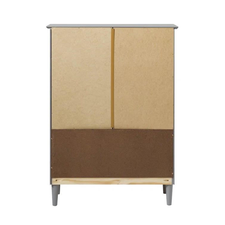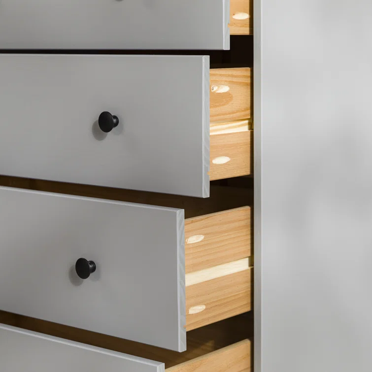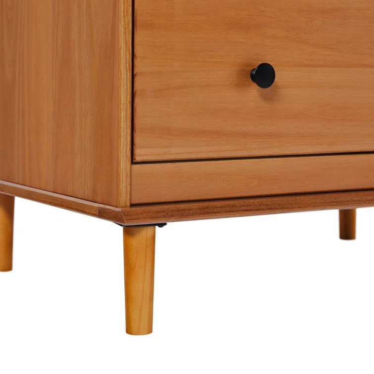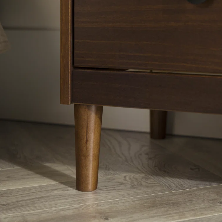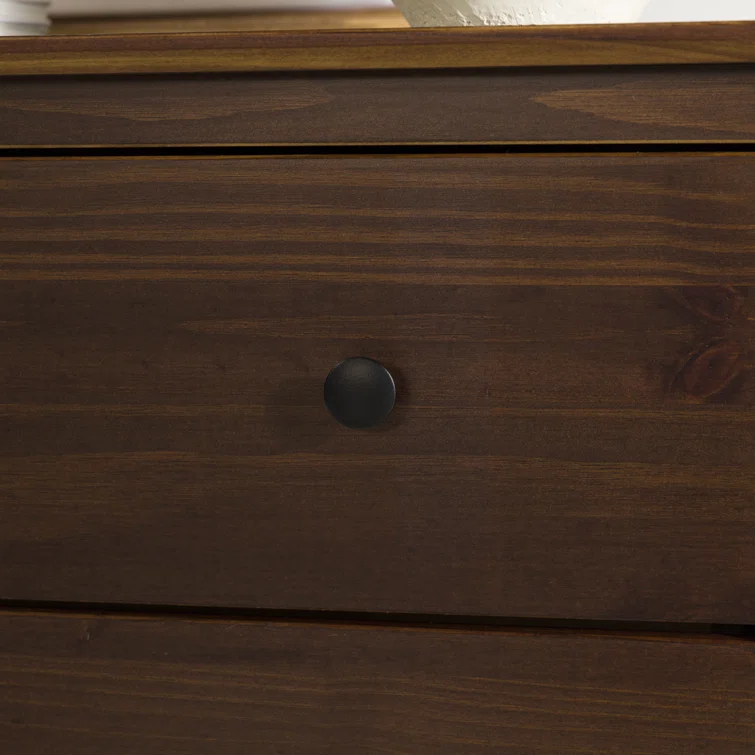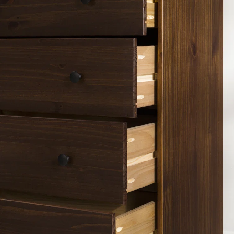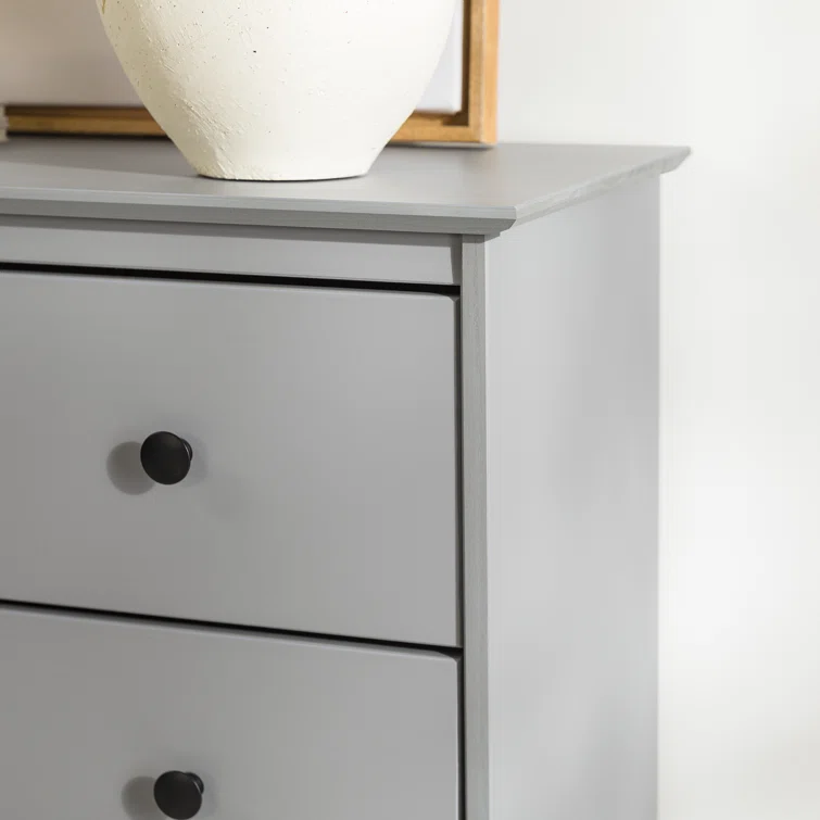 This 4-drawer chest rounds out your bedroom with its mid-century modern design and traditional style. The boxy frame is crafted from solid pine and engineered wood with a rustic and weathered finish, and it rests on tapered dowel legs. The four drawers with black metal handles give you lots of room to organize your wardrobe, linens, and delicates. And safety stops on the drawers keep fingers from getting pinched. This dresser has a finished back, so it's ready to be placed just about anywhere. A wall anchor is included for extra stability.
