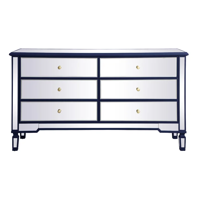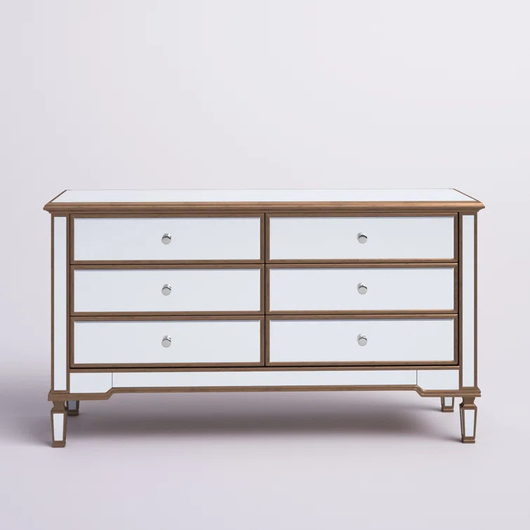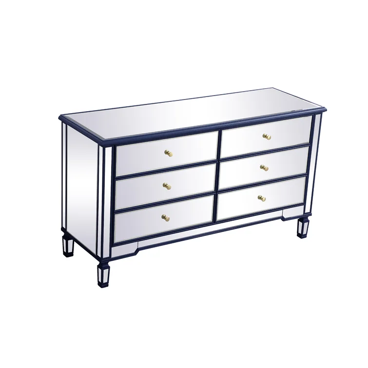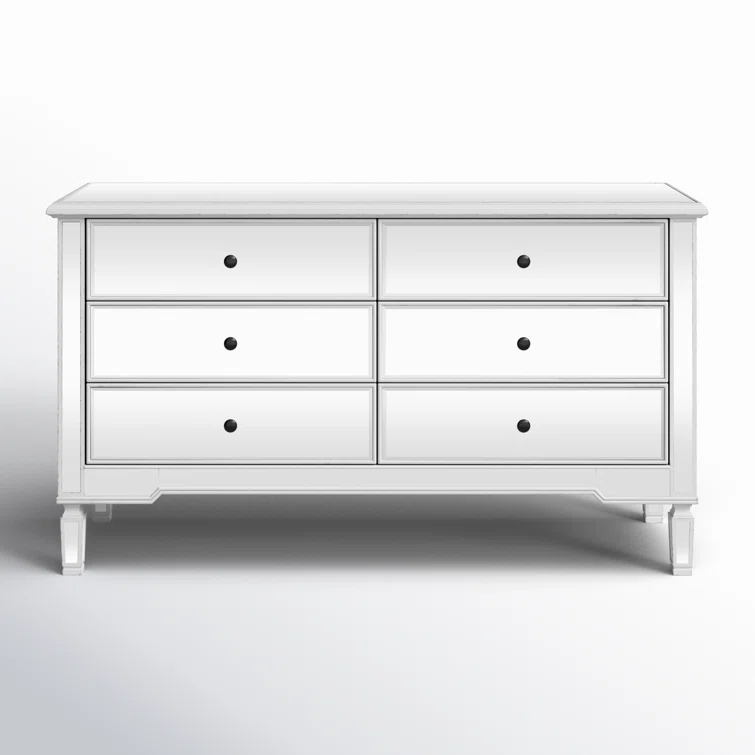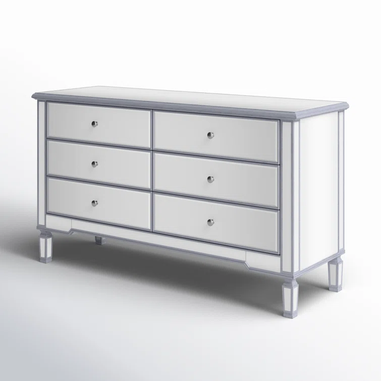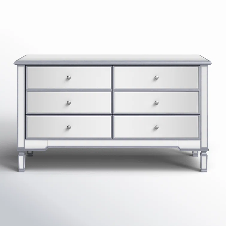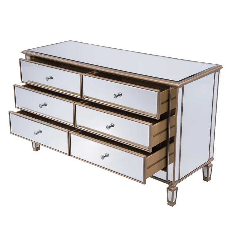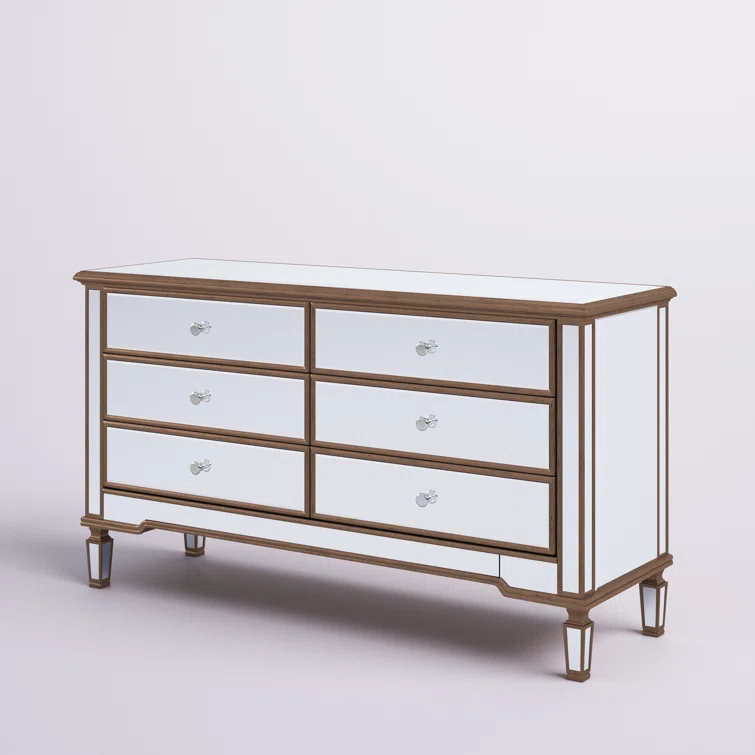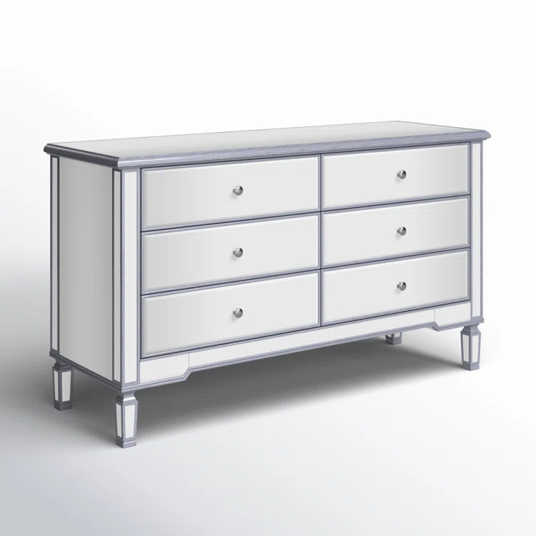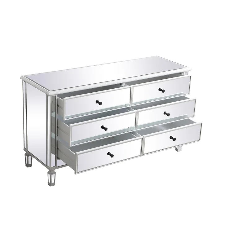 This 6-drawer dresser makes a glam statement in your bedroom while also adding essential storage space. It has a solid and engineered wood frame that rests on four tapered legs. Plus, it features a hand-rubbed antiqued finish with mirrored panels on all sides to scatter light throughout your room for a wide-open feel. Six drawers with silver handles provide a place for your entire wardrobe, while the top leaves room to show off framed family photos or artful accents. A wall anchor is also included for added safety.