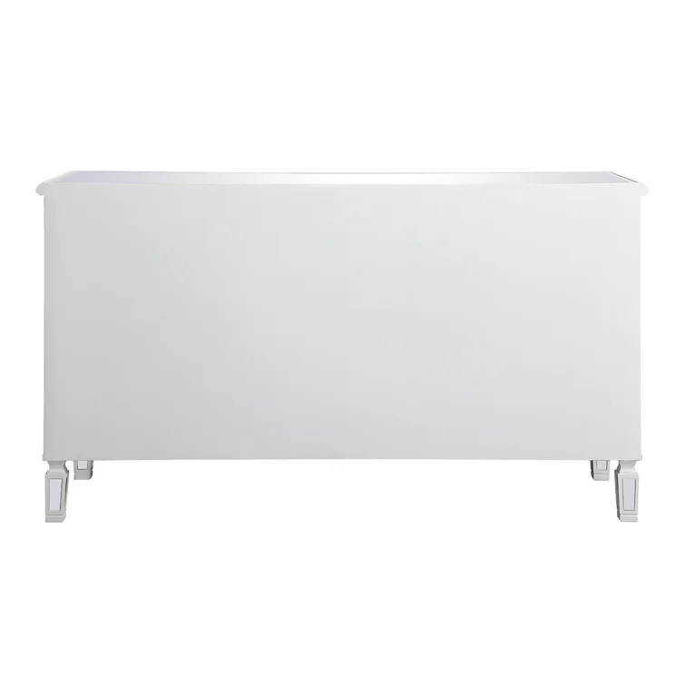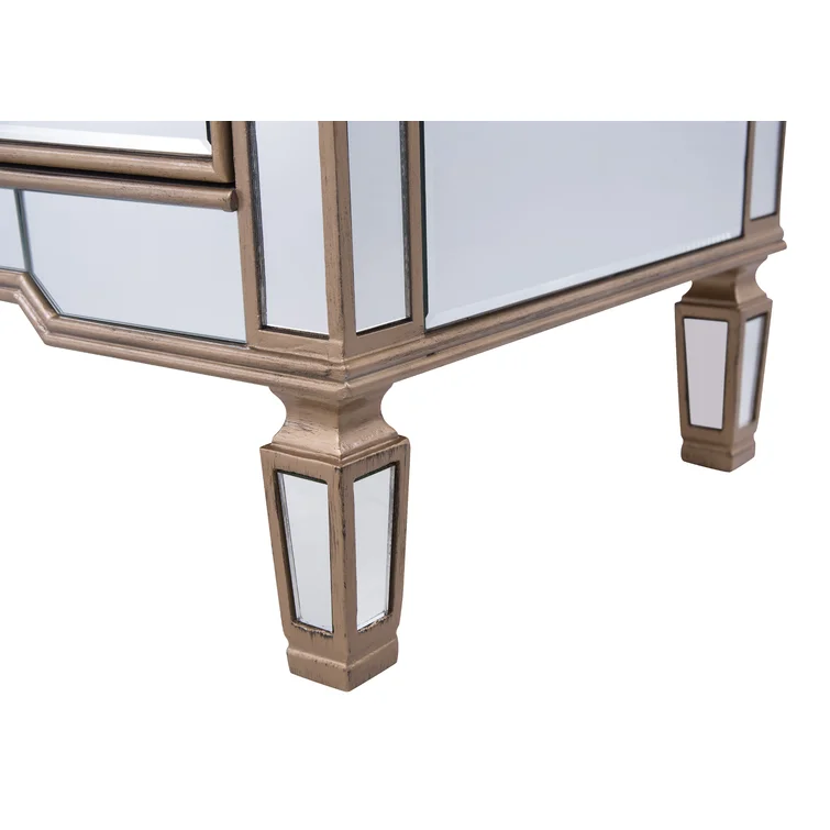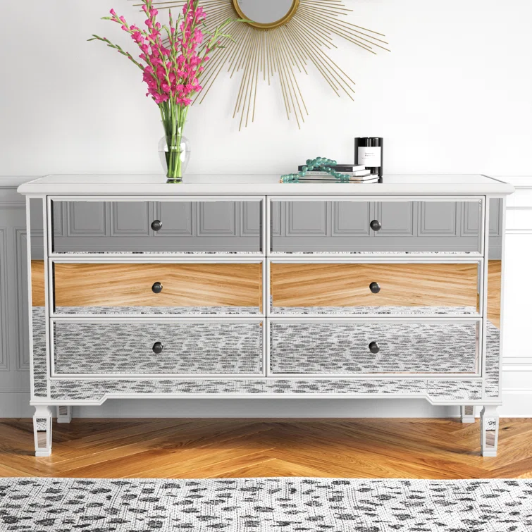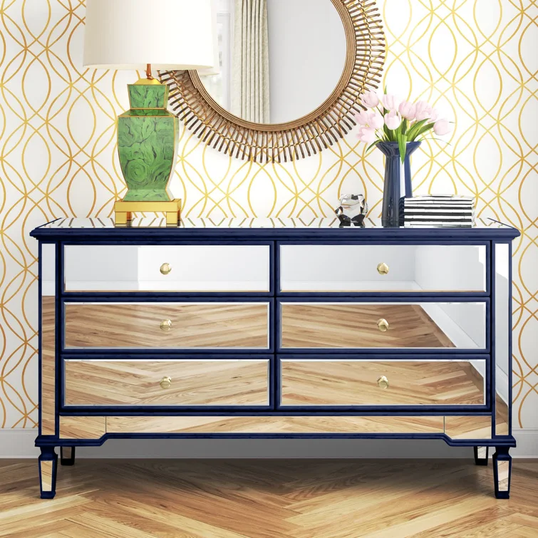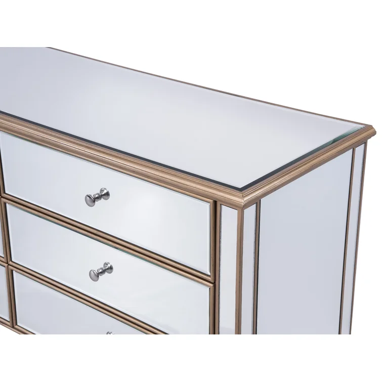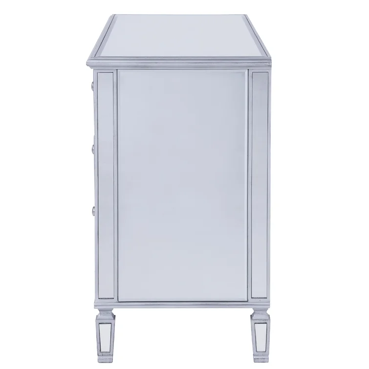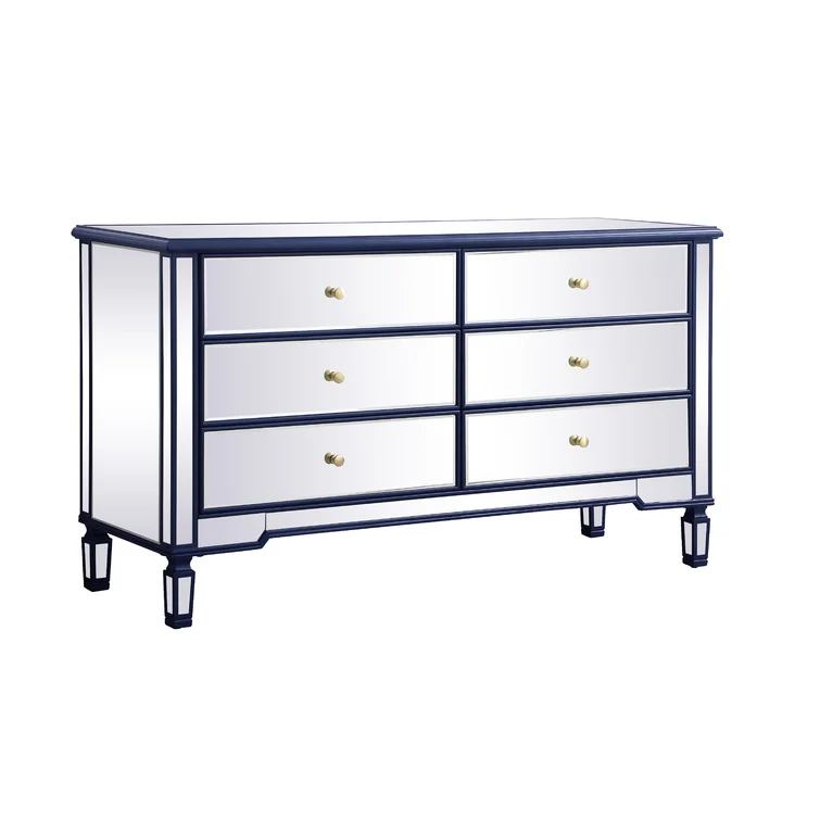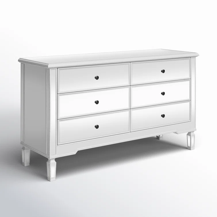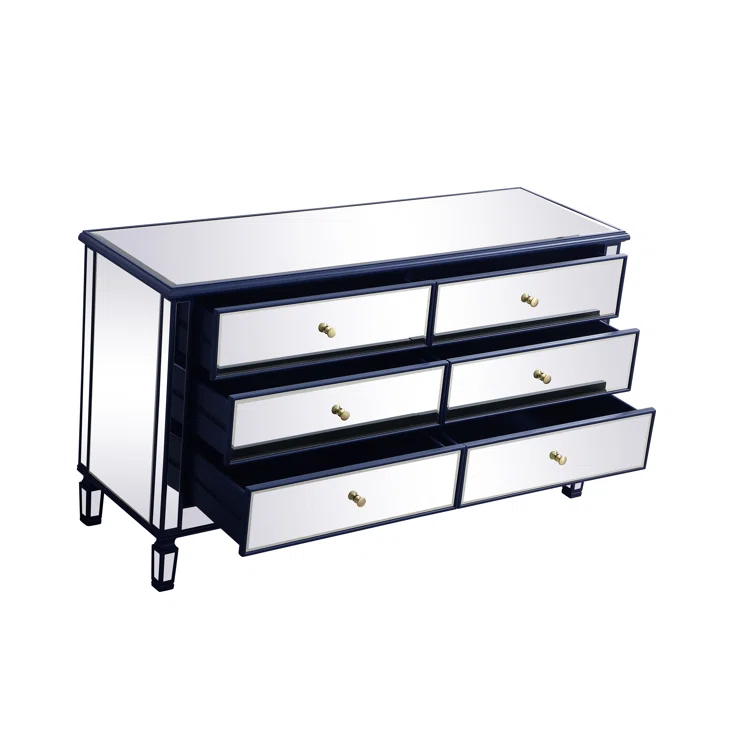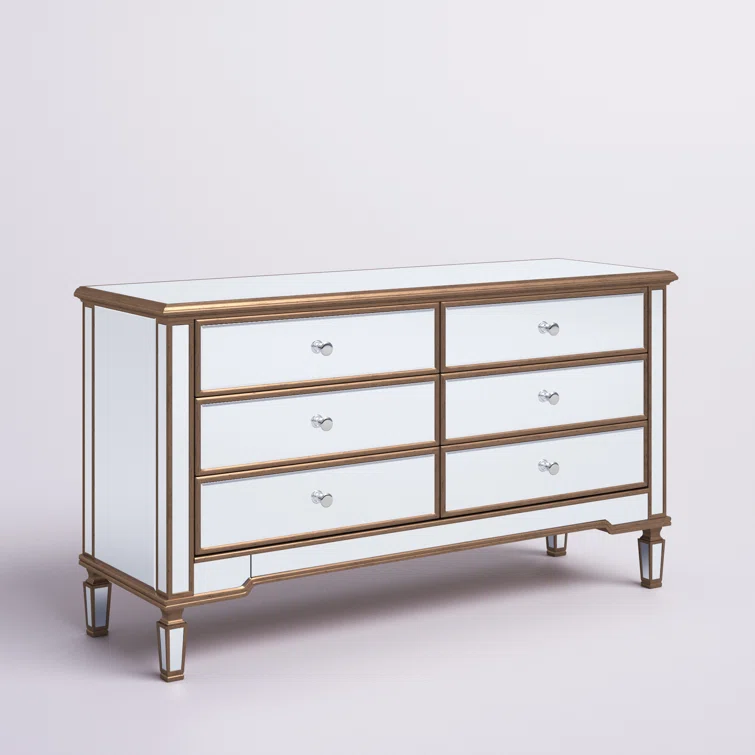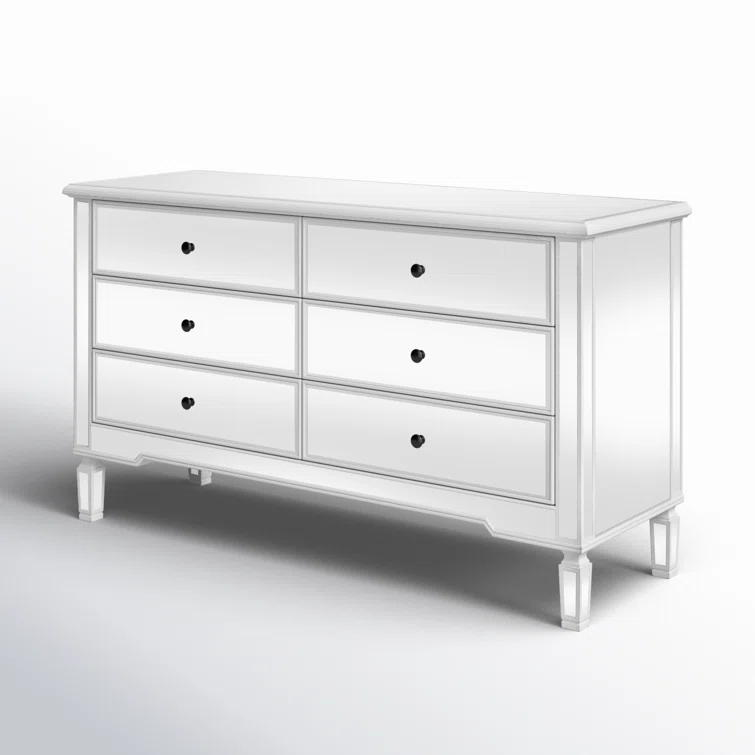 This 6-drawer dresser makes a glam statement in your bedroom while also adding essential storage space. It has a solid and engineered wood frame that rests on four tapered legs. Plus, it features a hand-rubbed antiqued finish with mirrored panels on all sides to scatter light throughout your room for a wide-open feel. Six drawers with silver handles provide a place for your entire wardrobe, while the top leaves room to show off framed family photos or artful accents. A wall anchor is also included for added safety.