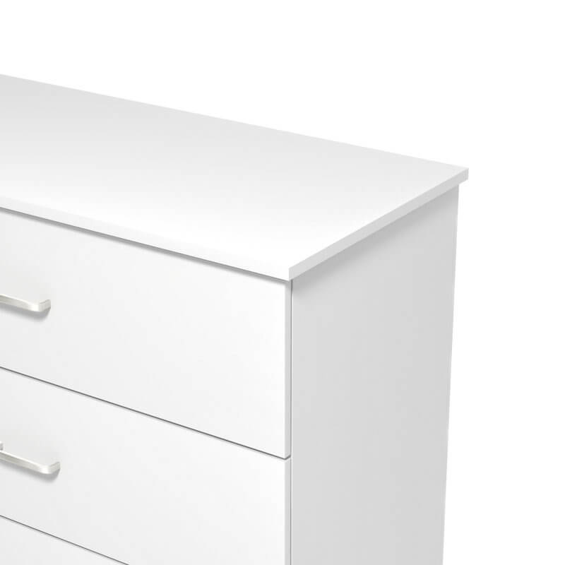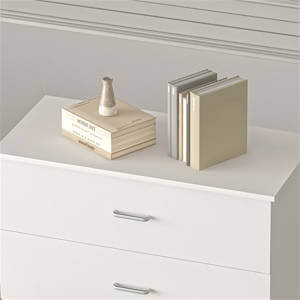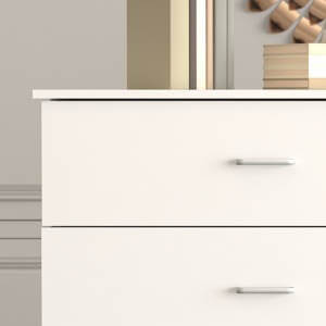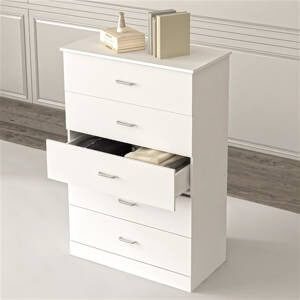 This 5-drawer dresser delivers sleek materials and a clean-lined look. Ultra-fast assembly method eases your assembly time. It's built from engineered wood with a neutral finish, and it features a streamlined rectangular design. The five stacked drawers provide a place for everything from sweaters to denim, and its top surface easily holds a couple of decoration items. Plastic drawer pulls and a barely-there plinth base round out the modern look. Plus, a wall anchor is included for added safety.