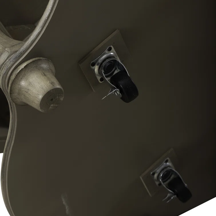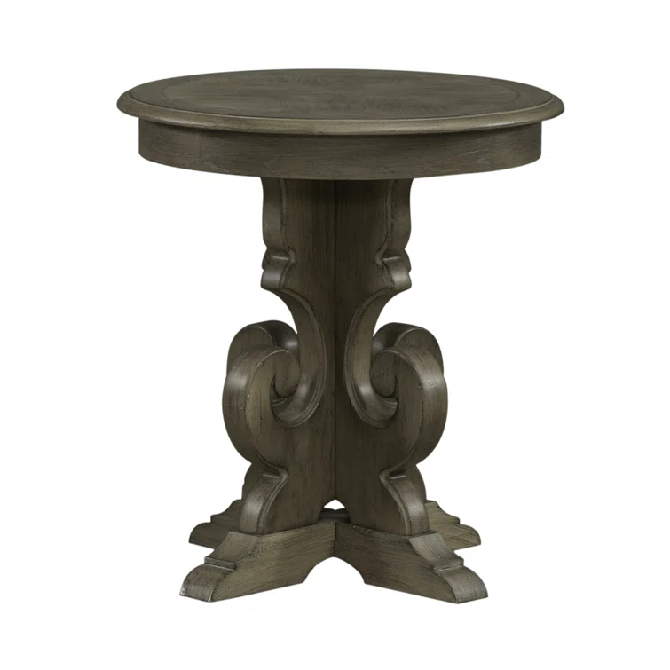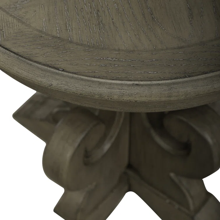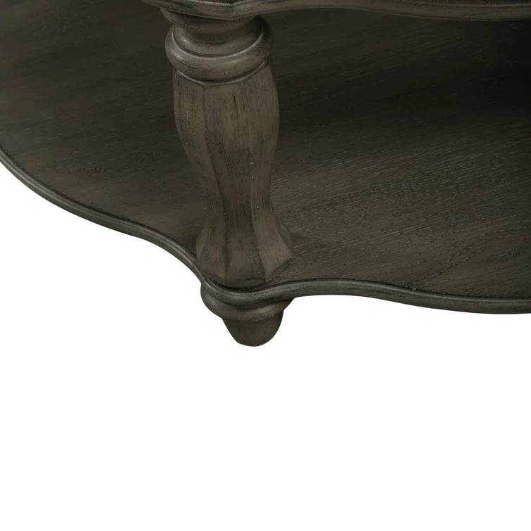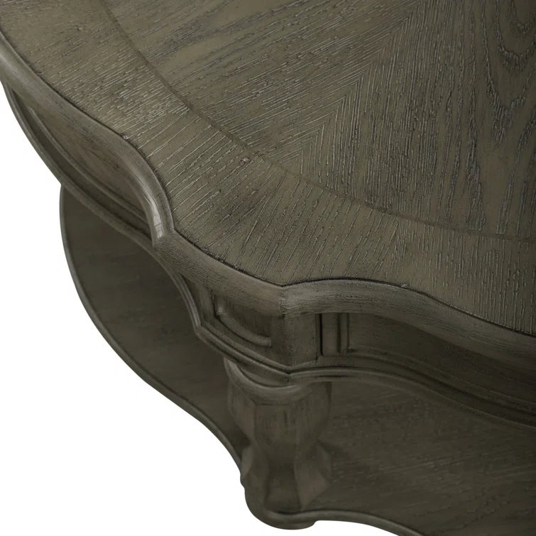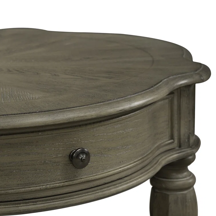 Magnolia Manor is the perfect blend of European design. Crafted with Poplar solids with Split and Quartered White Oak veneers, this set features a Weathered Bisque finish. The unique clover shaped cocktail table has faceted turned legs, one interior storage drawer accented with Antique Pewter knob hardware, a fancy face veneer top, and a bottom shelf for additional storage. The cocktail table features casters that make rearranging effortless. The round End table features a fancy face veneer top and a scrolled pedestal base for a unique design element. The Magnolia Manor optional three piece set includes one round cocktail table and two round end tables and will be enjoyed for generations to come.