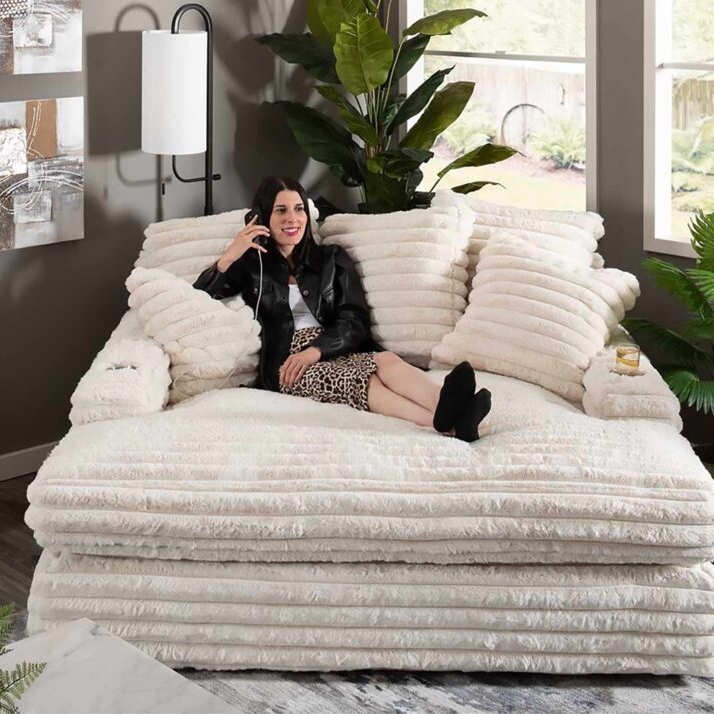 Our chaise lounge is the perfect addition to your living room for ultimate relaxation. Its ultra-dense, soft luxurious feel is made with wide, super soft corduroy fabric that is both durable and stylish. The chaise lounge has a lofty appearance and is accompanied by three back pillows and two down filled toss pillows for added comfort. With two USB ports, you can conveniently charge your electronic devices while lounging. And with two cupholders, you can easily enjoy your favorite beverage without having to get up. Whether you are watching a movie or reading a book, our Chaise Lounge is the perfect spot to unwind and relax.
