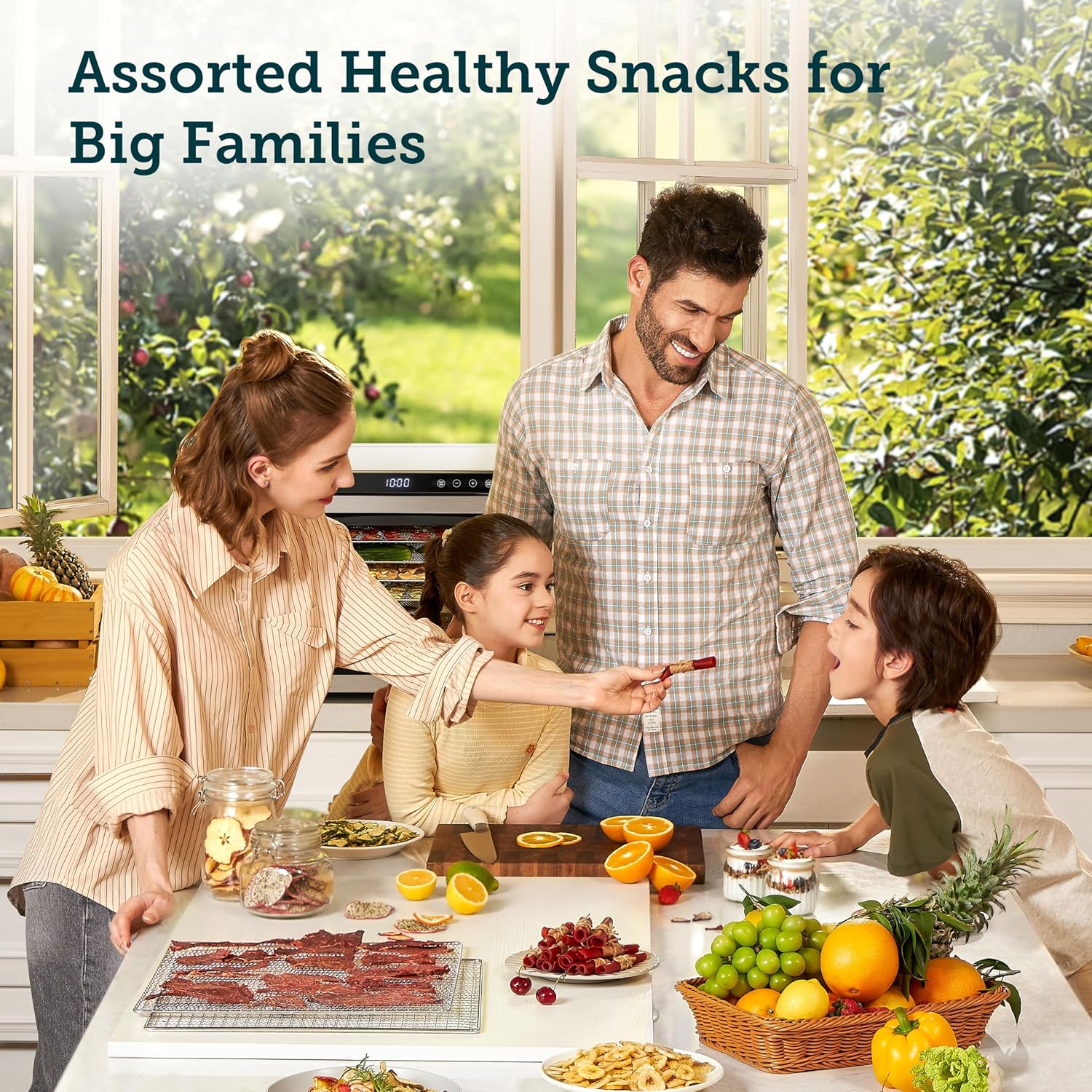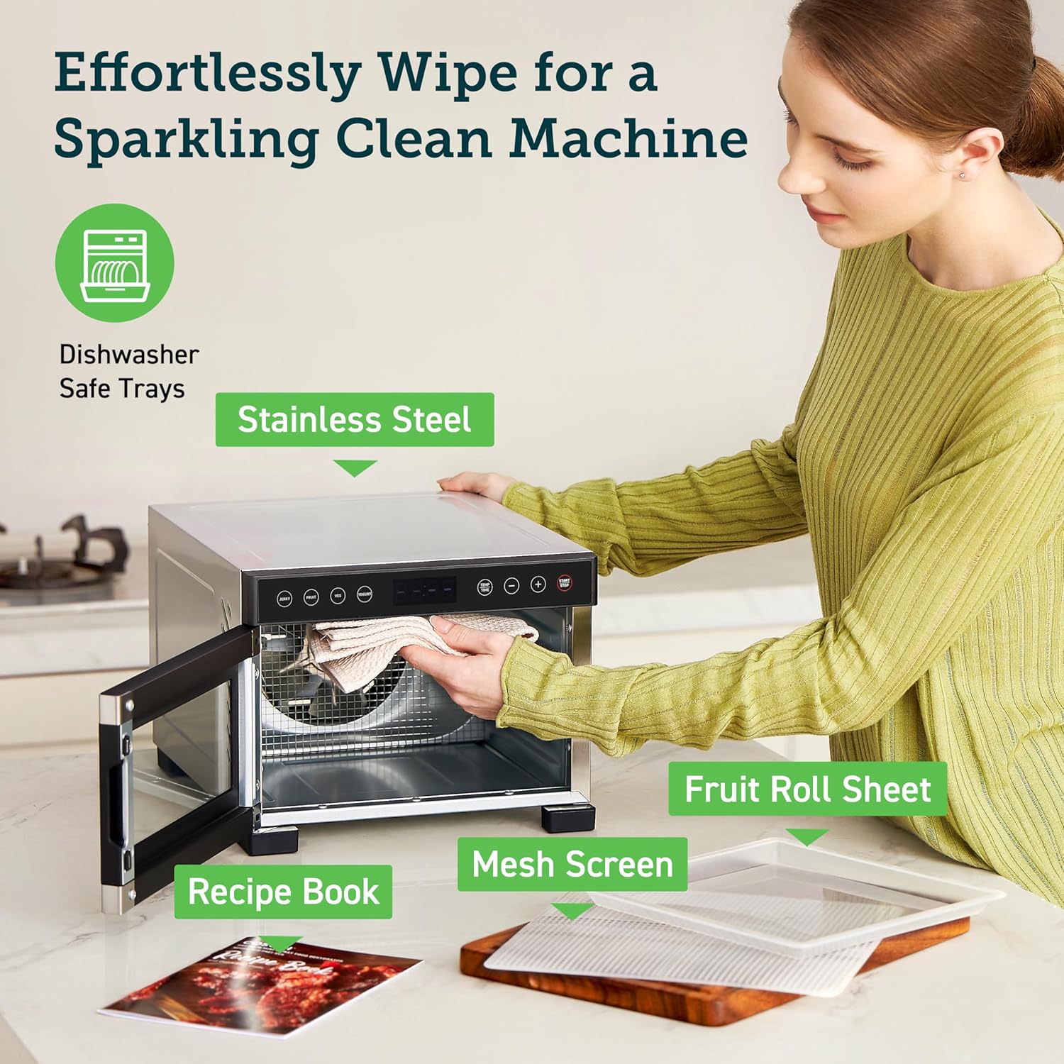 - 𝗖𝗨𝗦𝗧𝗢𝗠 𝗣𝗥𝗘𝗦𝗘𝗧𝗦: Enjoy 4 user-friendly presets (jerky, fruit, vegetables, yogurt) and adjust them to your preferred time and temperature