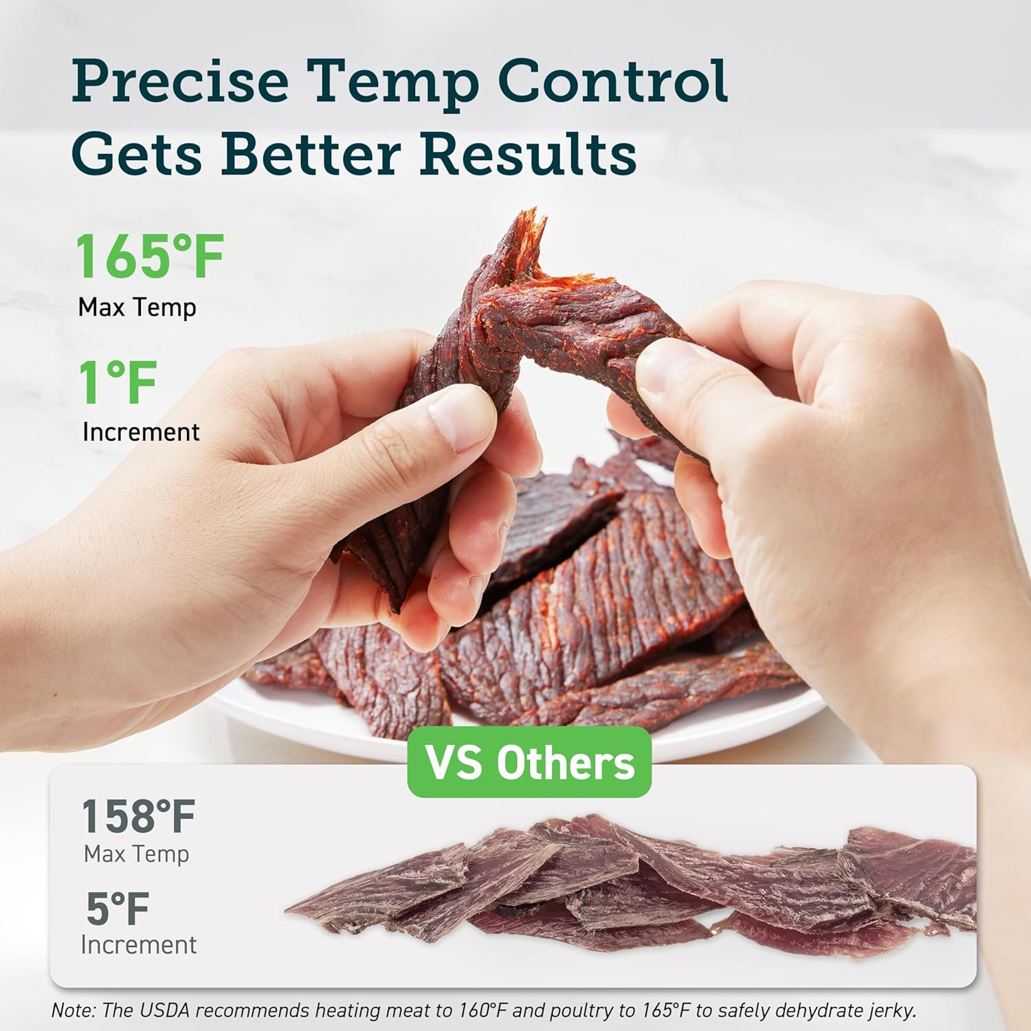 - 𝟭𝟳𝟲 °𝗙 𝗠𝗔𝗫 𝗧𝗘𝗠𝗣𝗘𝗥𝗔𝗧𝗨𝗥𝗘: Adjust the dehydrator between 95-176°F in 1°F increments. Higher temps ensure safer beef jerky. USDA recommends 165°F for safe jerky