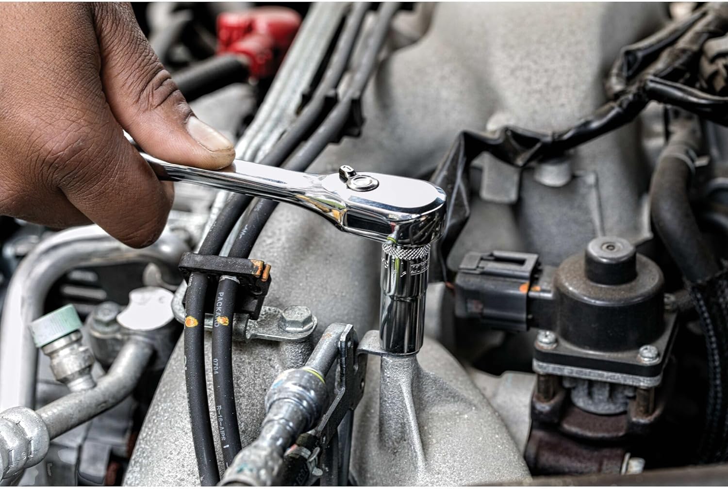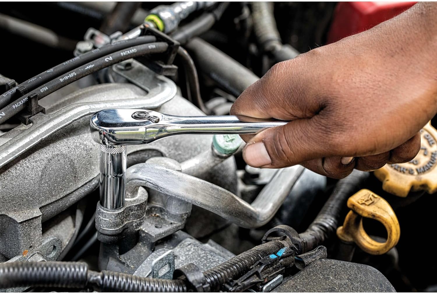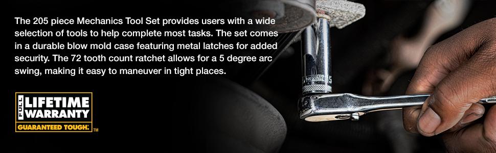 • 205-piece mechanics tool set includes 72-tooth ratchets providing 5 degree arc swing for control in tight spaces.