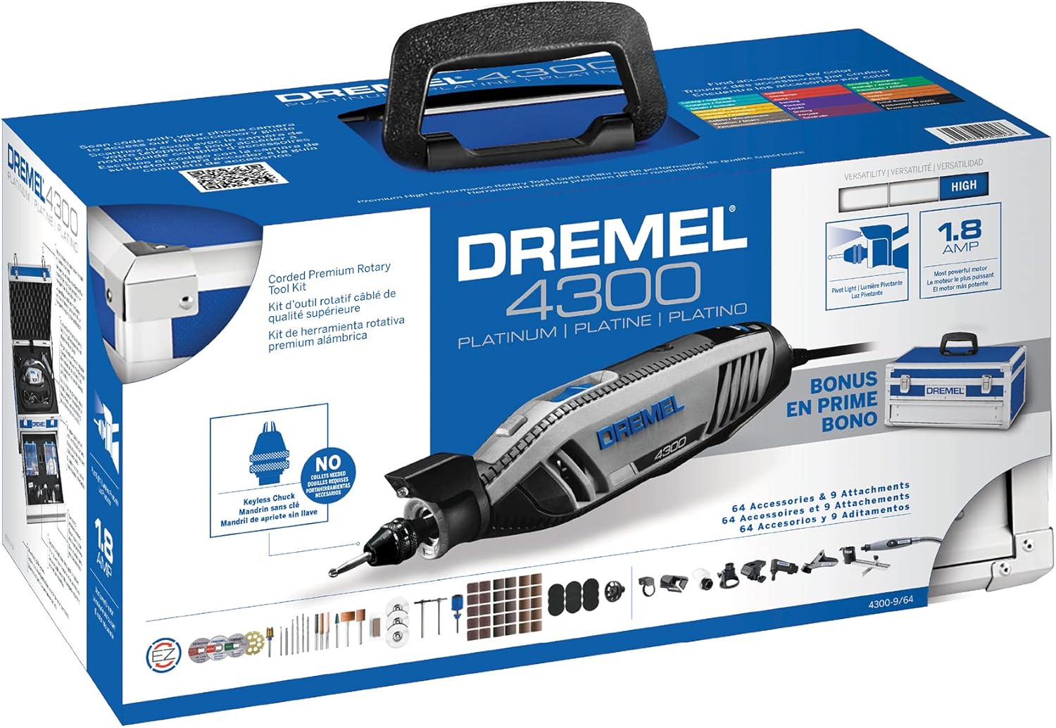 - KIT CONTENTS: Dremel 4300 High Performance Rotary Tool, Attachments(x9), and Rotary Accessories(x64).