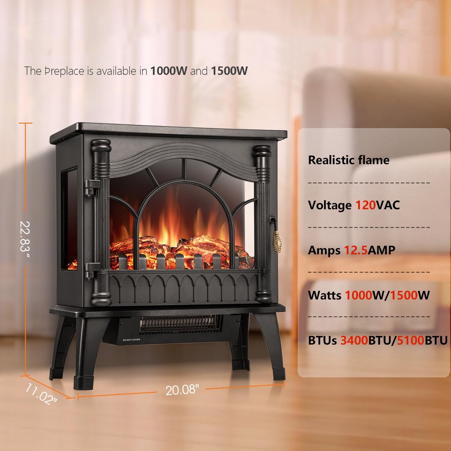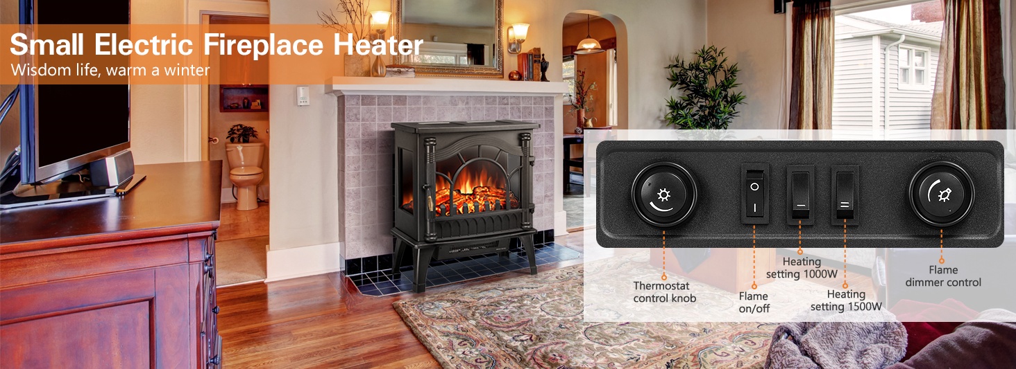 • Electric Fireplace Heater, 20" Freestanding Fireplace Infrared Stove 1000W/1500W, 3D Realistic Flame Effects, Adjustable Brightness and Heating Mode, Overheating Safe Design