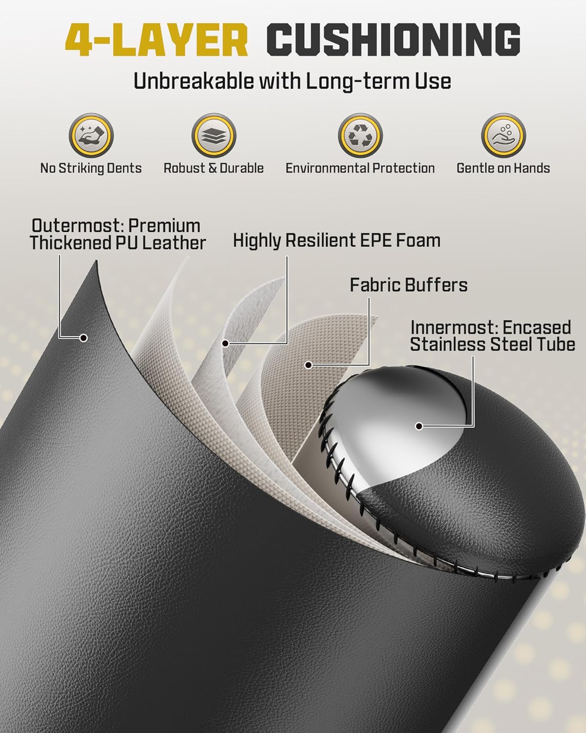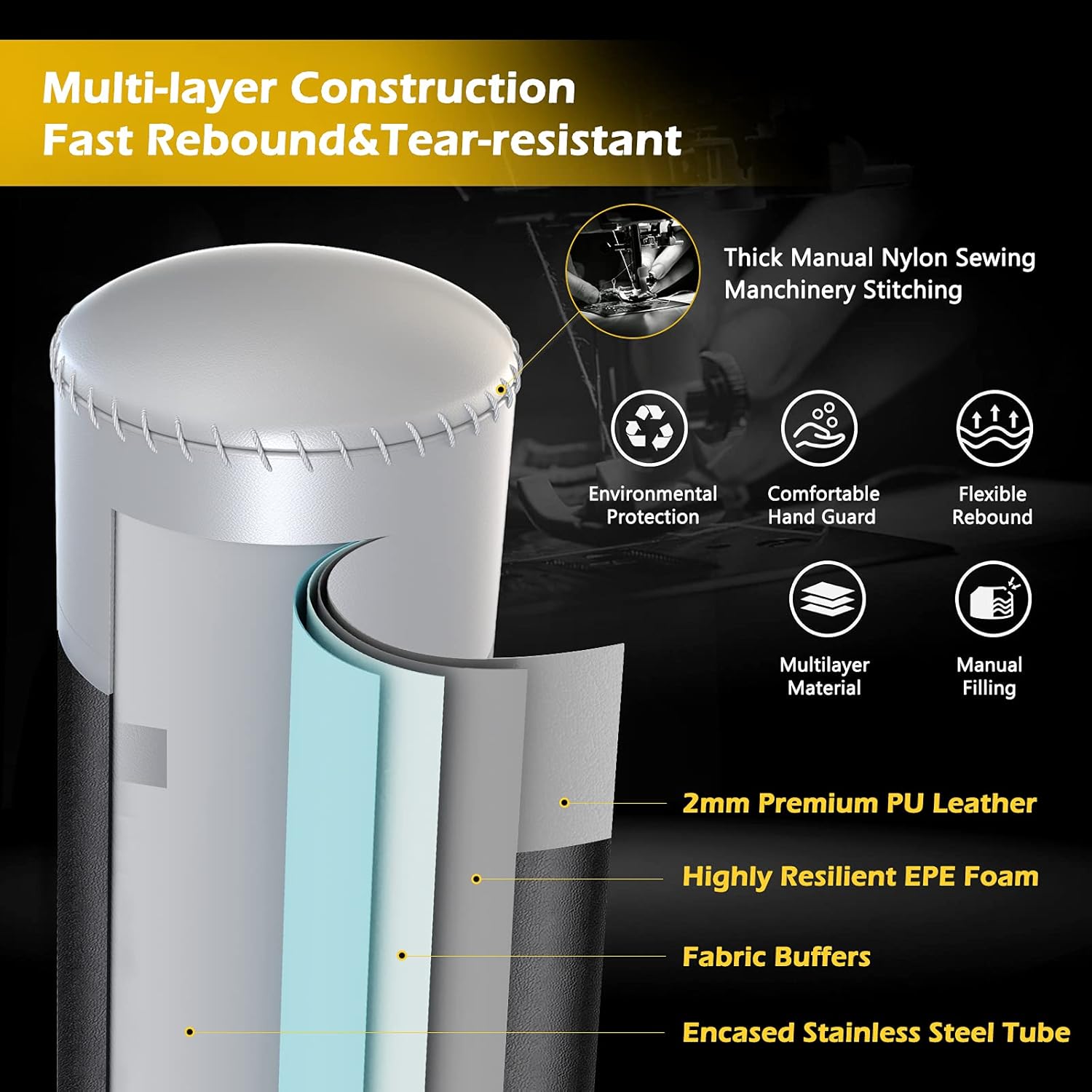 • RELIABLE MATERIALS: Designed with multi-layer construction, each layer has been carefully selected: stainless steel tube, eco-friendly fabric buffer, high-density EPE foam and 2mm premium PU leather. Can withstand prolonged kicks and punches;