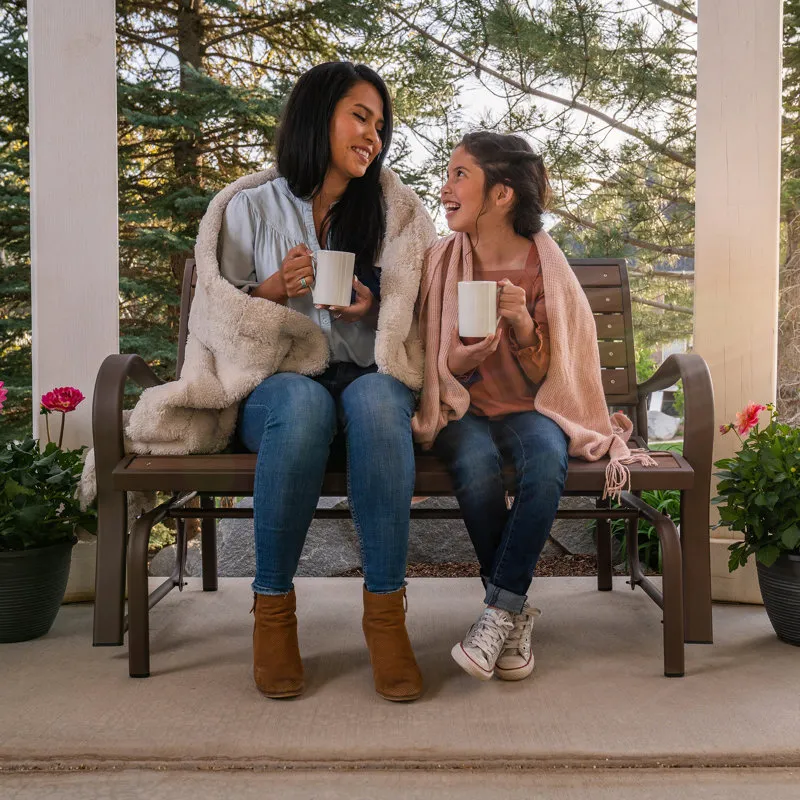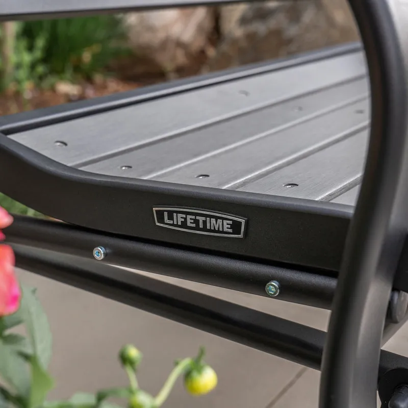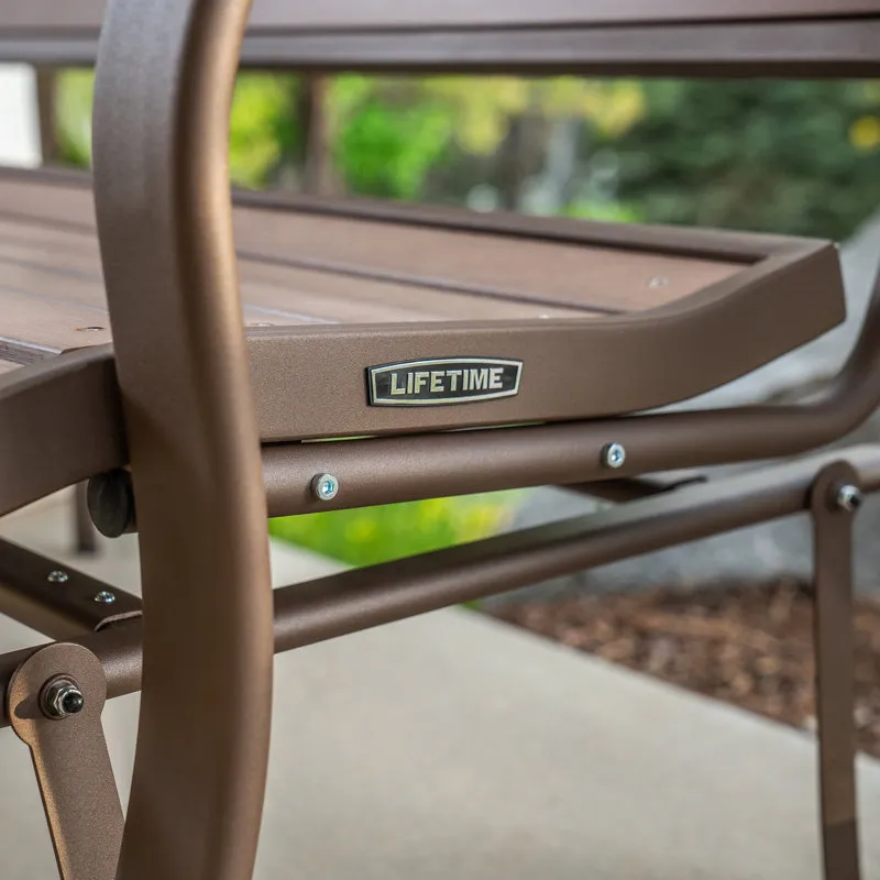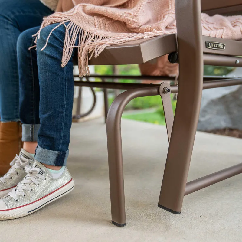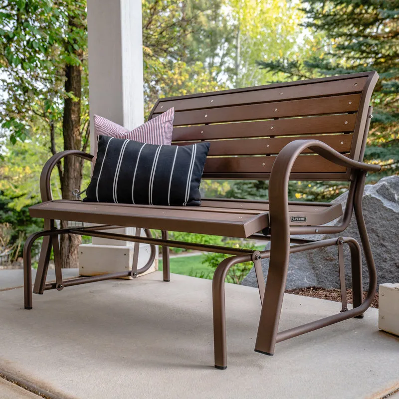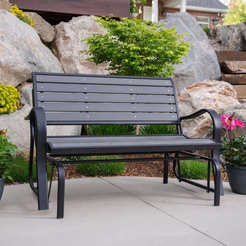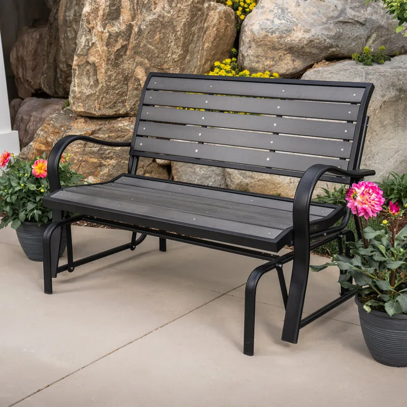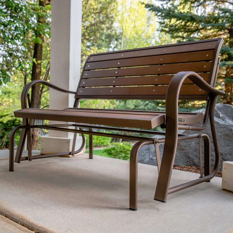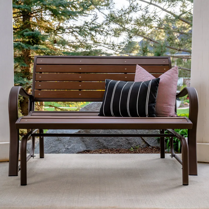 Creating the perfect place to enjoy a nice afternoon, the metal glider bench is the ideal addition to your yard. Constructed of weather-resistant polystyrene simulated wood, the bench is designed to be the perfect size to easily fit on a porch or patio. The metal glider bench is UV-protected and will not fade, crack chip, or peel. Unlike wooden benches, the polystyrene will not splinter and never needs to be painted or varnished. The ball bearings create a smooth, quiet glide, and the 48" steel frame has a powder-coated, rust-resistant finish to ensure that your metal glider bench will last for years.