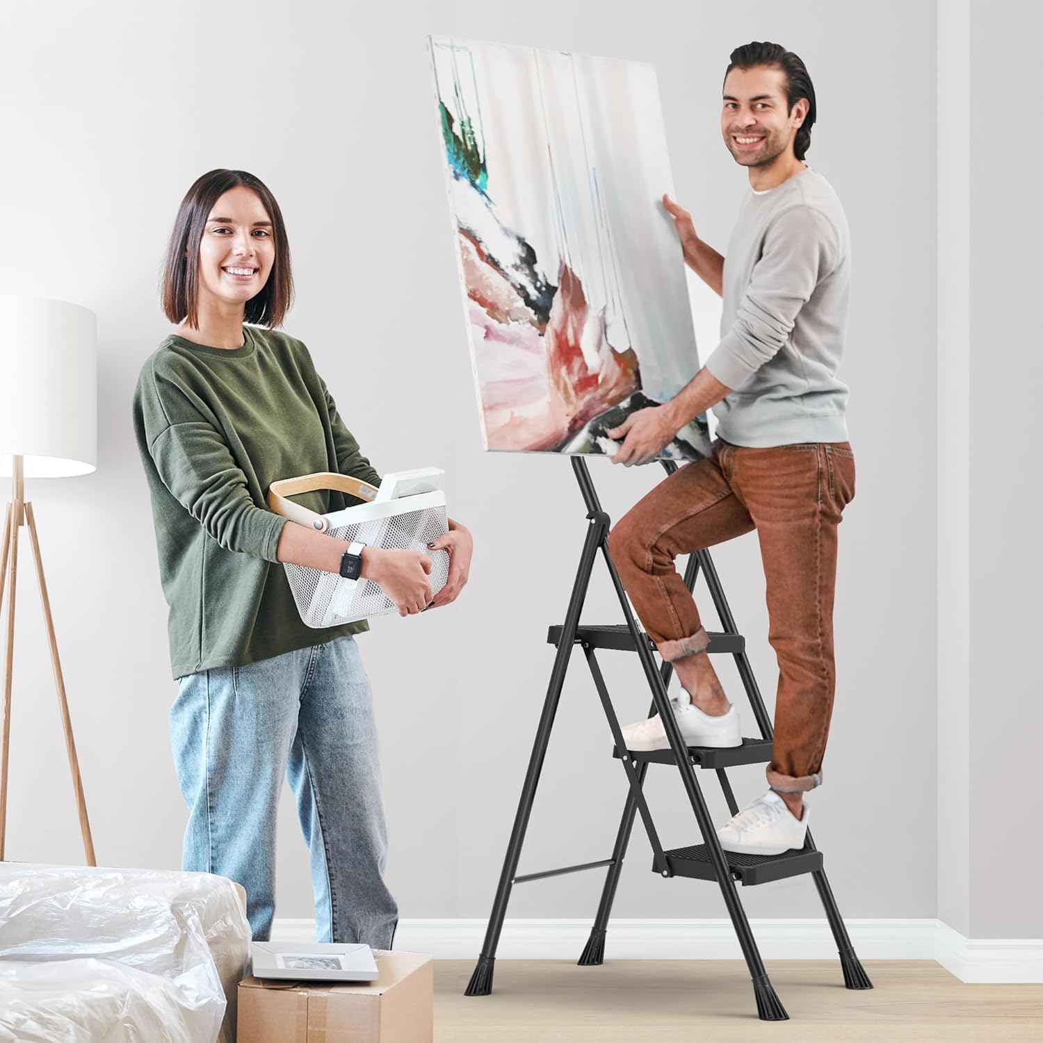 • HBTower 3 Step Ladder, Folding Step Stool with Wide Anti-Slip Pedal, Sturdy Steel Ladder, Convenient Handrail, Lightweight, Portable Steel Step Stool