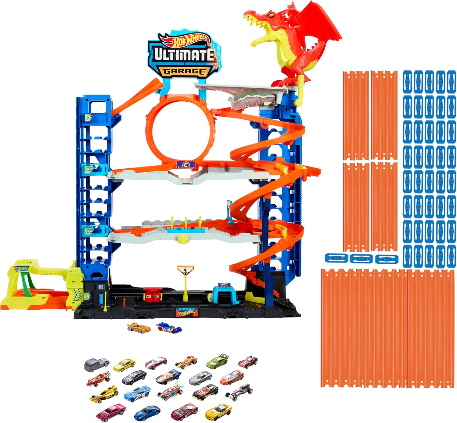 - Race, stunt and do battle with a dragon in the multi-level Hot Wheels City Ultimate Garage.