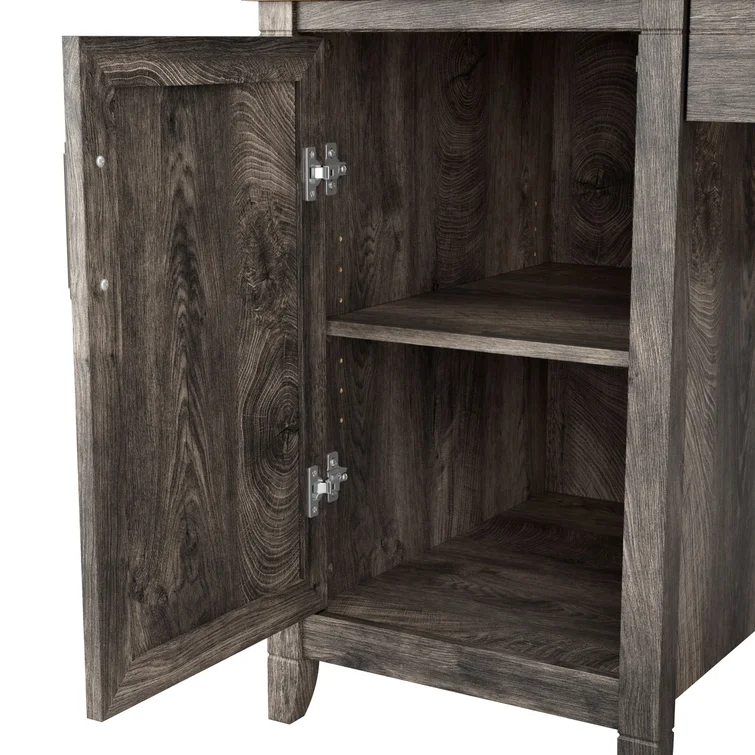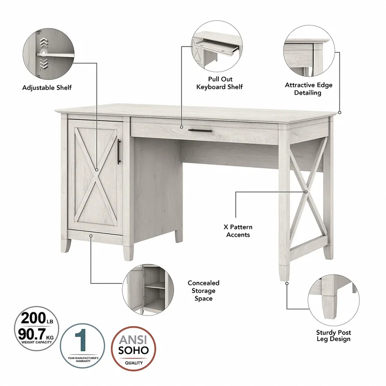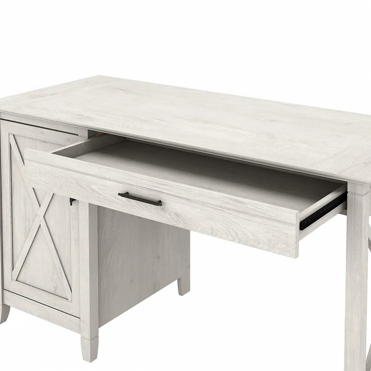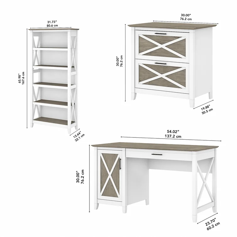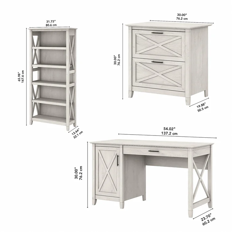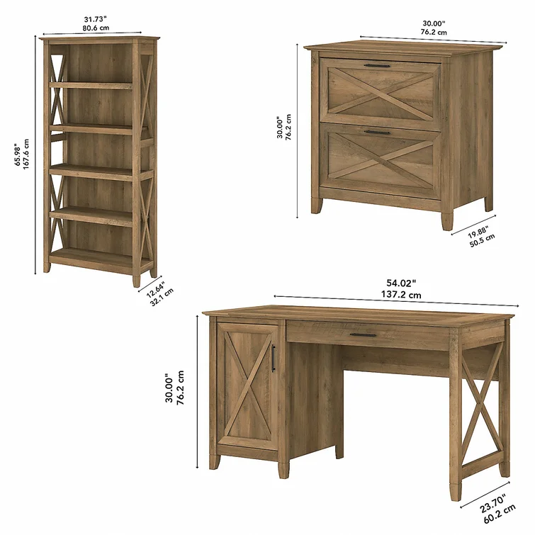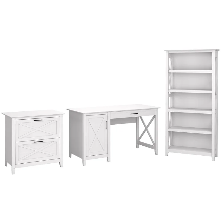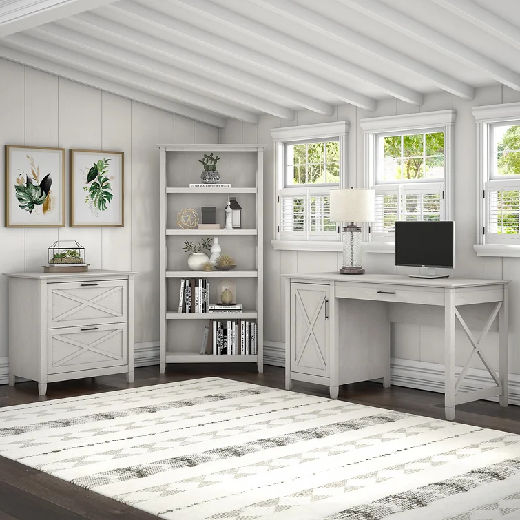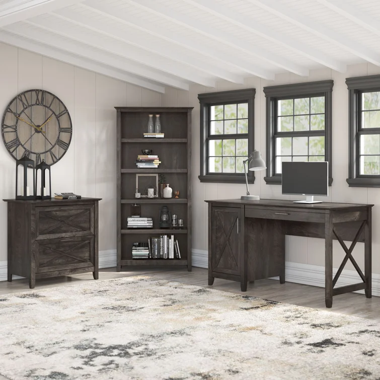 This 3-piece office set instantly creates a functional WFH office with plenty of coastal farmhouse charm. It includes a desk, hutch, bookcase, and file cabinet, all crafted from engineered wood in a natural tone. The desk and filing cabinet feature both have drawers ideal for tucking away notebooks, writing utensils, important folders, and other office essentials. The 5-tier bookshelf provides plenty of space for books, decor, and friendly plants. We love the X accents that complete the country feel of this multi-piece office set.