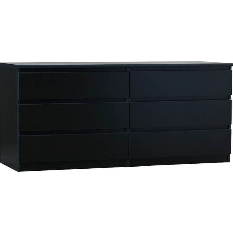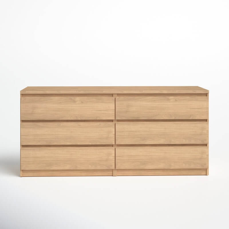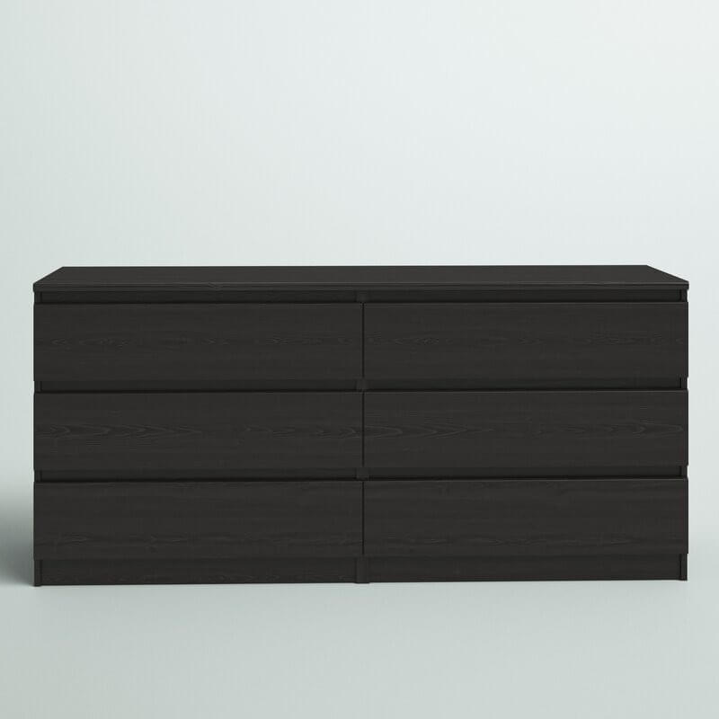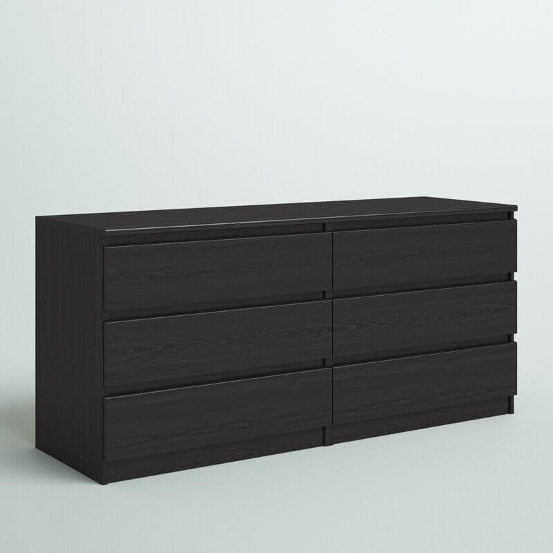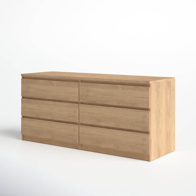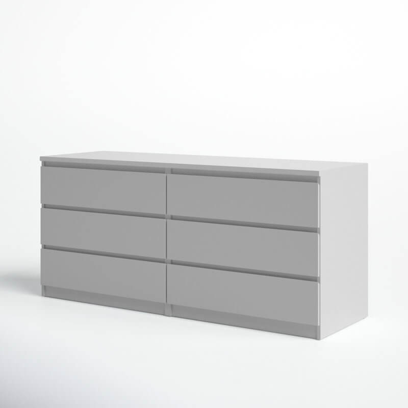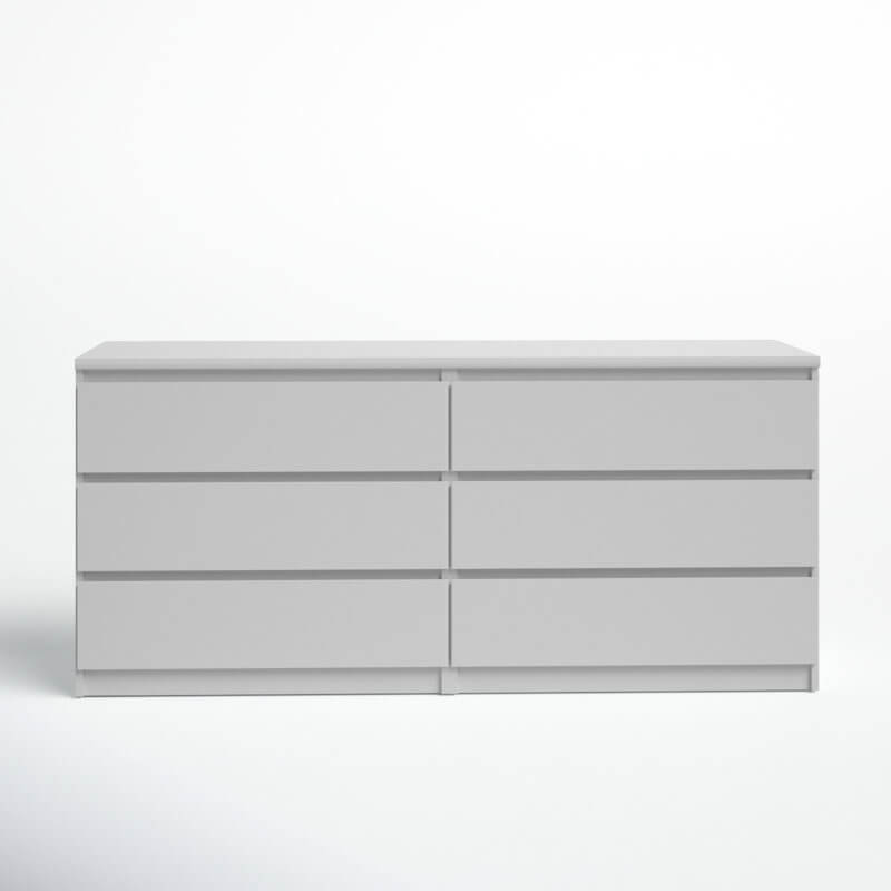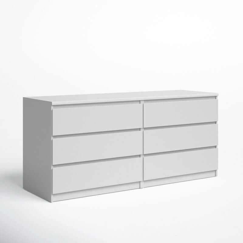 Ideal for understated bedroom arrangements, this 6-drawer double dresser showcases a clean-lined silhouette and neutral, solid finish that blends in with just about any color palette that you dream up. Made from engineered wood, it features six drawers that open smoothly on metal ball-bearing glides, revealing ample space to tuck away spare linens, shirts, pants, and other wardrobe must-haves. The top leaves plenty of room to turn it into a vanity and add a mirror, or display a table lamp and some framed photos.
