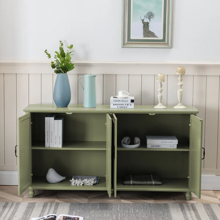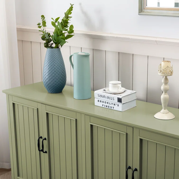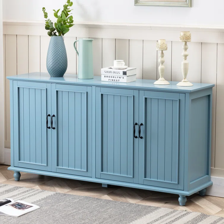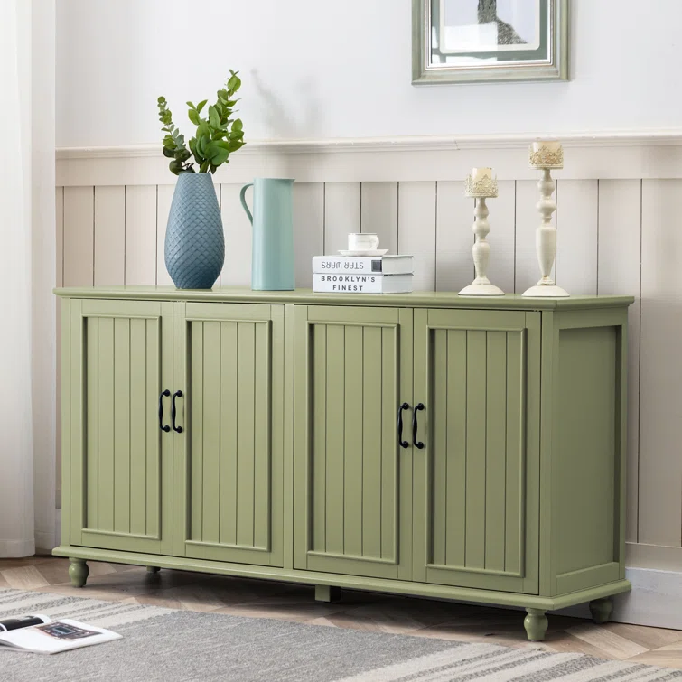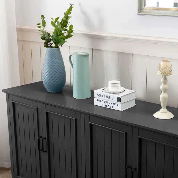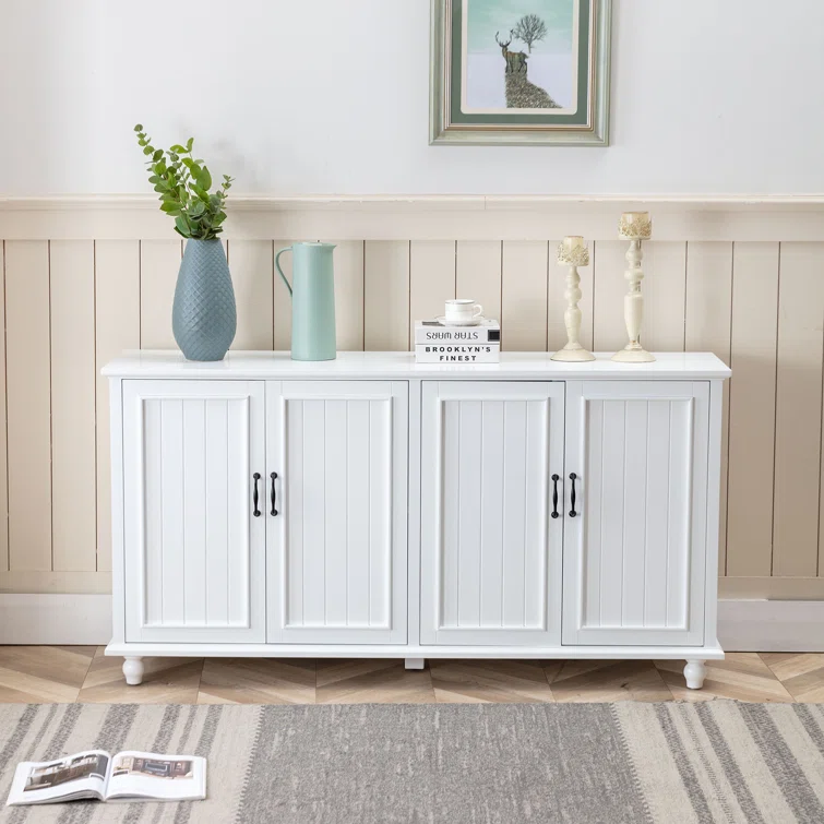 This sideboard set elevates your space with extra storage and a classic look. It's crafted from solid and engineered wood in a breezy white hue with a clean finish. The design features four doors that open to reveal so much space inside for dishes, linens, and more. We love the door fronts with vertical slats and picture frame paneling, turned bun feet, and elegant black hardware that rounds out the aesthetic. Arrange it in your hallway or dining room and use the top to show off flowers and favorite decor.