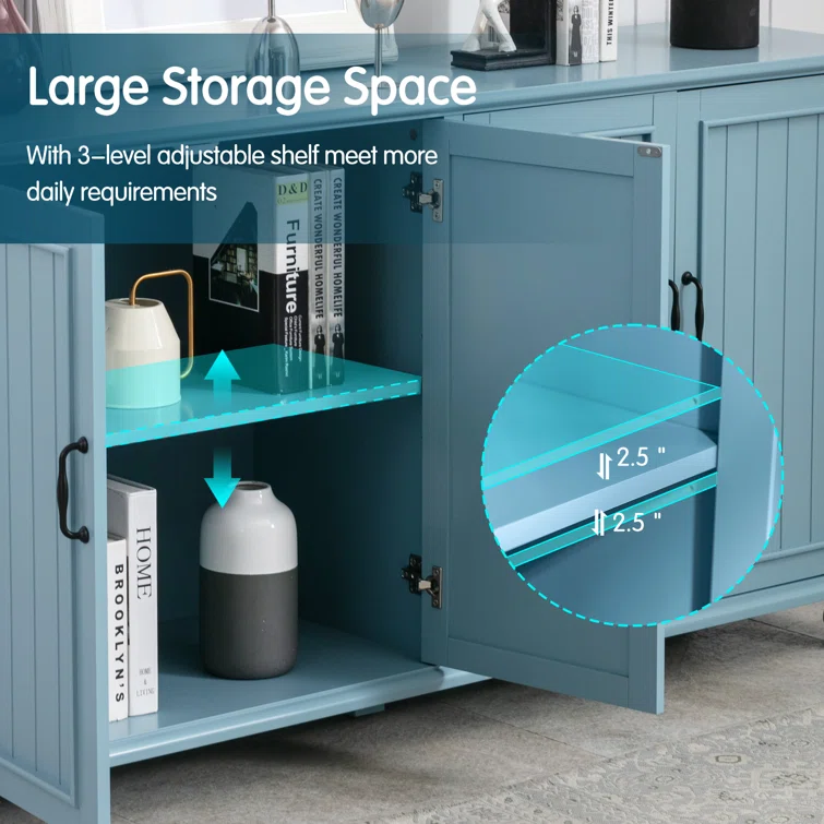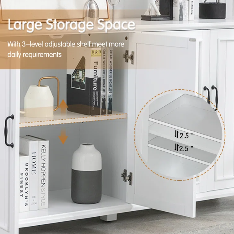 - The buffet sideboard can be adjusted at three different height positions, and they can be removed as well. In that case, this cabinet can accommodate many items of different sizes.