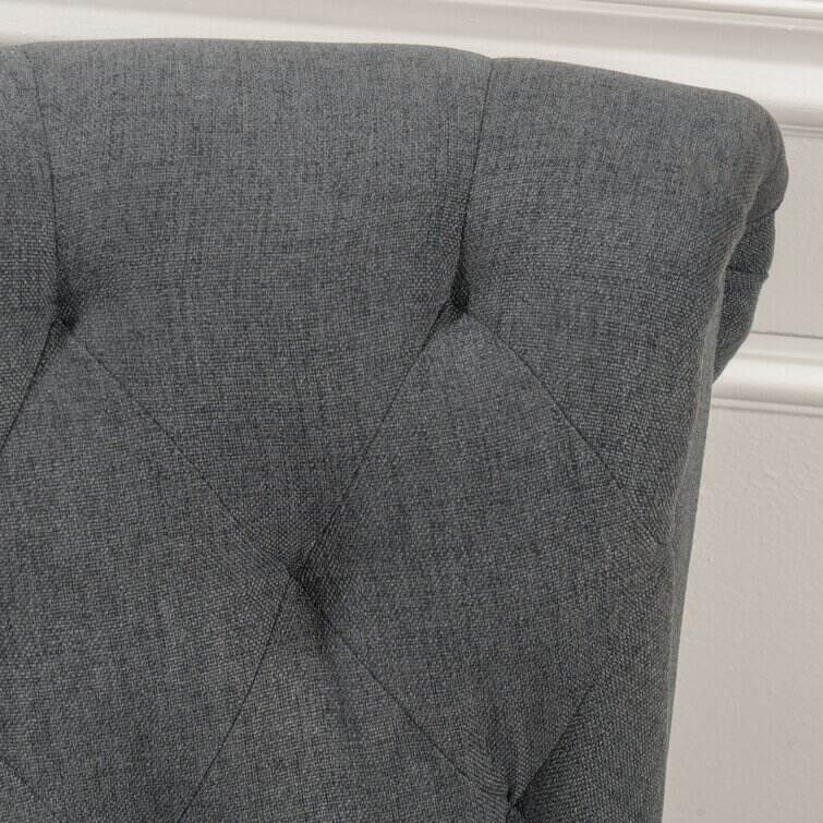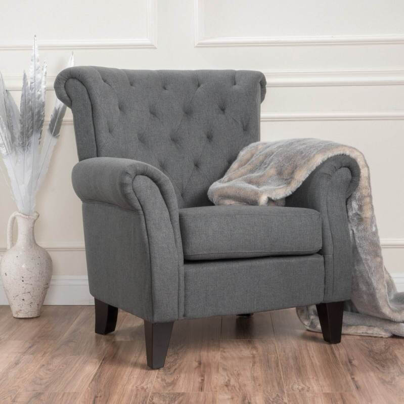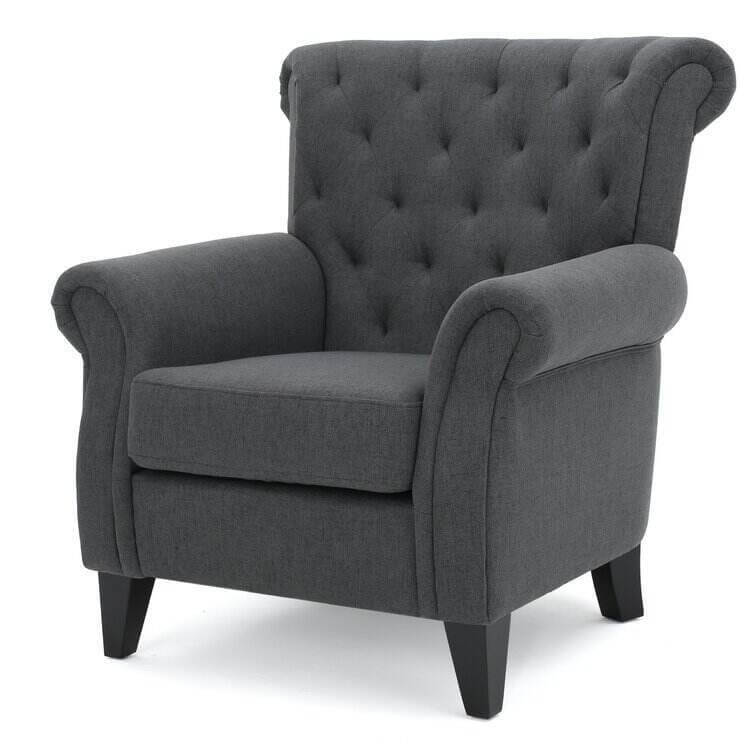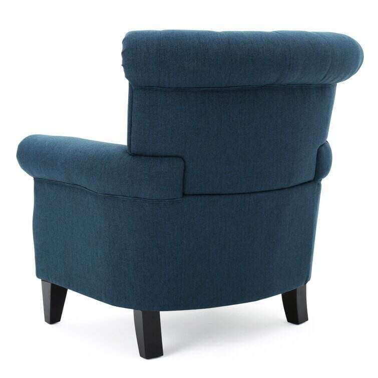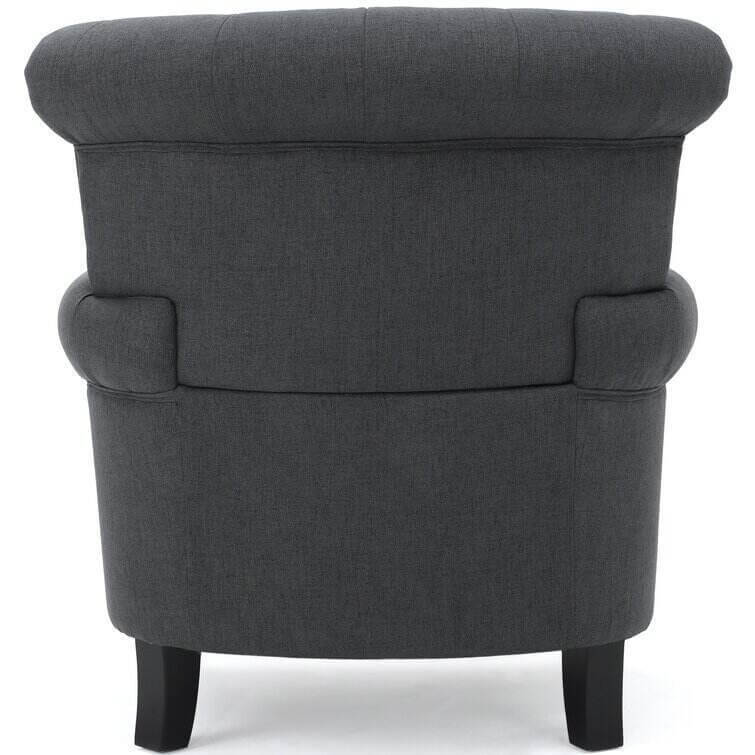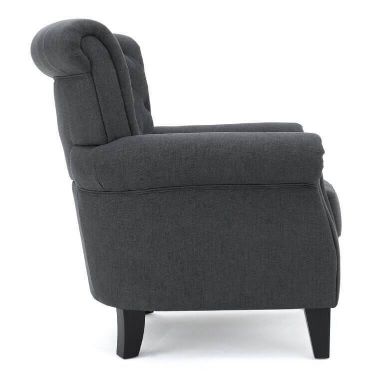 Make a timeless and stylish addition to your living room in the form of this beautiful club chair. Featuring soft, smooth upholstery and cozy cushioning, this contemporary chair is incredibly inviting. Fine accents like tapered wood legs, button-accented diamond tufting, and nailhead trim promise a detailed look. Tied together by a sleek silhouette, a rolled back, and coordinating armrests, this modern chair is practical and pretty. Design a quaint little reading and conversation nook, or use this chair in your living room for added seating.