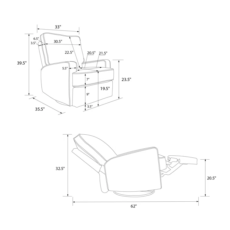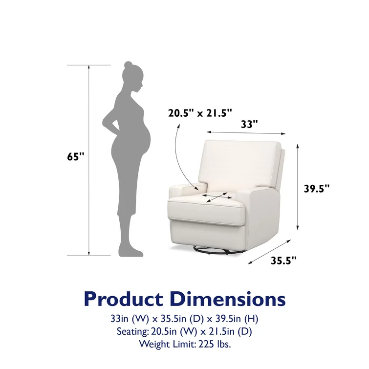 Recliner Dimensions: 35.5"L x 32.5"W x 39.5"H. Weight limit: 250 lbs. Net weight: 81.5 lbs. 1-year limited warranty. Rigorously tested to meet safety standards and flammability requirements. Does not contain flame-retardant chemicals. TSCA Certified for formaldehyde.