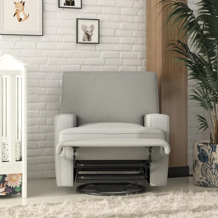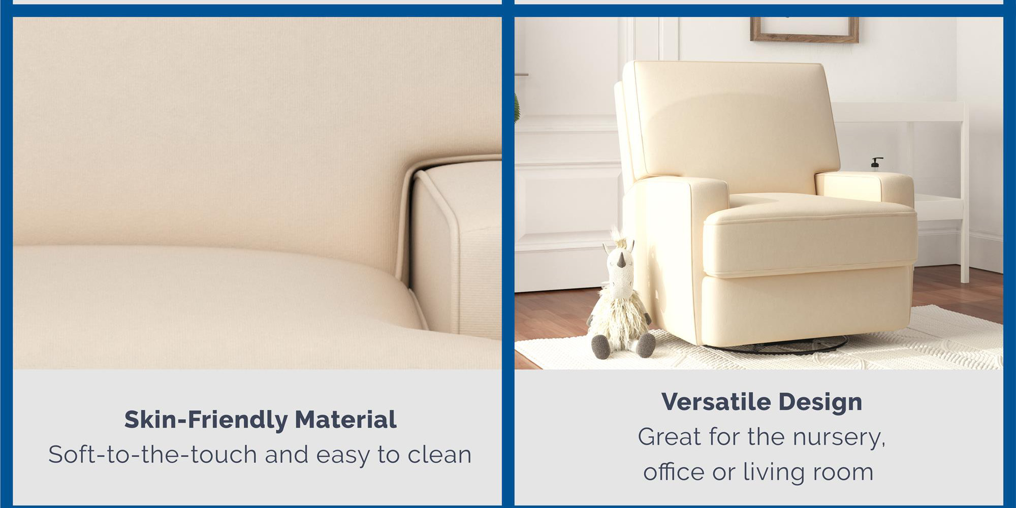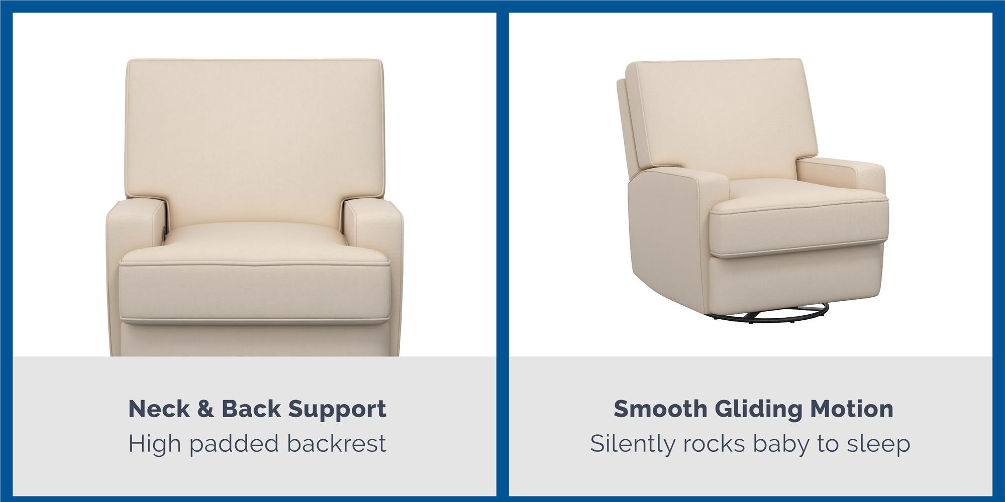 - Transitional nursery style with a smooth-edged square shape, our modern upholstered 4-in-1 swivel glider rocker recliner gives your infant simply the best sleep experience with rhythmic rocking, gliding, reclining, and 360-degree swivel chair moves.