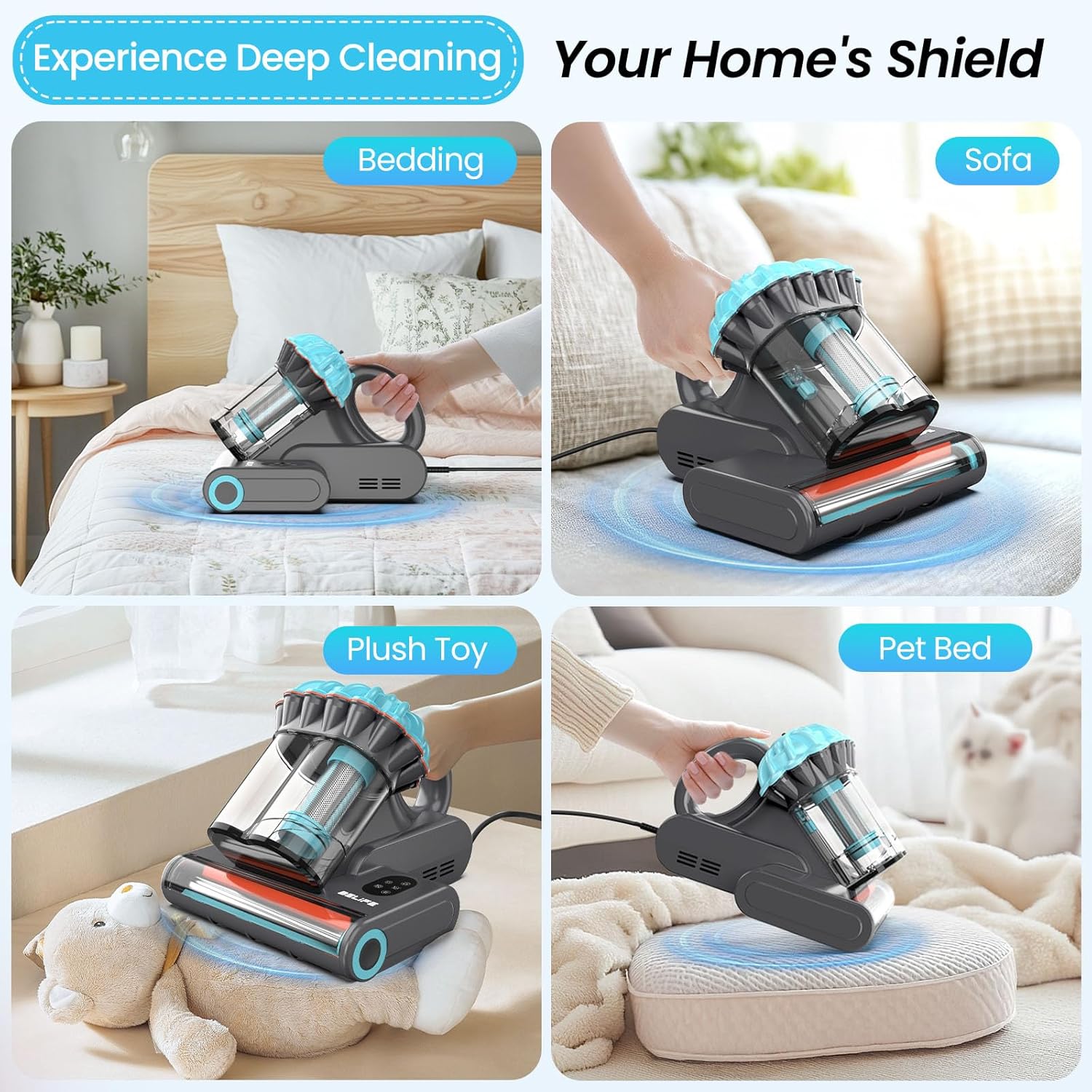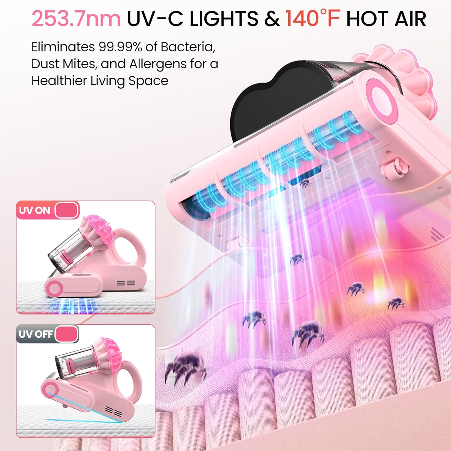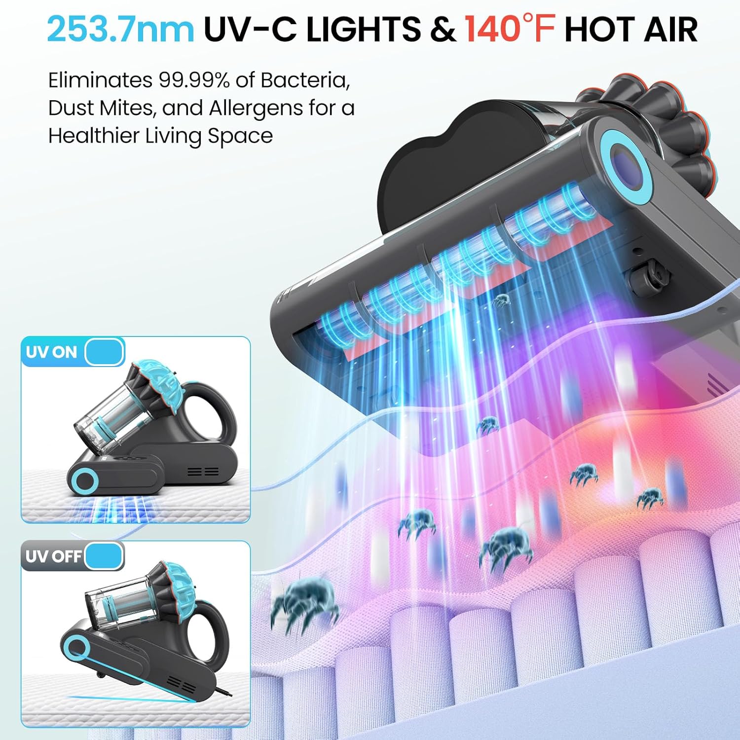 - 3-IN-1 Tech: With 253.7nm UV lights, 140°F (60℃) hot air and a high-frequency rotating brush, our vacuum cleaner removes 99.99% of allergens from mattresses, sofas, baby cribs, pet beds, and carpets. Ideal for households with pets and babies. Note: The UV function only operates when the machine is in direct contact with the mattress; lifting the machine automatically stops the UV function