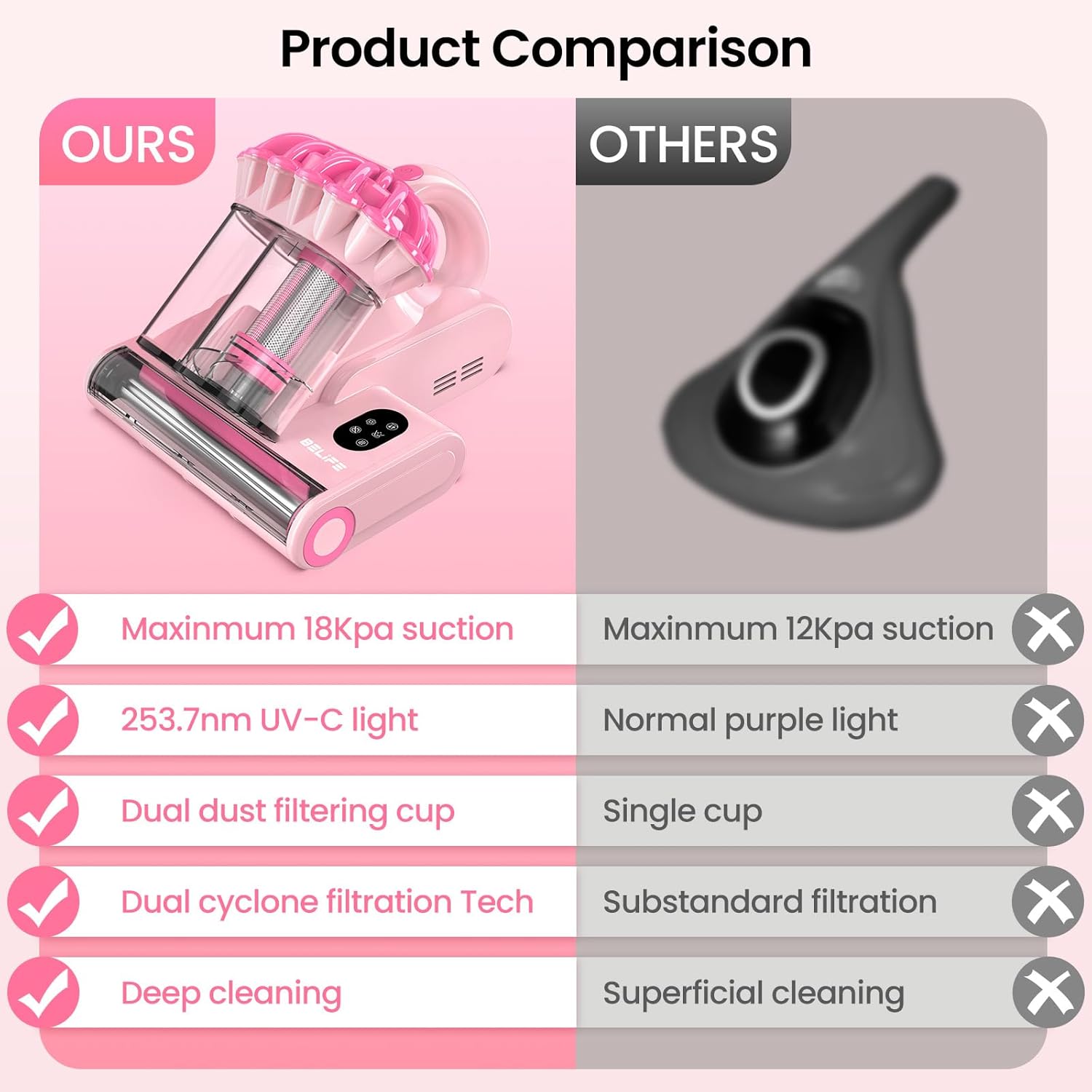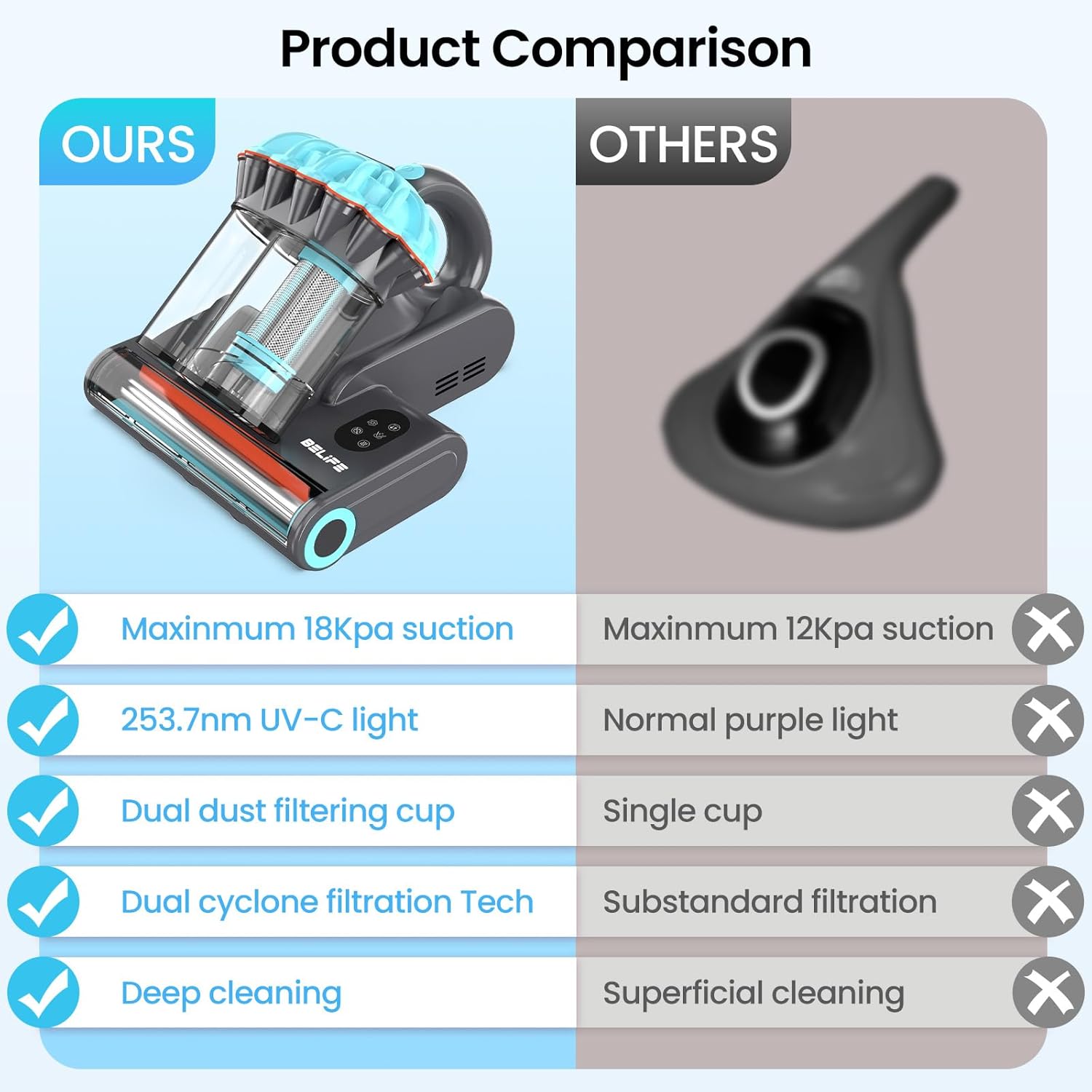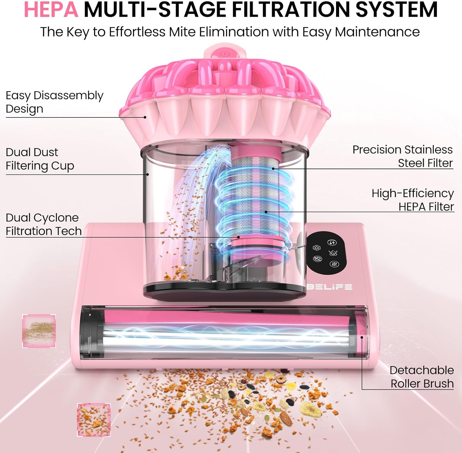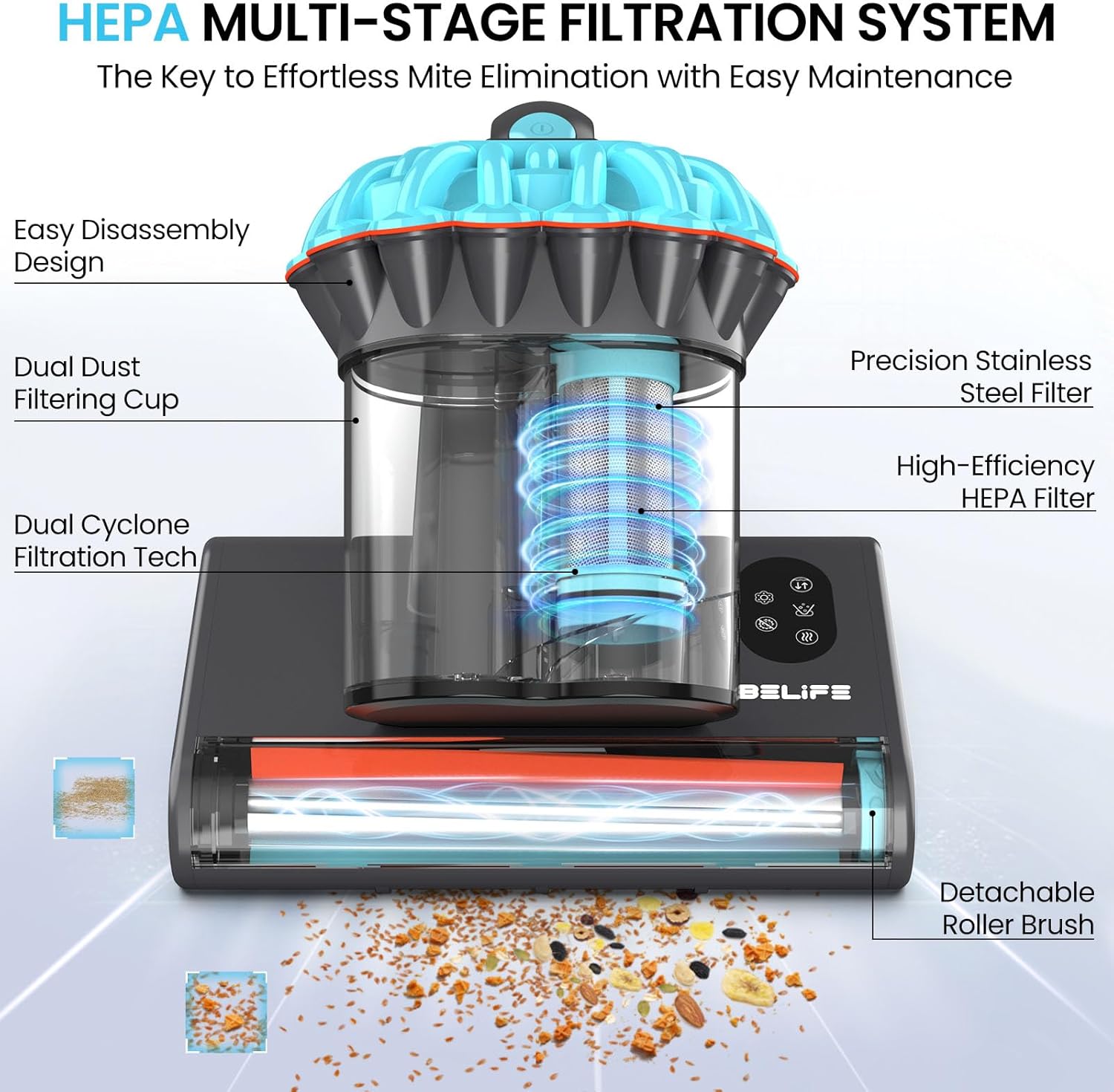 - 3-IN-1 Tech: With 253.7nm UV lights, 140°F (60℃) hot air and a high-frequency rotating brush, our vacuum cleaner removes 99.99% of allergens from mattresses, sofas, baby cribs, pet beds, and carpets. Ideal for households with pets and babies. Note: The UV function only operates when the machine is in direct contact with the mattress; lifting the machine automatically stops the UV function