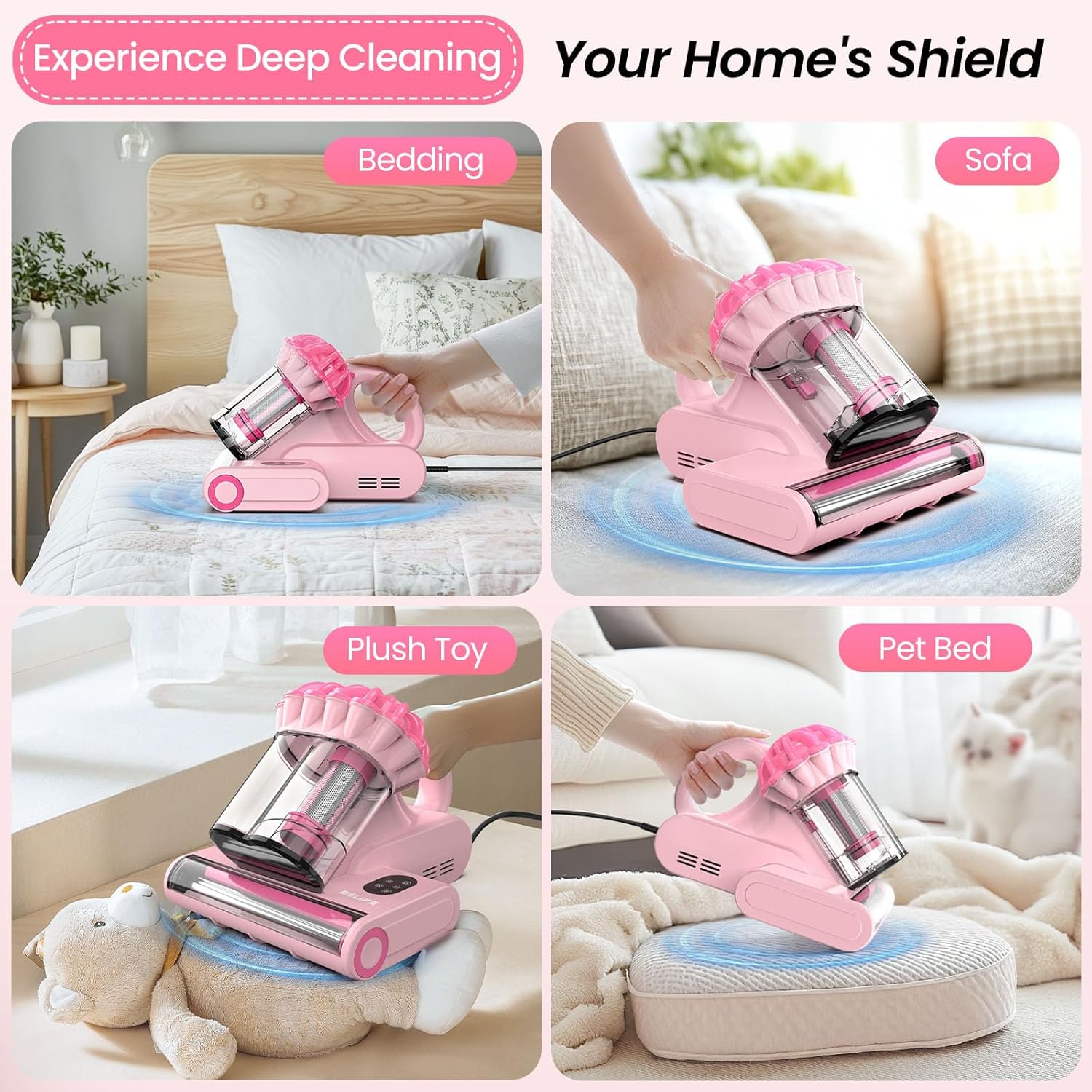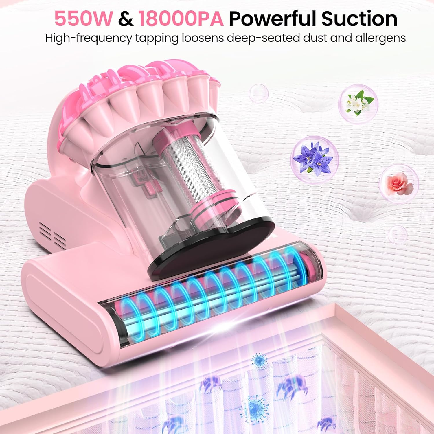 Mattress Vacuum Cleaner, Anti-allergen Bed Vacuum Cleaner with UV & Hot Air & High Heating, 550W 18Kpa Powerful Suction Double-Cup Handheld Vacuum for Bed, Couch, Sofa, Corded (Pink)