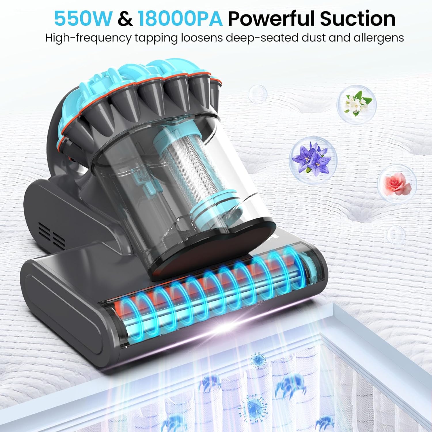 - Powerful Mattress Vacuum Cleaner: Featuring a 550W powerful motor and 18Kpa strong suction, coupled with a high-speed rotating brush, it allows for effortless deep cleaning. It effectively sucks up fine dust, pet hair, and more from deep within mattress, couch, pillow, and quilt