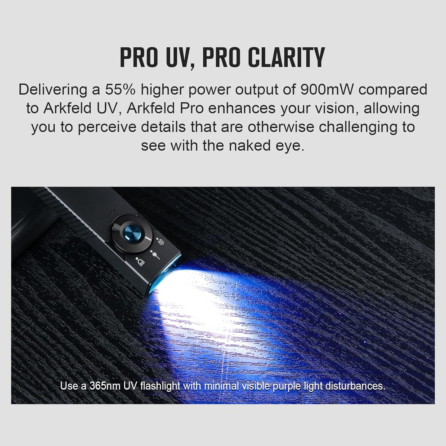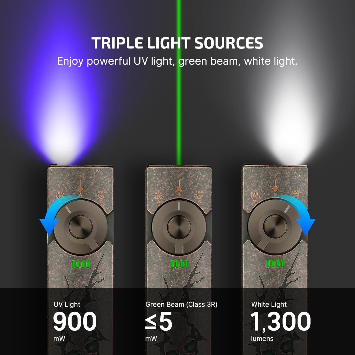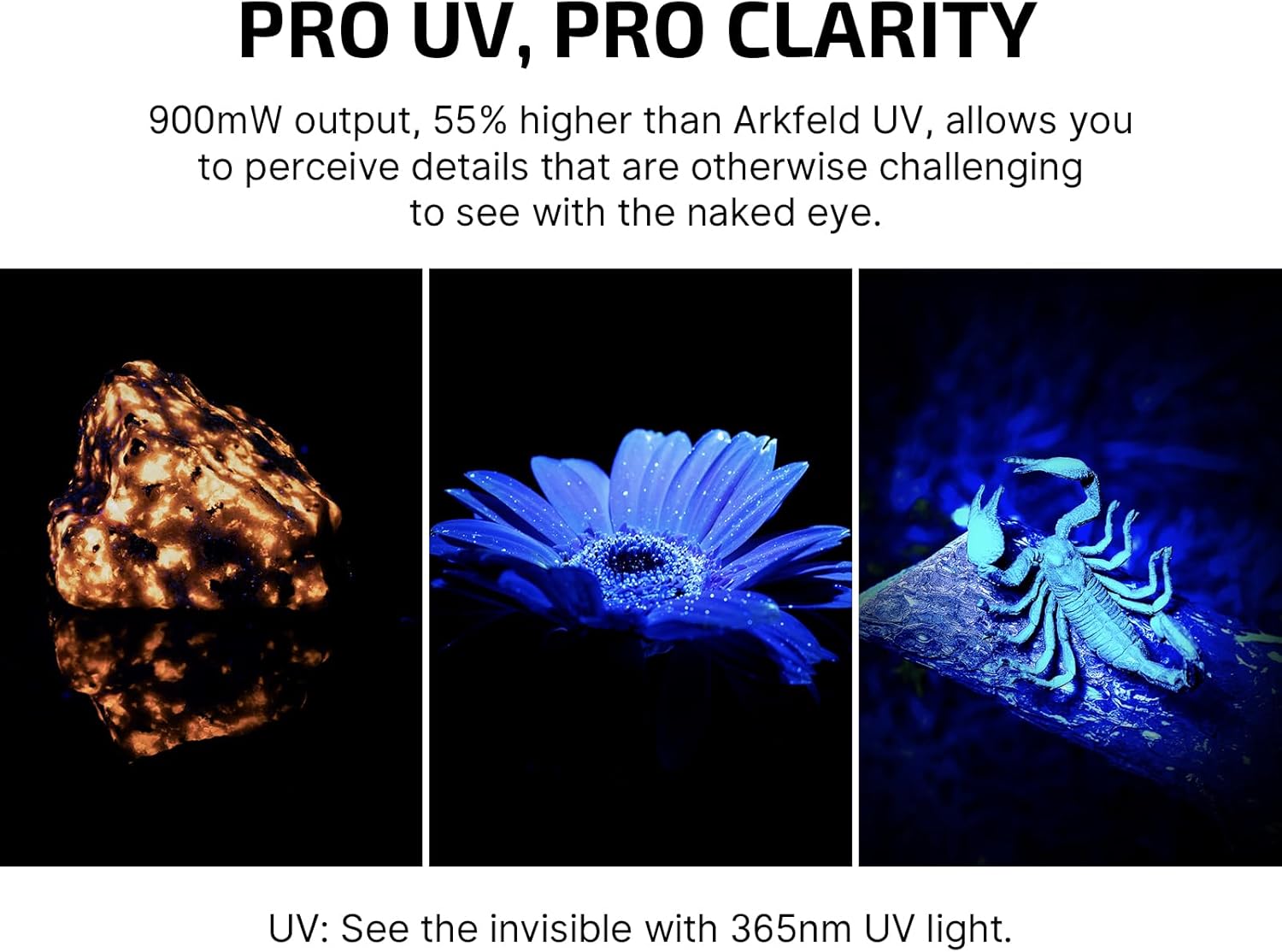 - [Three-in-One Functionality] Provides an impressive maximum brightness of 1300 lumens for excellent illumination. Arkfeld pro combines white light, UV, and green beam in a single flashlight, offering versatility for a wide range of applications