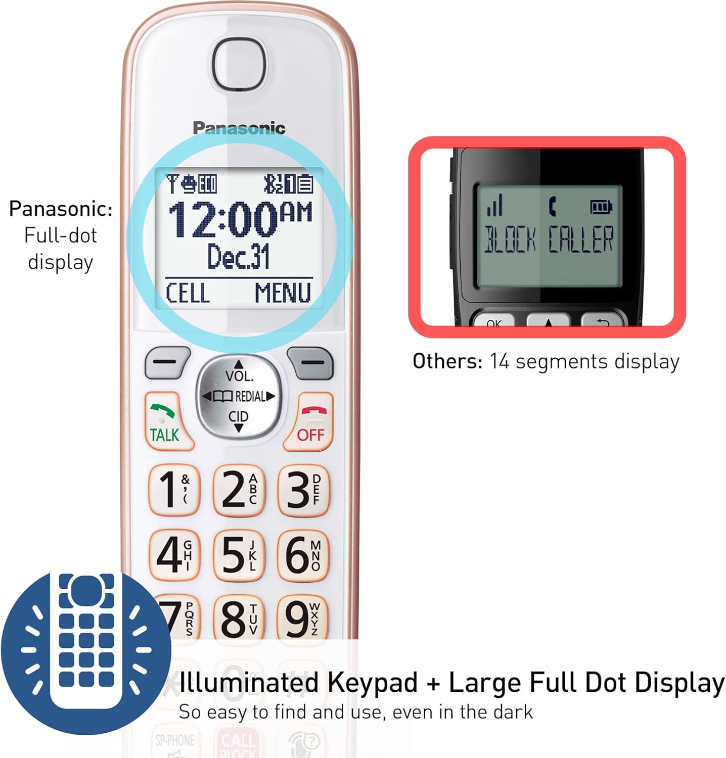 - Easy to Find and Use: Illuminated keypad with large characters is findable even in the dark; speed dial gives you 1-touch access to your most-dialed numbers; Bilingual Talking Caller ID audibly announces calls in English or Spanish