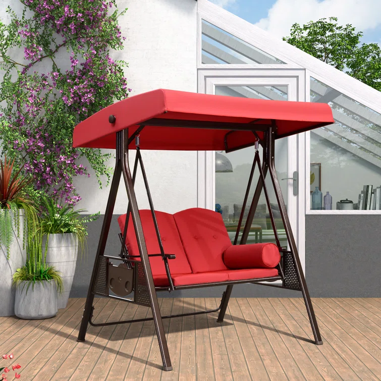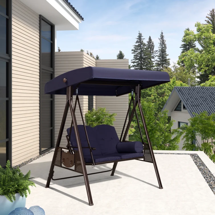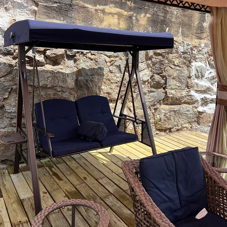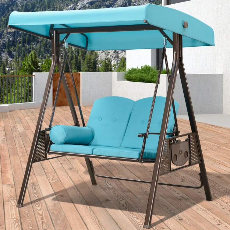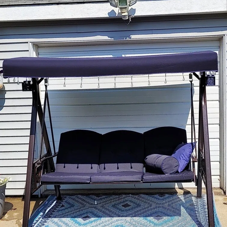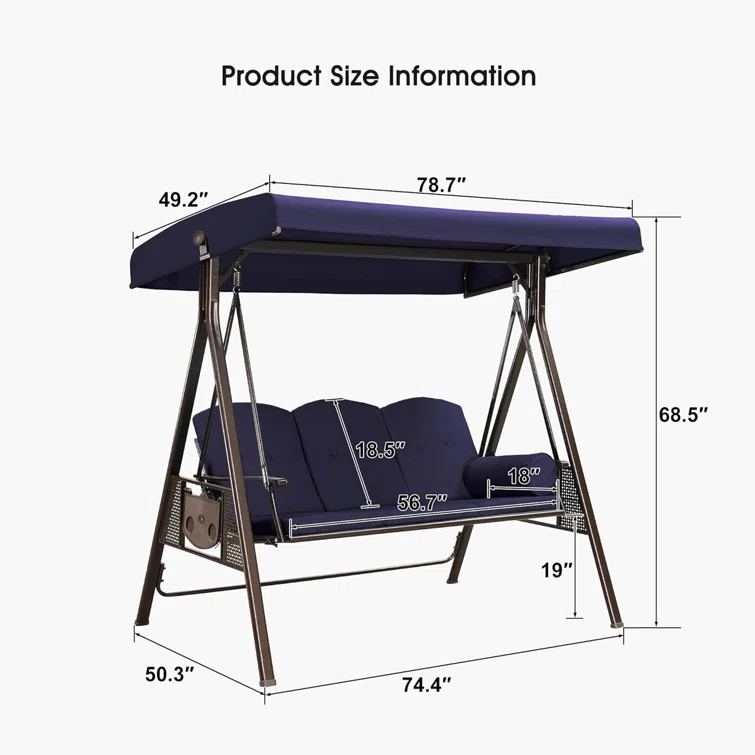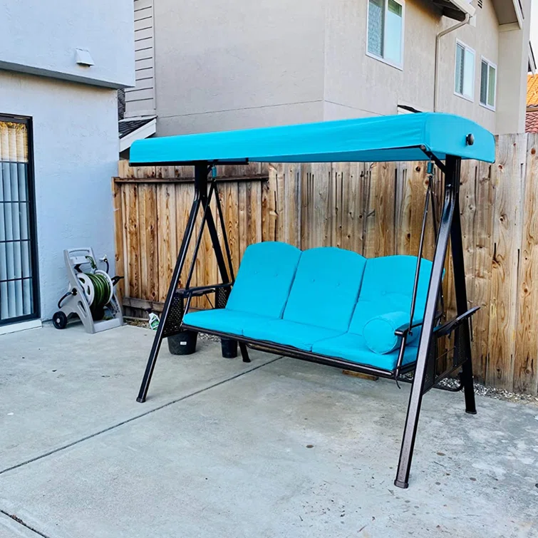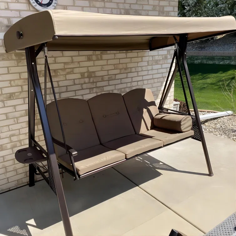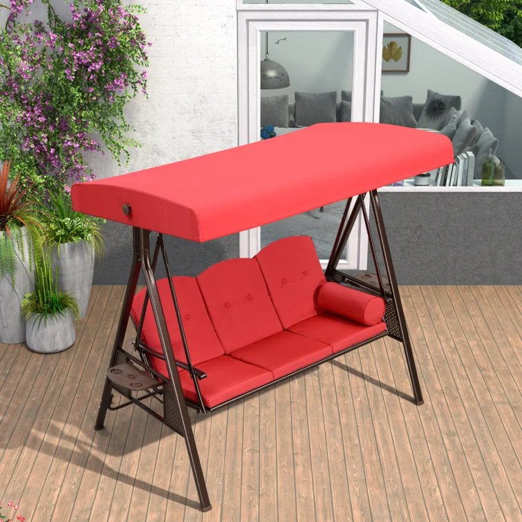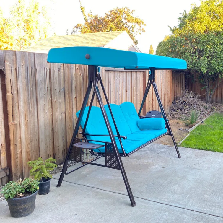 This Porch swing with stand outdoor cover is constructed with a durable metal frame and comfortable cushioned seating. Three removable cushions and one pillow included offer you comfortable seating for relaxing in the yard or on the porch. The durable, UV-resistant polyester fabric provides shade and comfort for three persons, easy to clean. Two side tables provide two convenient spots to place cups, anti-slip, and anti-falling. The canopy top of the swing is adjustable, easy shading area control. Put it in your garden to enjoy your free time.