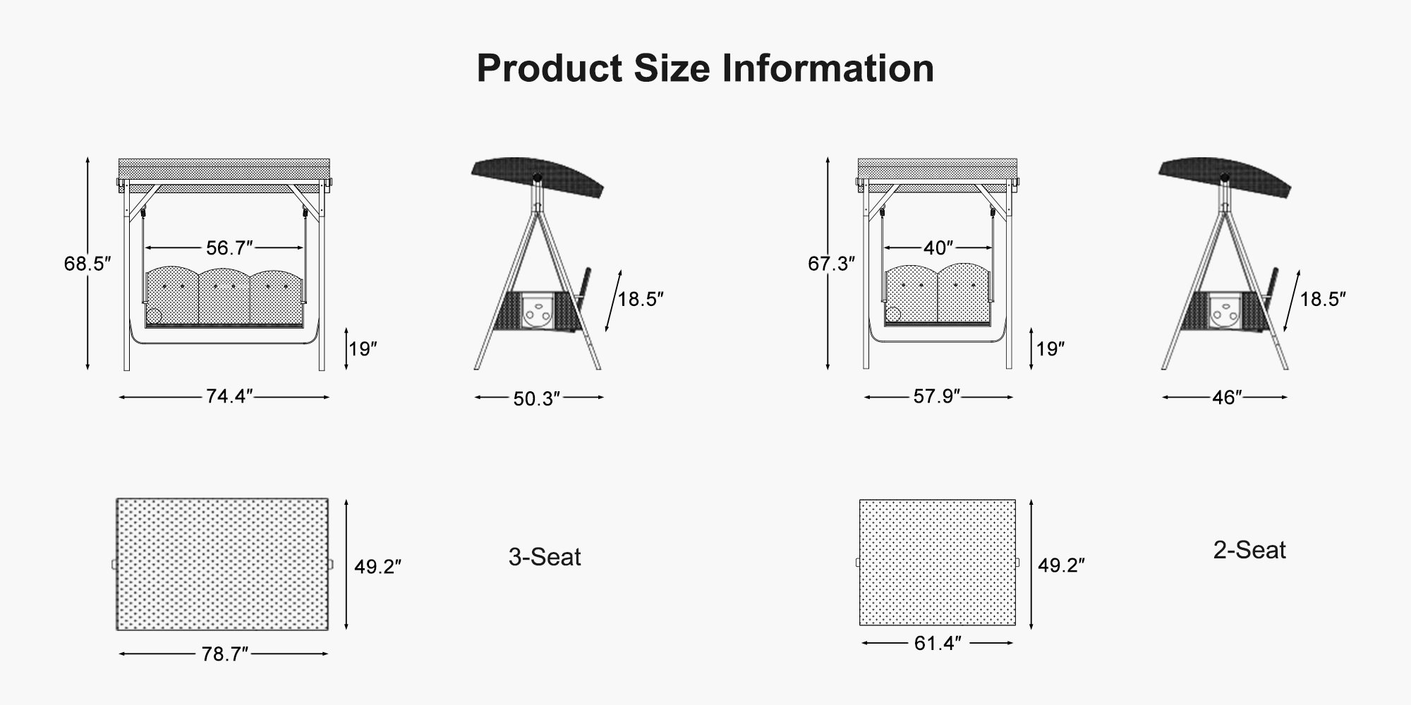 - 【ENOUGH SITTING SPACE】-Dimensions: 67.3"(H) X 57.9"(W) X 46"(D) for two seats or 68.5"(H) X 74.4"(W) X 50.3"(D) for three seats.