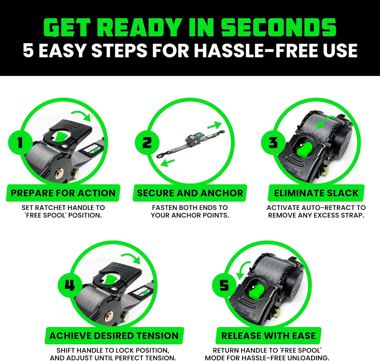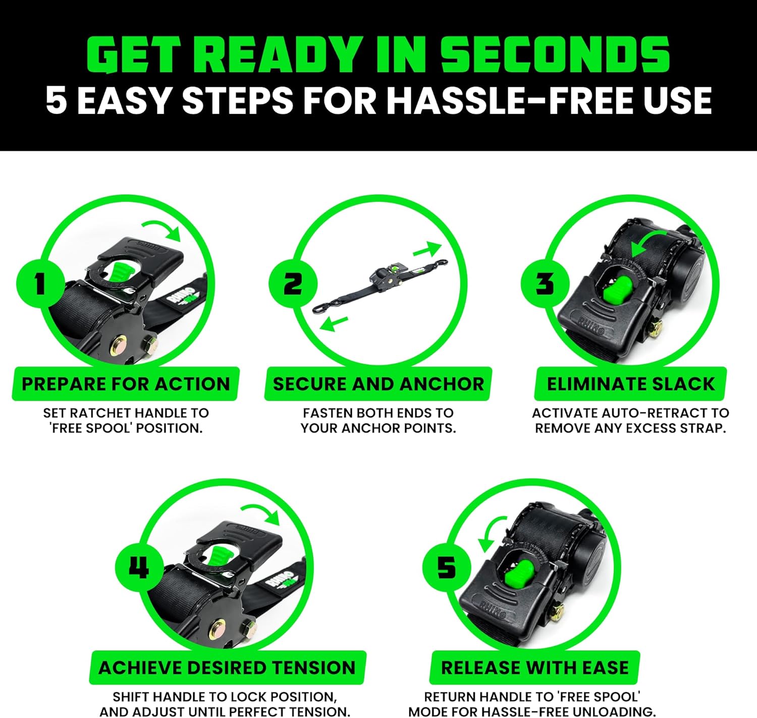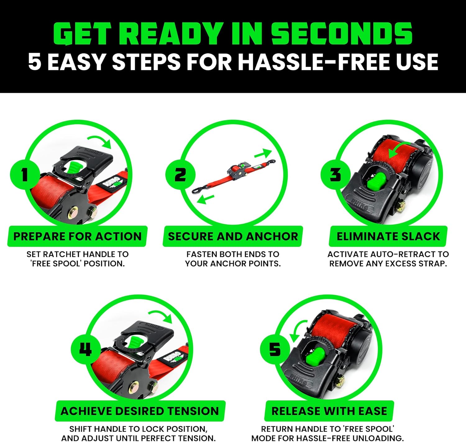 The Rhino USA Retractable Ratchet Straps are the ultimate tie down for hassle-free transport, featuring effortless operation and an EZ-Release Mechanism to save you time & headache.