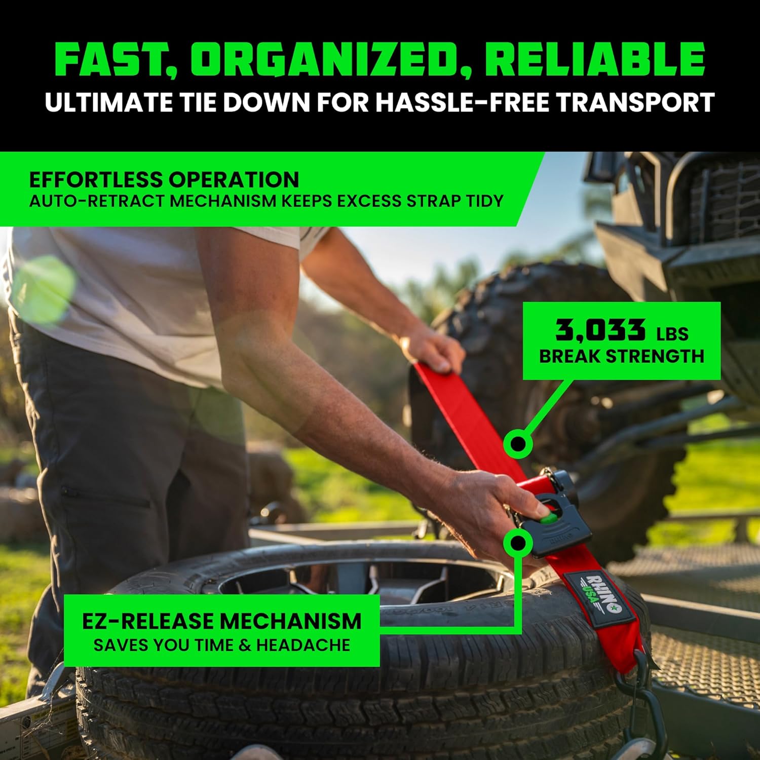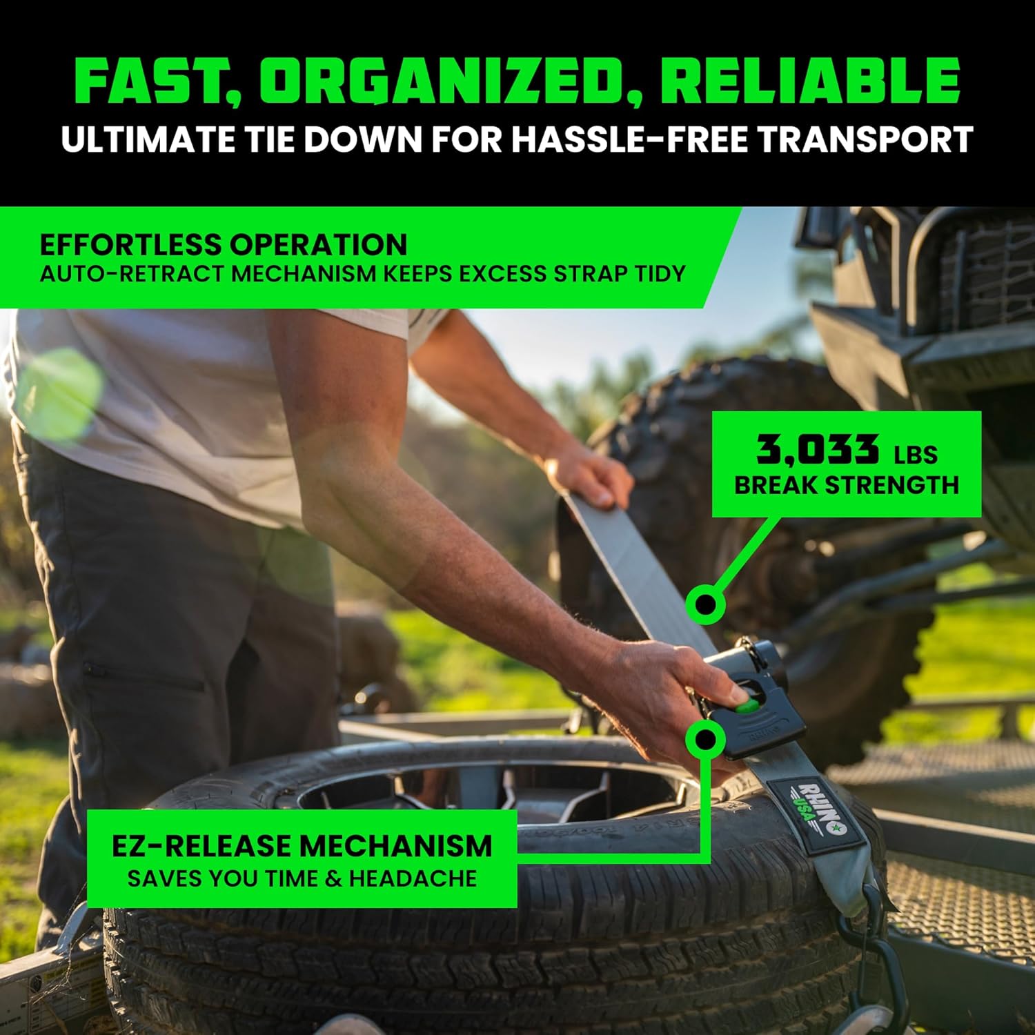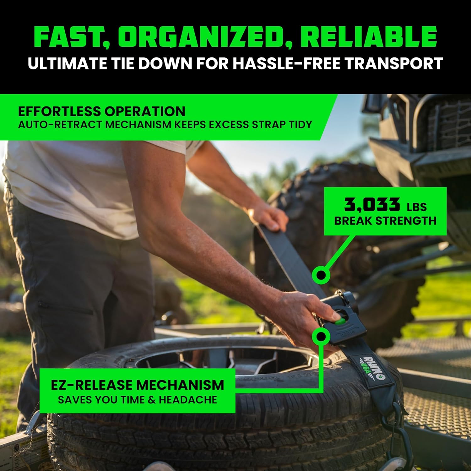 The Rhino USA Retractable Ratchet Straps are the ultimate tie down for hassle-free transport, featuring effortless operation and an EZ-Release Mechanism to save you time & headache.