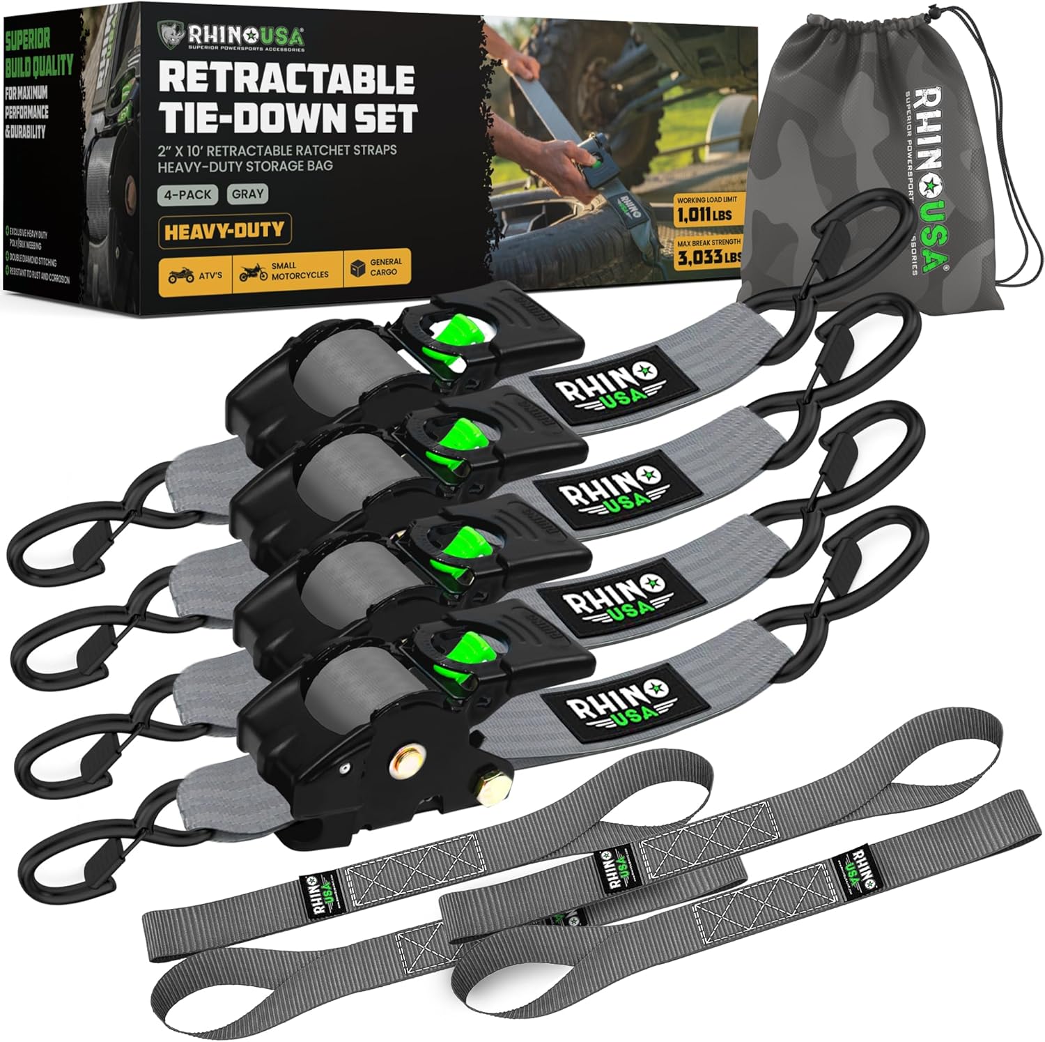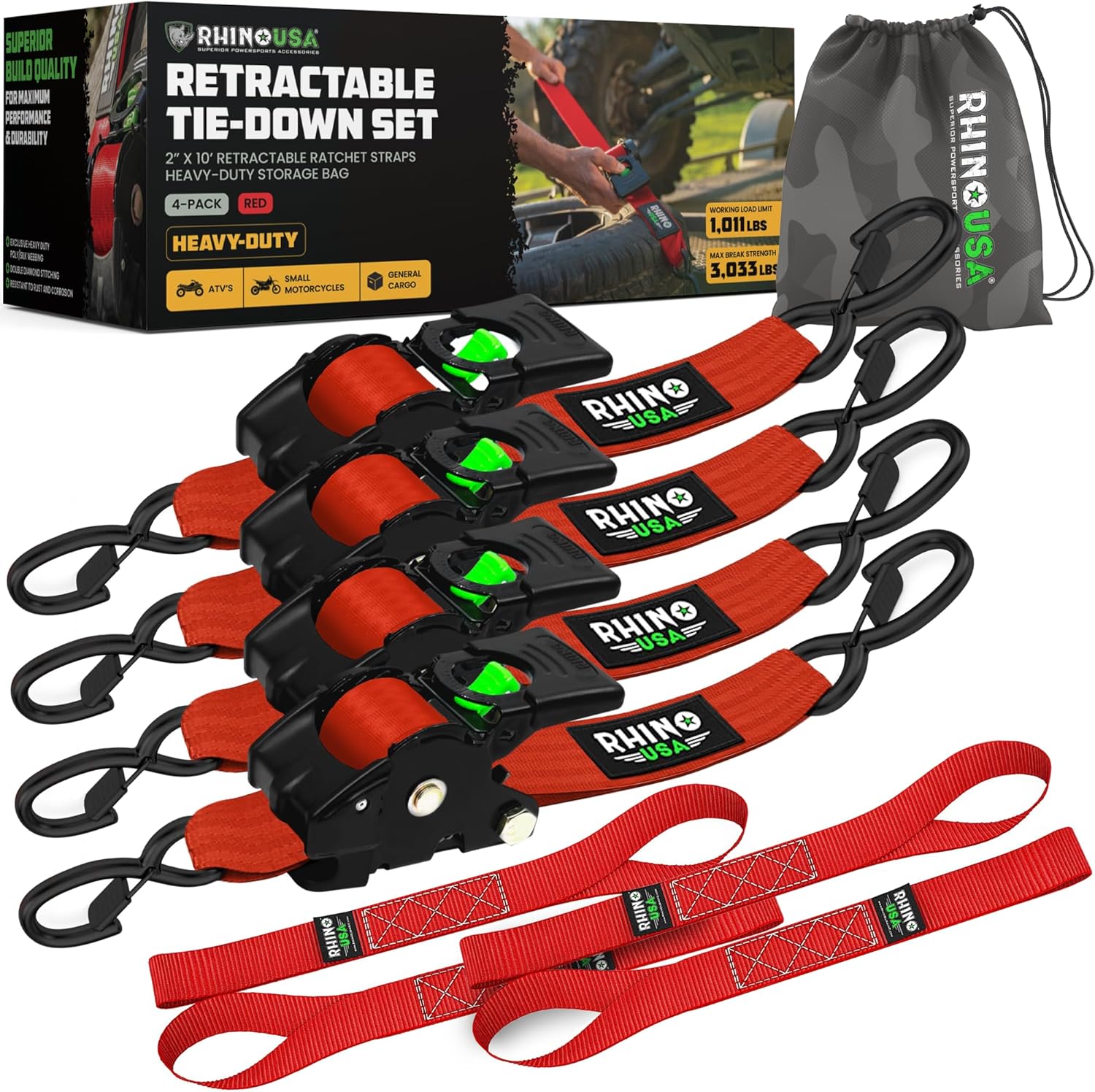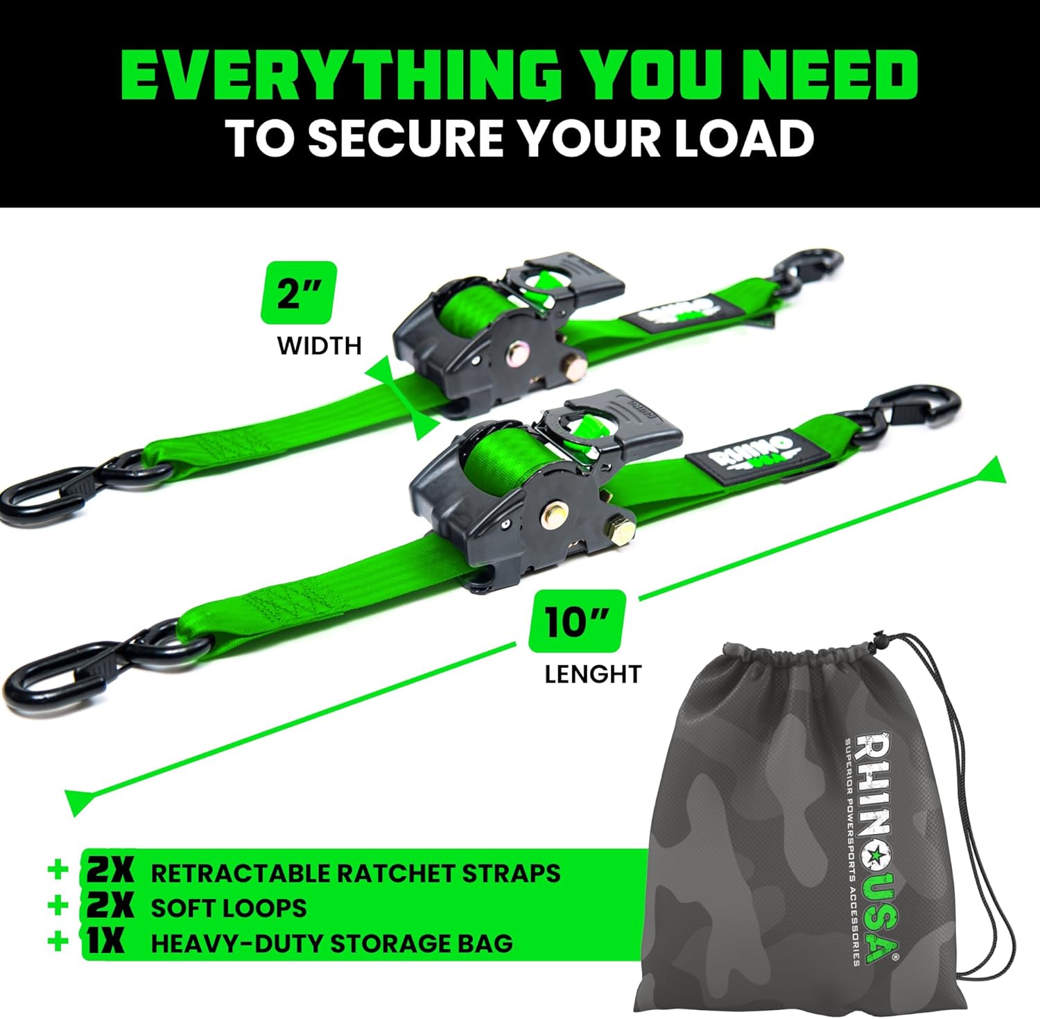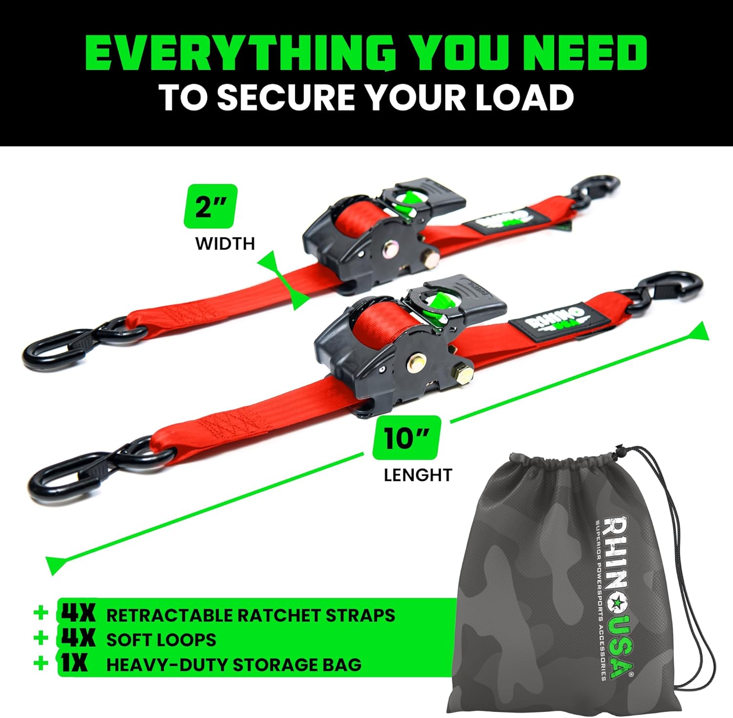 • Rhino USA Retractable Ratchet Straps (2-Pack) - 2 Inch x 10 Feet (3,033lb Break Strength) - Heavy Duty Auto Self Retracting Tie Down Straps for Truck, Cargo Trailer, Motorcycle, Rad & More - Black