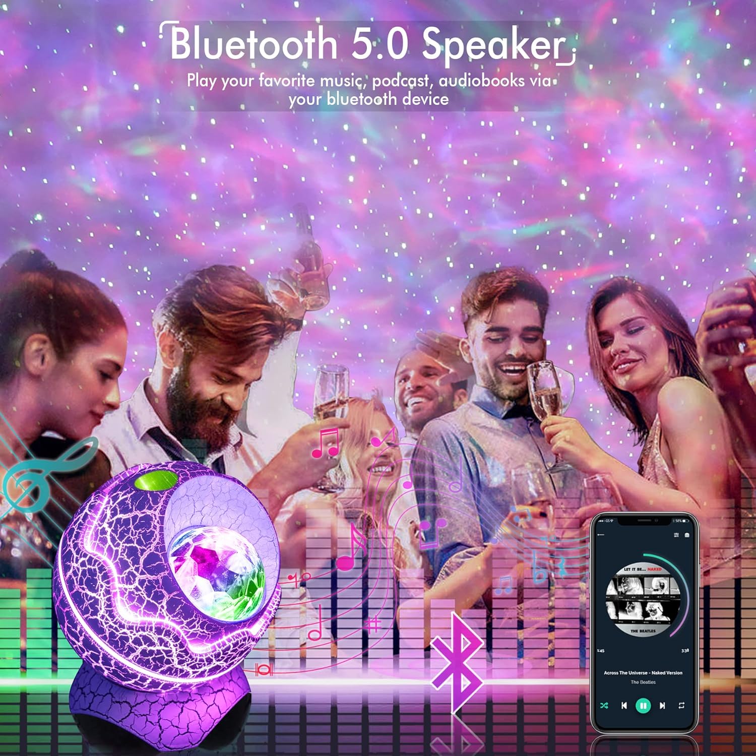 - Bluetooth 5.1 Speaker & Sound Activated - The galaxy projector features a built-in Bluetooth speaker. Connect your device via Bluetooth to play some music through the galaxy light projector and watch in amazement as the little stars blink and northern lights moves rhythmically to the beat of the music. You can activate the sound function from the remote control and the night lights will flash and change according to the music rhythm or by clapping your hands, resulting in immersive experience.