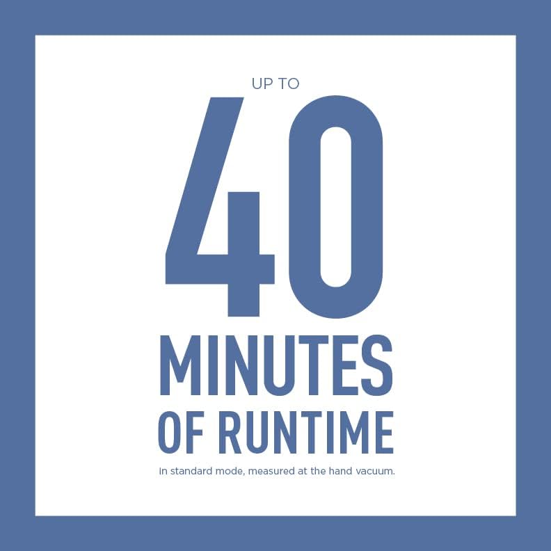 - UP TO 40 MINUTES OF RUNTIME: Up to 40 minutes of runtime to clean your home *Measured at the hand vac in standard mode, without accessories