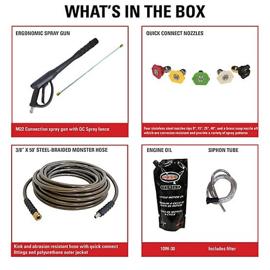 - Gas pressure washer comes with a monster hose - 3/8 in. x 50 ft. kink and abrasion resistant hose with quick connect fittings and polyurethane outer jacket