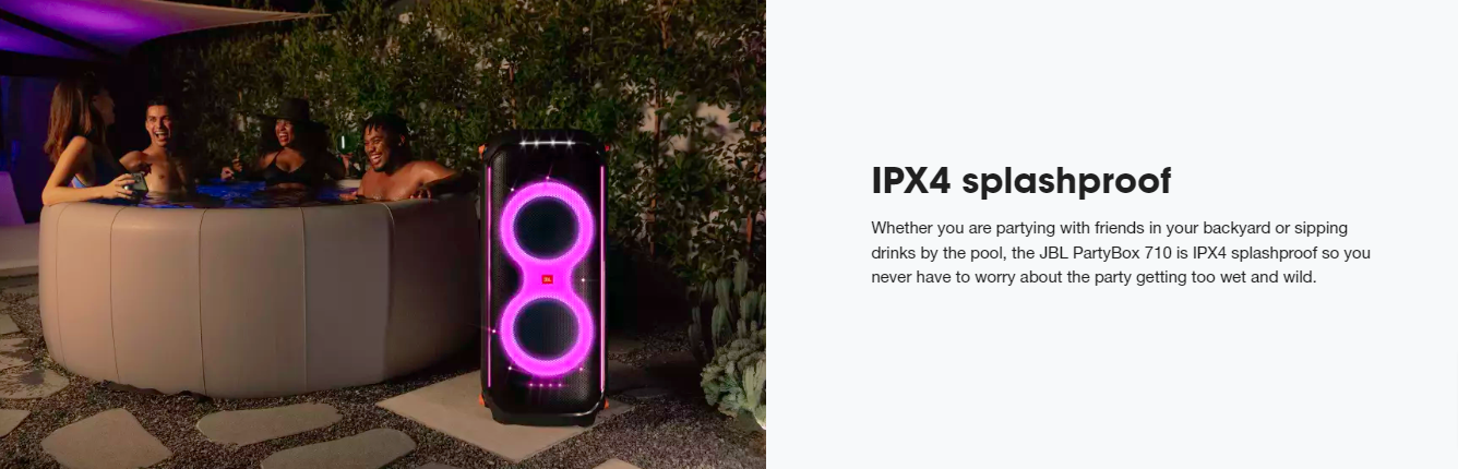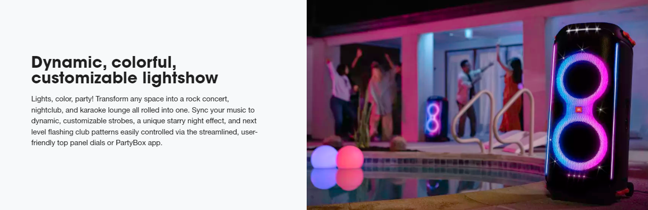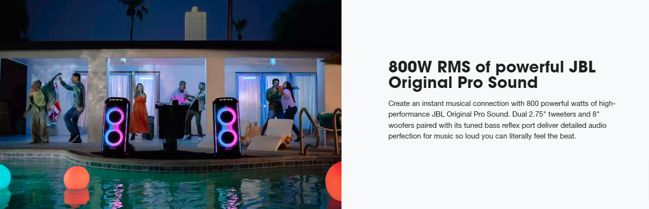 Party speaker with 800W RMS powerful sound, built-in lights and splashproof design.
