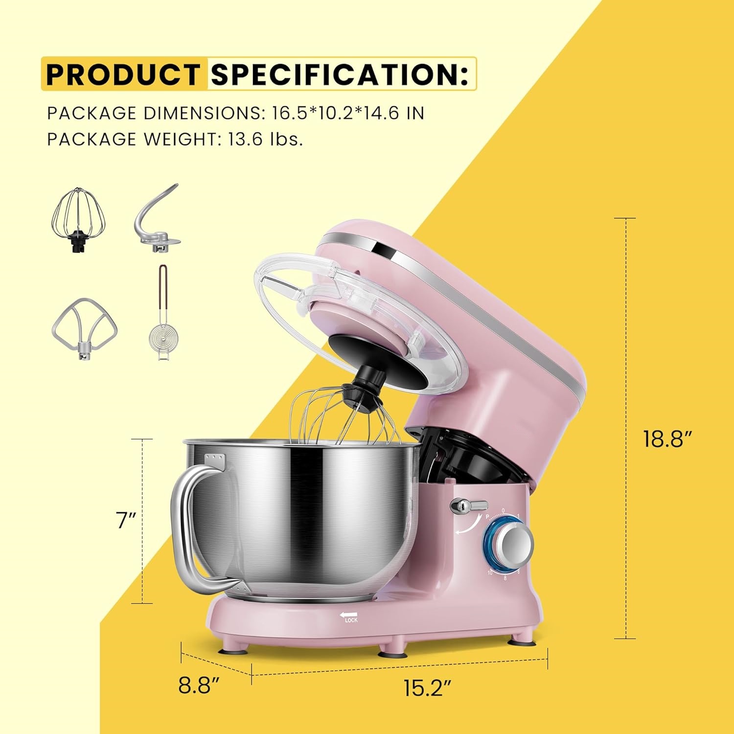 • SAFE &STURDY BOWL - Made of food-grade stainless steel, it ensures the health of the whole family; Large 6QT capacity meets daily kitchen requirements; The bowl can be fixed to the base, which makes it stay steady during mixing work; Considerable design of a handle will facilitate your operation; With suction cups on the bottom of the base, the kitchen mixer won’t move all over the counter