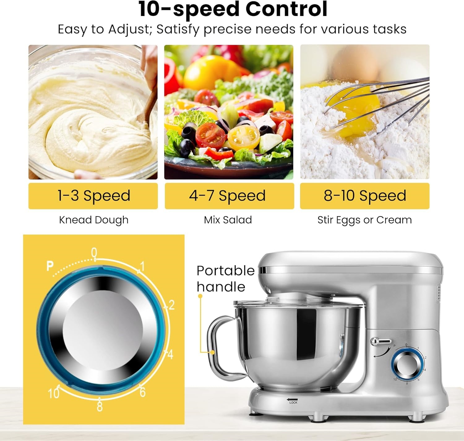 • POWERFUL MOTOR - High-performance 660W motor finishes kneading and mixing quickly and thoroughly than human hands; Handy 10-speed control with a pulse function can satisfy precise needs for various mixing tasks; Heavy-duty metal gears lead to stable and quiet working; Features 2 heat vents outlets, the mixer has a rapid heat dissipation for long service life