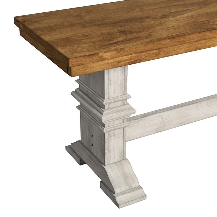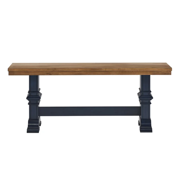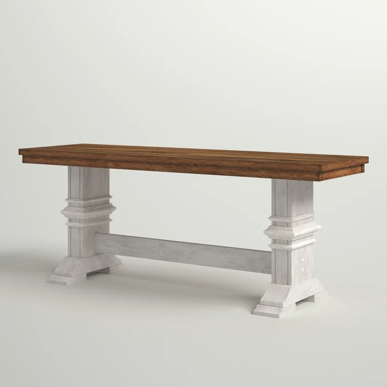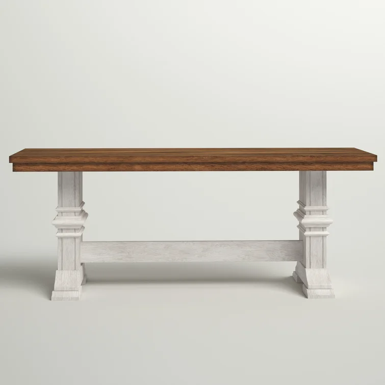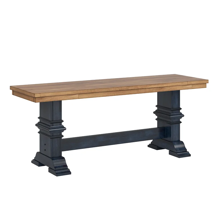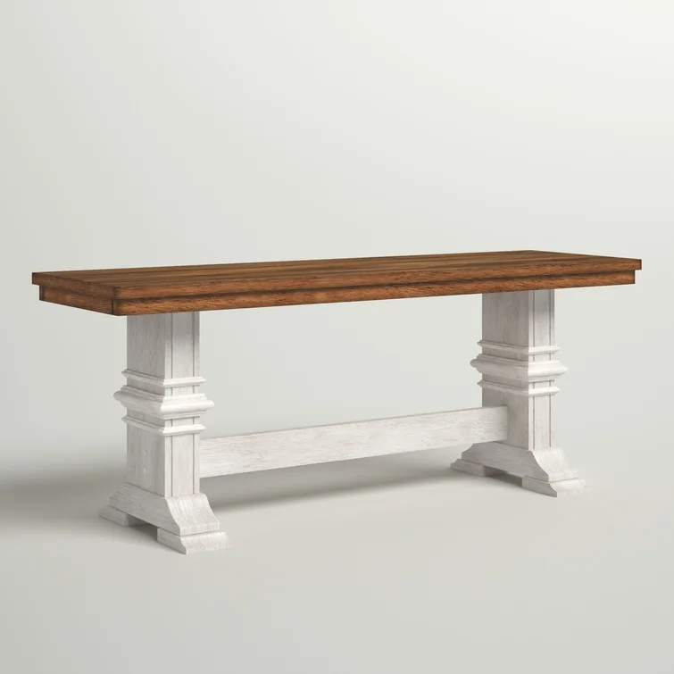 This traditional bench showcases a country farmhouse aesthetic with its distressed wood grain finish and trestle leg base. The frame is made from solid wood with the two-toned hue of your choice that works well with various color palettes. We love the carved detailing and subtle crown molding giving it a timeless look and feel. This bench measures a little over 47" wide, making it the right spot for guests to kick off their shoes in the entryway. Plus, it comes with all the tools you need for fuss-free assembly.