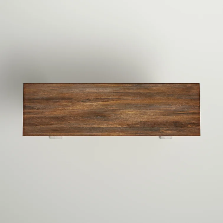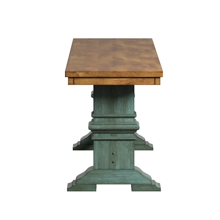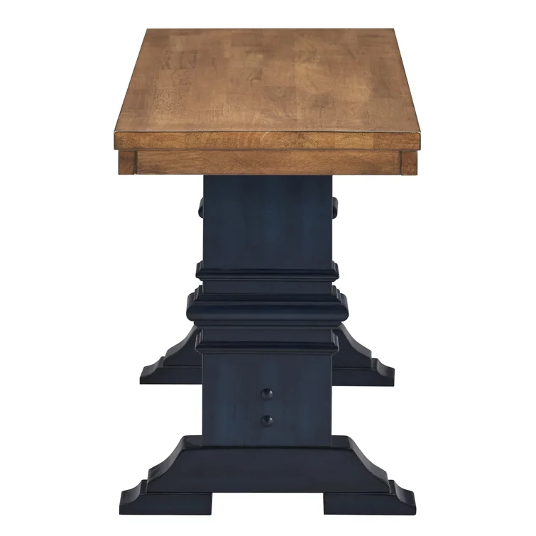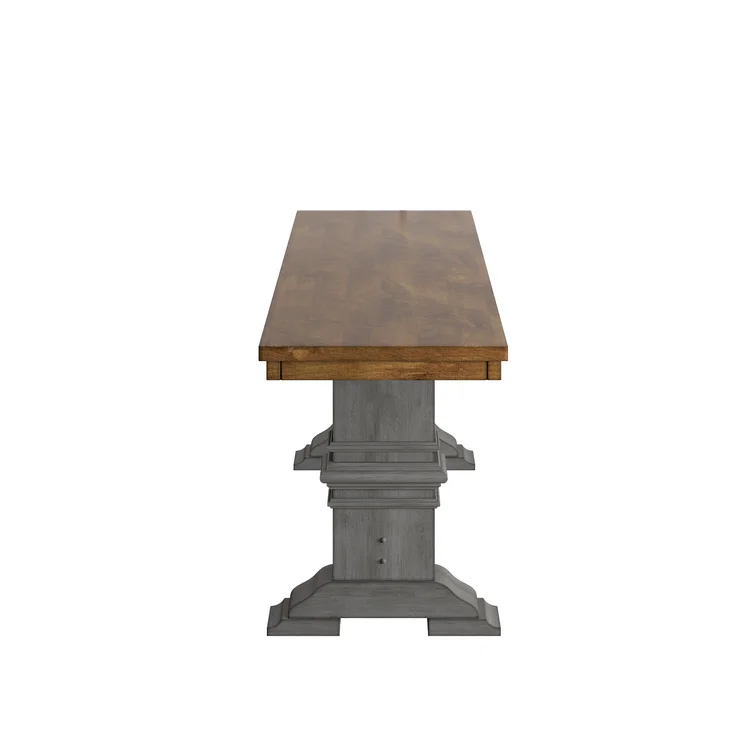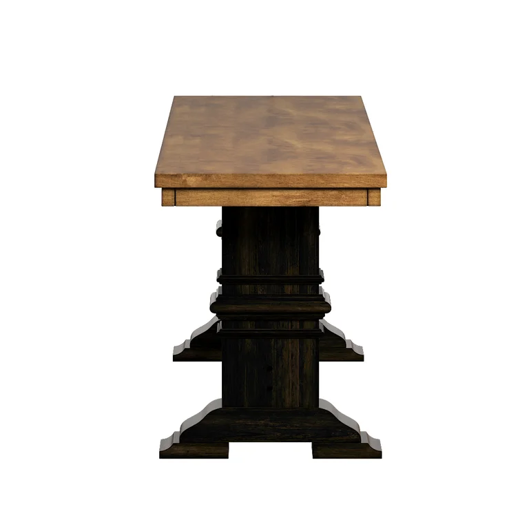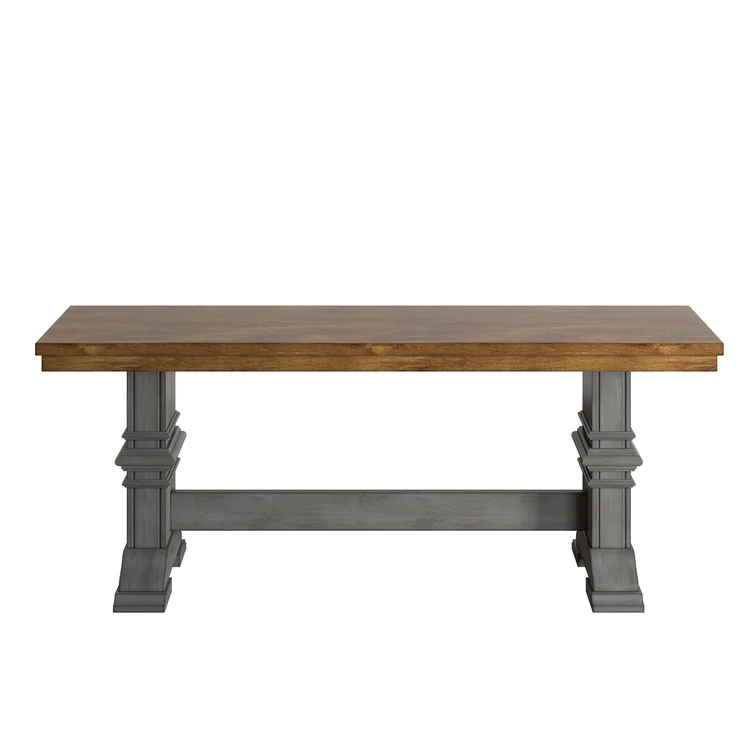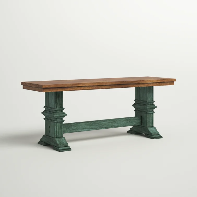 This traditional bench showcases a country farmhouse aesthetic with its distressed wood grain finish and trestle leg base. The frame is made from solid wood with the two-toned hue of your choice that works well with various color palettes. We love the carved detailing and subtle crown molding giving it a timeless look and feel. This bench measures a little over 47" wide, making it the right spot for guests to kick off their shoes in the entryway. Plus, it comes with all the tools you need for fuss-free assembly.