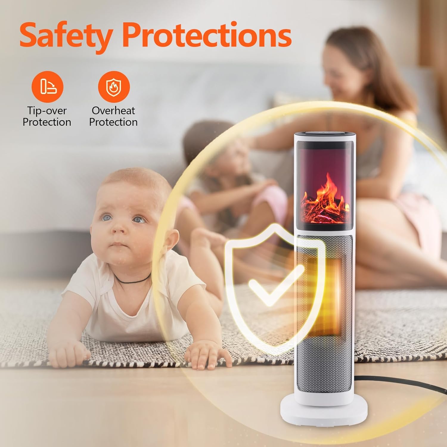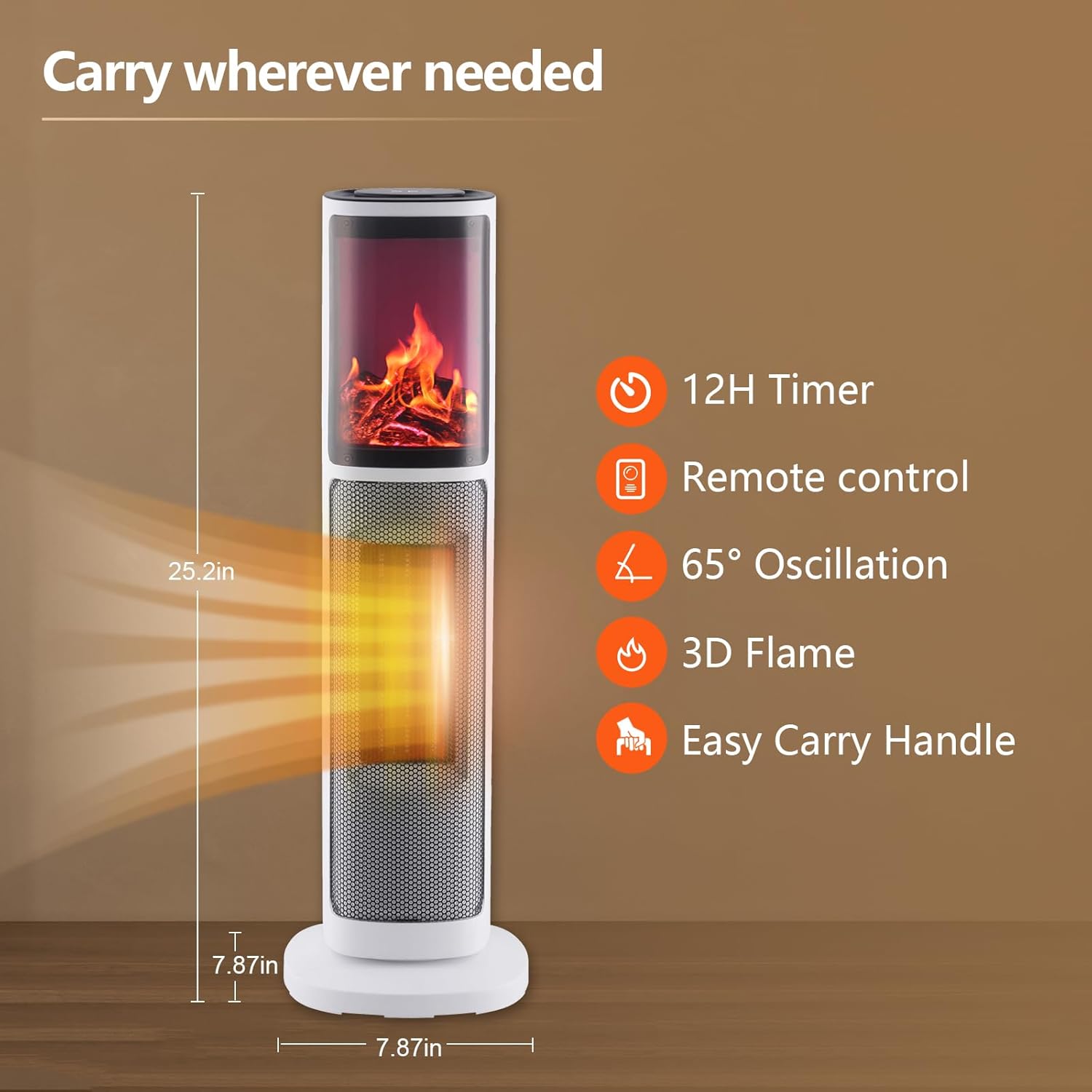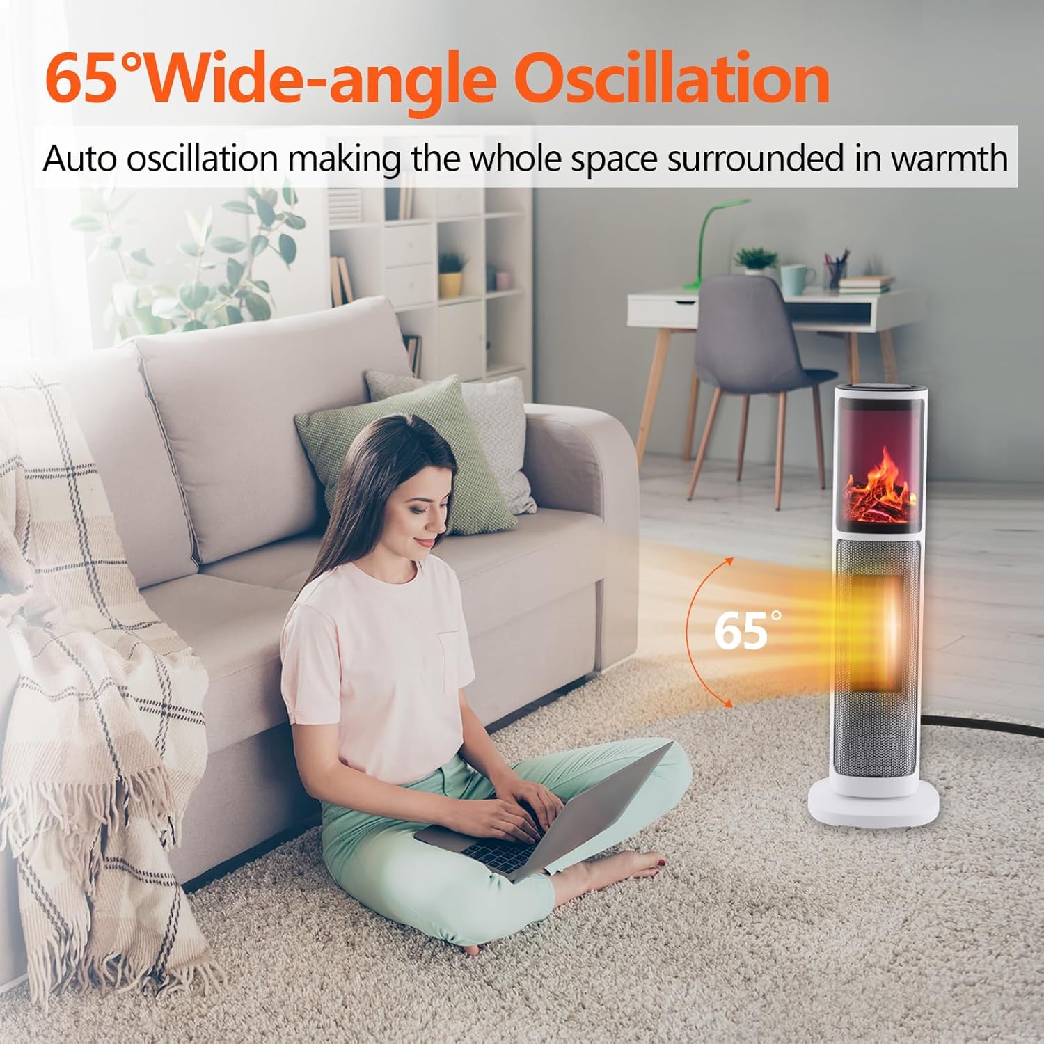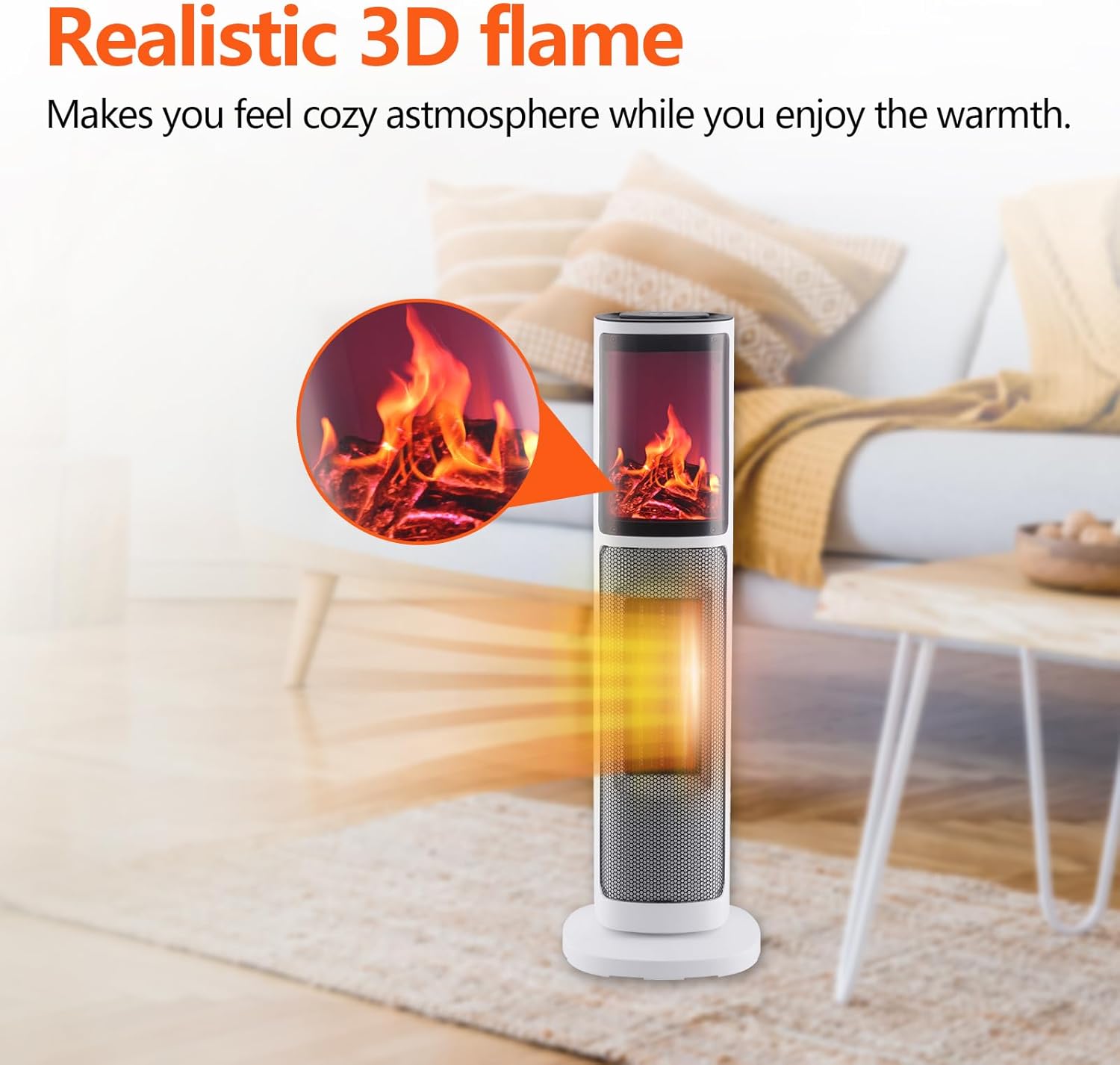 Tower Heater for Indoor Use, 750/1500W Ceramic Space Heater with Thermostat&Oscillating, Digital Space Heater with Realistic 3D Flame, Timer and Remote Control