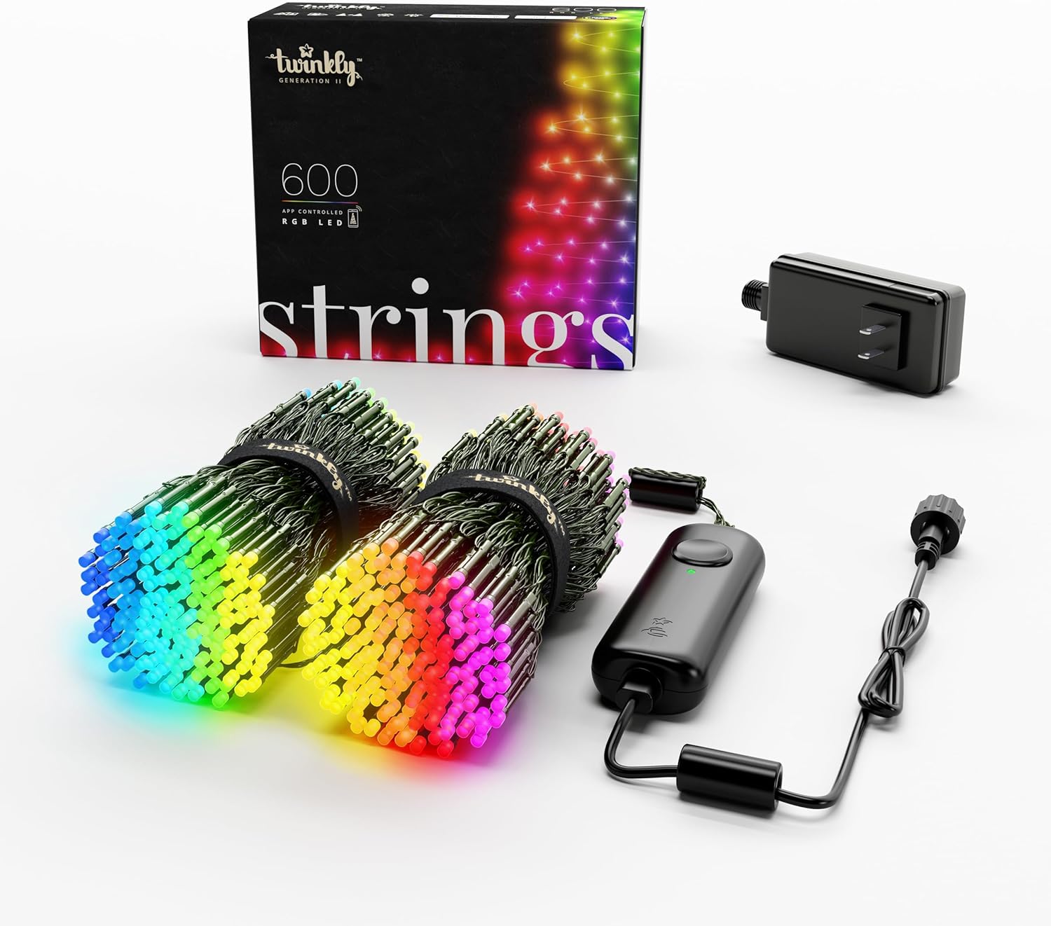 Twinkly Strings 600 LED RGB+Warm White, LED Light String, in-and Outdoor Smart Multicolor LED Lights, Christmas Lights, Mappable LEDs, Compatible with Alexa and Google Home, IP44, Green Wire, 157.5ft
