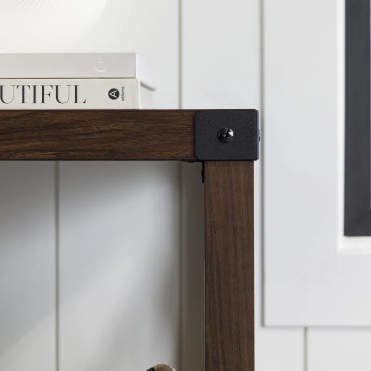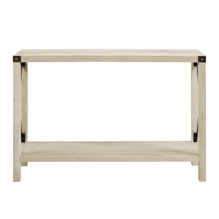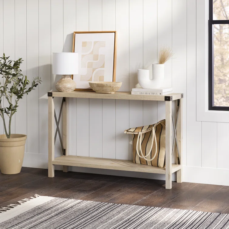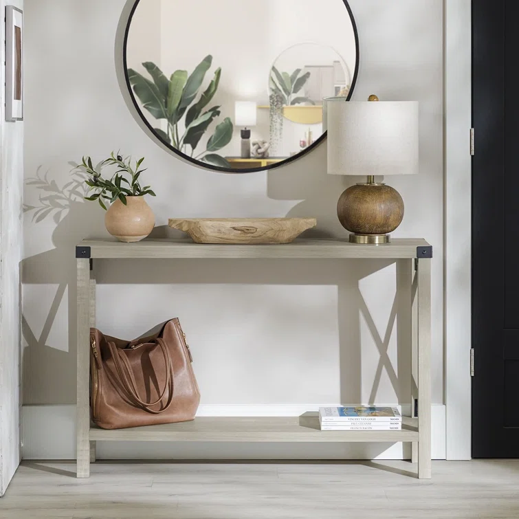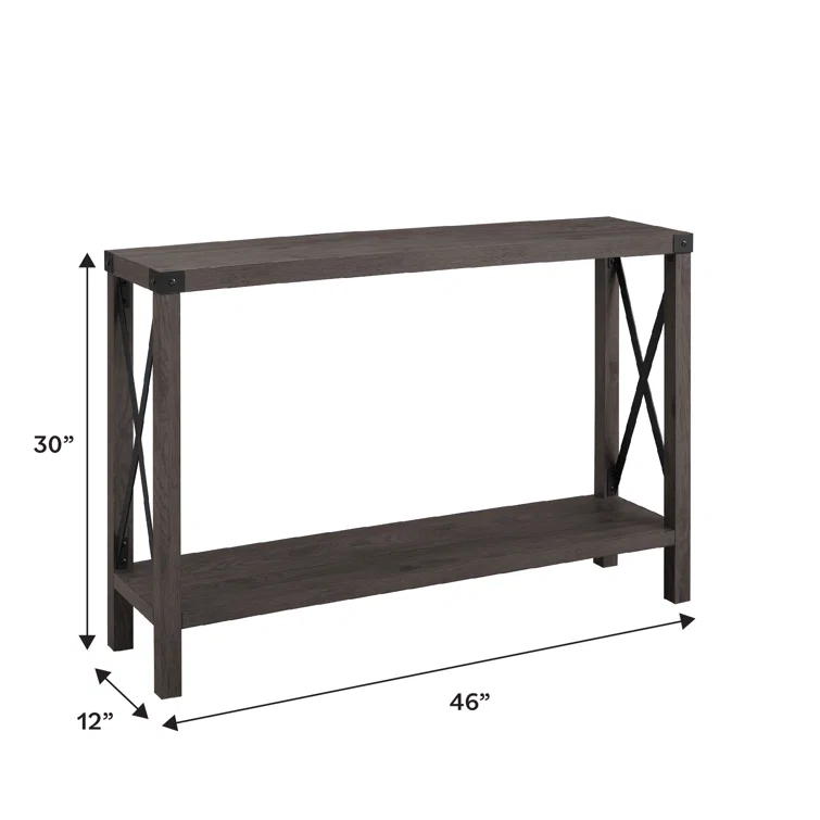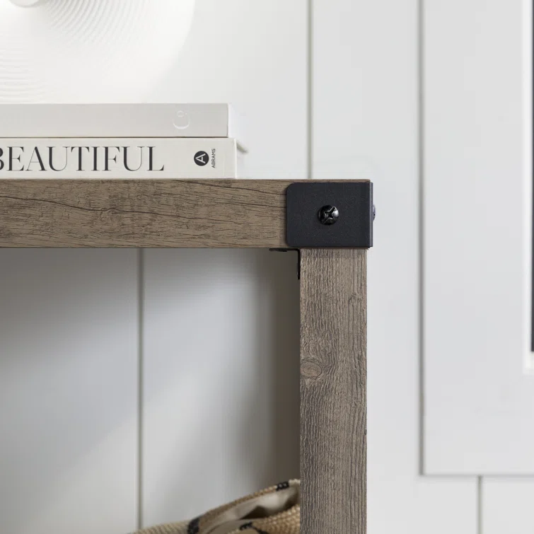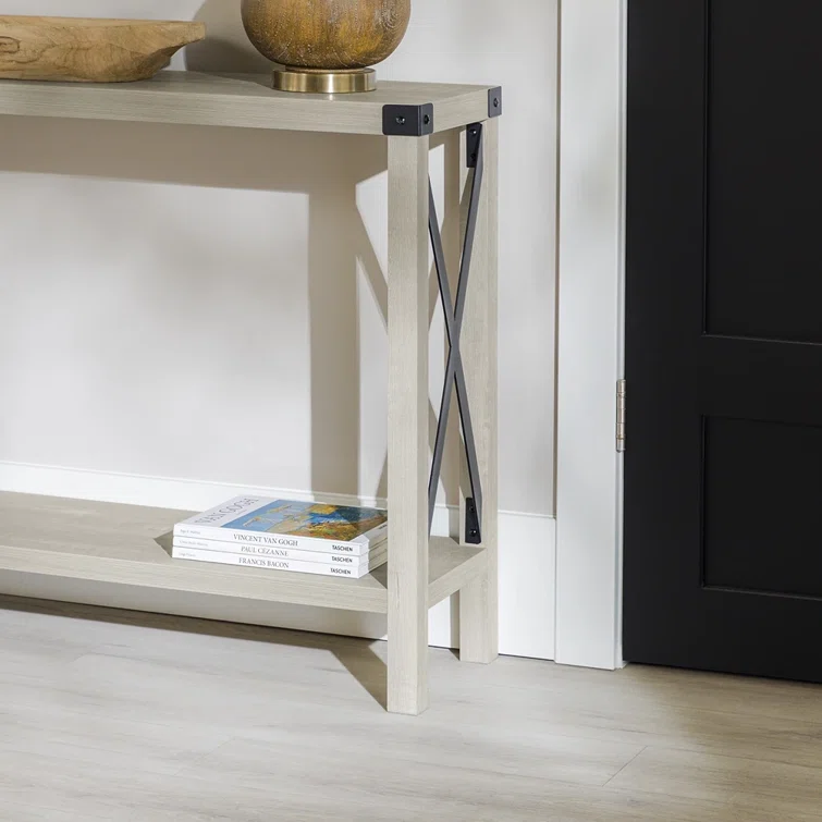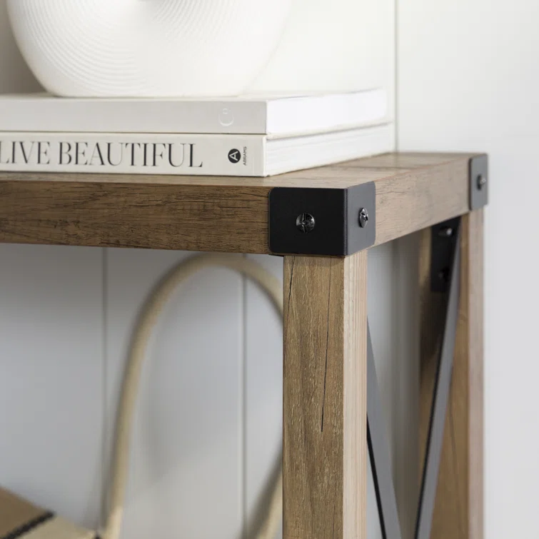 With this entry table, you’ll have a stylish entryway in no time. The urban industrial and charming, farmhouse style create a warm and inviting feel to your home, which you’ll enjoy having. With metal accents on the corners and x-shaped sides for an intriguing design. A lower shelving made from durable laminate provides a surface for your shoes when you get home or to decorate.