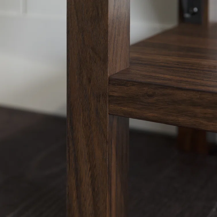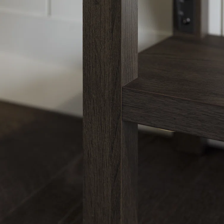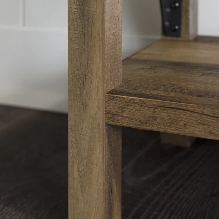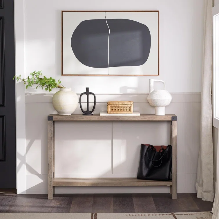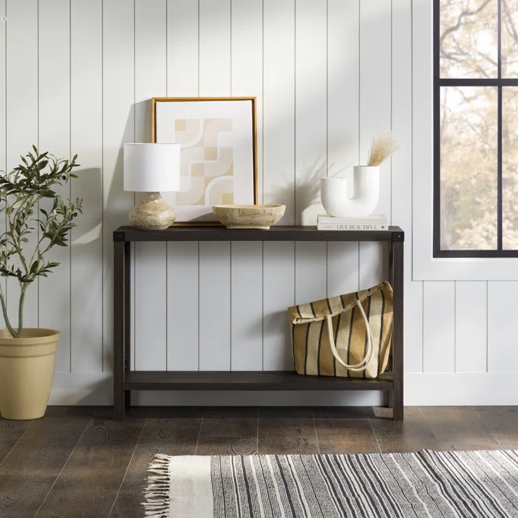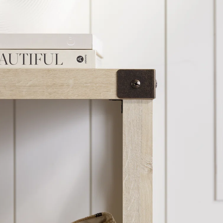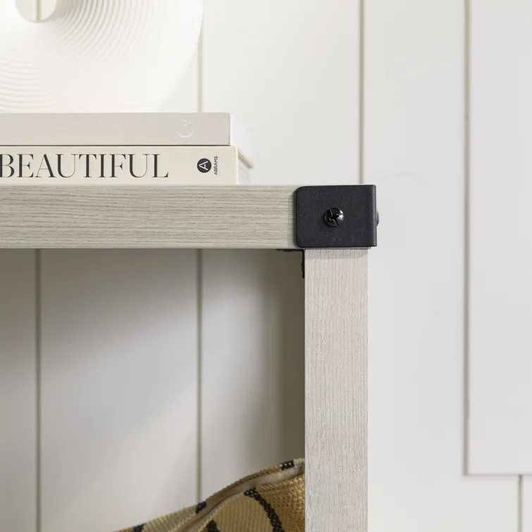 With this entry table, you’ll have a stylish entryway in no time. The urban industrial and charming, farmhouse style create a warm and inviting feel to your home, which you’ll enjoy having. With metal accents on the corners and x-shaped sides for an intriguing design. A lower shelving made from durable laminate provides a surface for your shoes when you get home or to decorate.