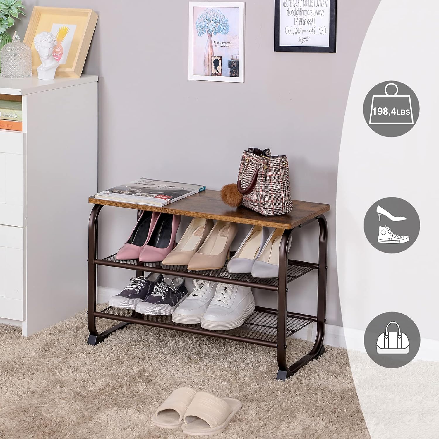 - [Rustic Home For Your Shoes] Do you like the industrial style? Yes! What about shoes? Also yes! With this 9-rack shelf to your shoes, your sneakers can live on the 1st floor, your heels on the 2nd floor, and your slippers on the 3rd floor