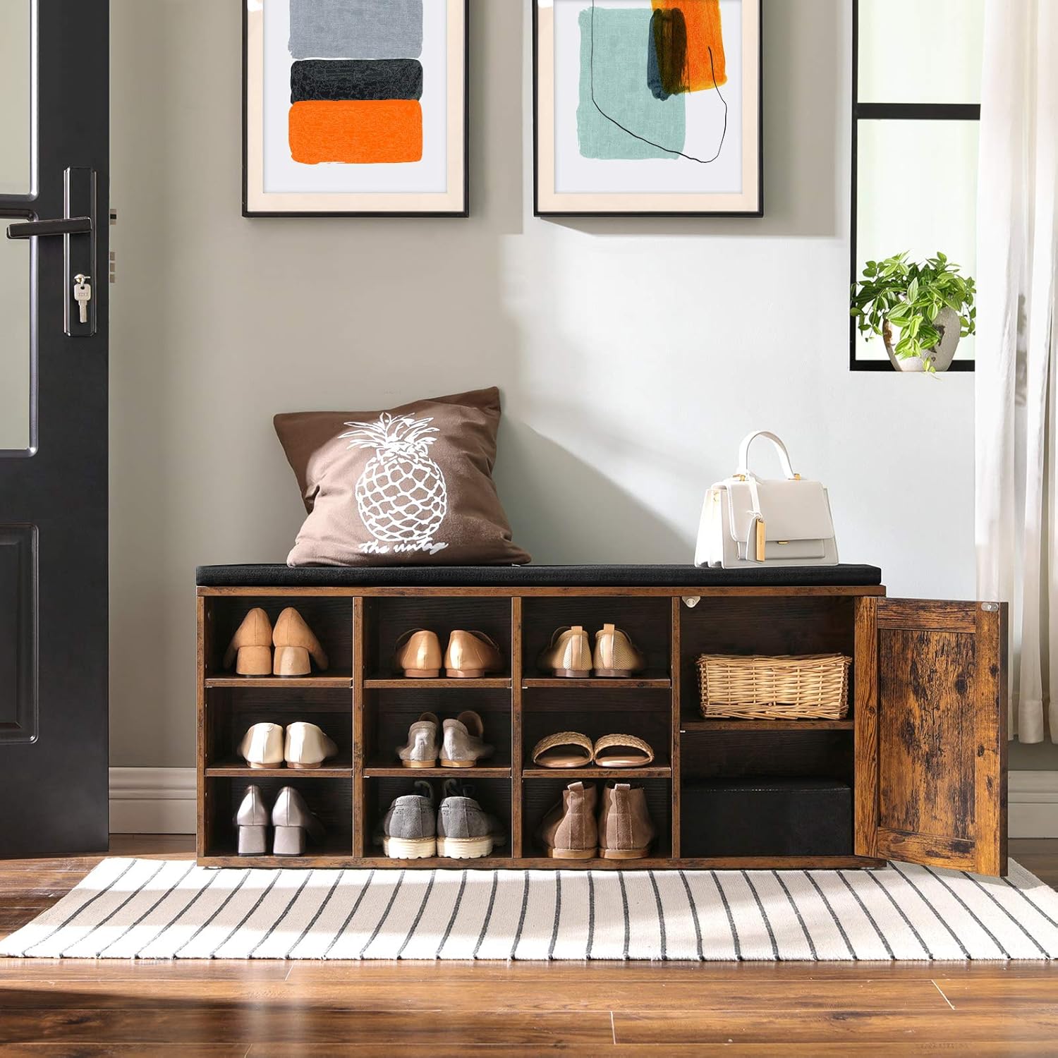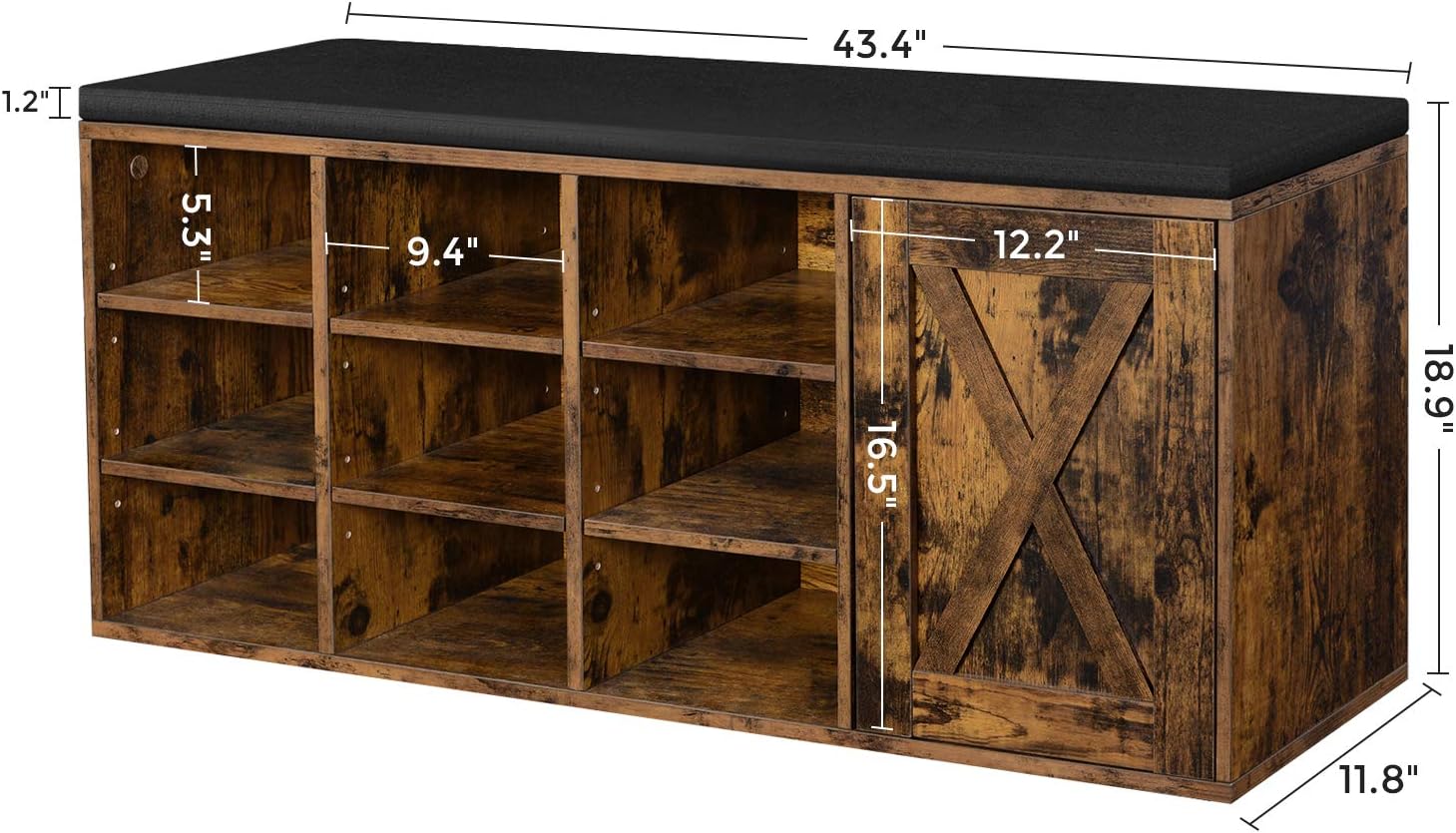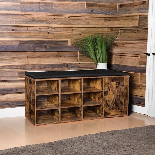 VASAGLE Shoe Bench, Storage Bench with Cupboard and 9 Open Compartments, Shoe Shelf, Padded Seat, Barn Door, 11.8 x 43.3 x 18.9 Inches, Rustic Brown ULHS058X01