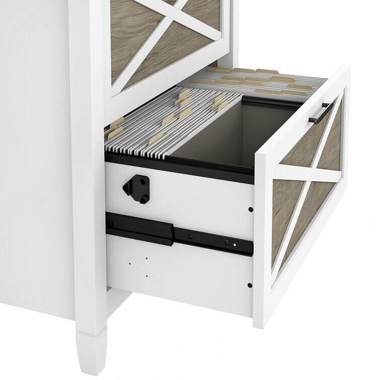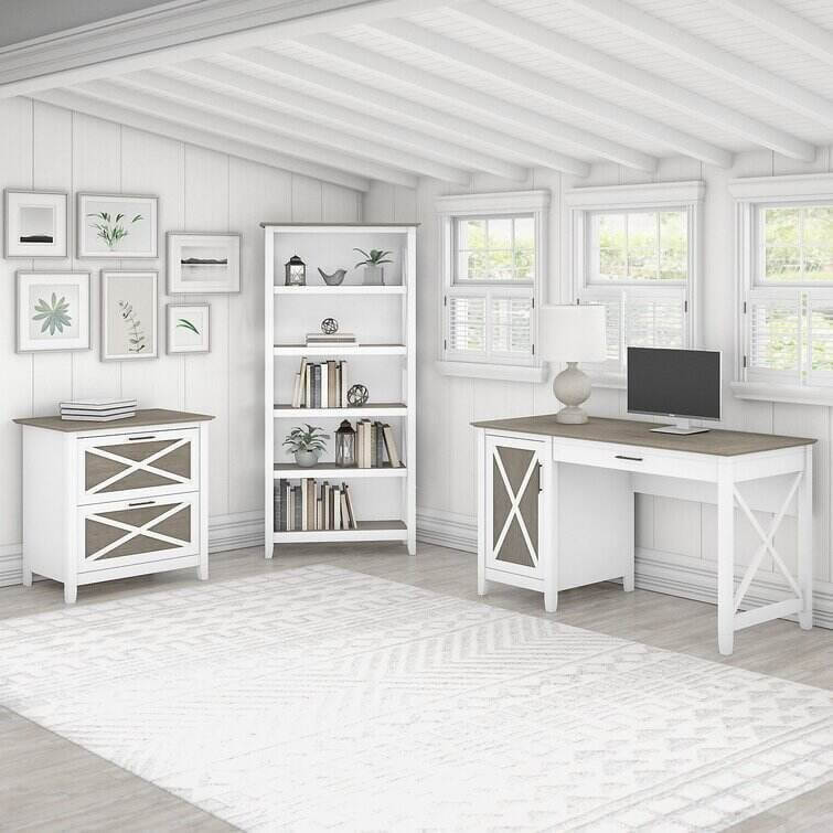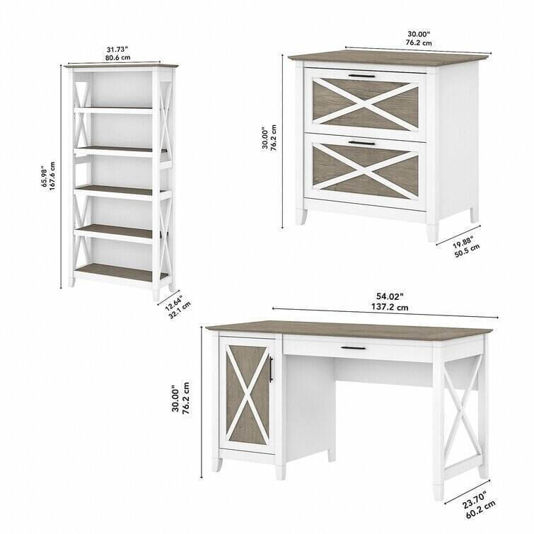 The unique X pattern accents on the 54W computer desk with 2 drawers lateral file cabinet and 5-shelf bookcase express a relaxed look that balances well in many rooms throughout your home or small office. The convenient pull-out keyboard drawer has a flip-down front that folds up neatly when not in use and is built with full-extension ball-bearing slides to handle day-to-day use. The desk storage cabinet has one adjustable shelf and includes wire management for easy access to cords. This collection offers the look of natural reclaimed wood with an authentic dark gray hickory, cape cod gray, pure white oak, shiplap gray/pure white, linen white oak, reclaimed pine, or bing cherry finish complemented by aged bronze hardware and an attractive post leg design. Enjoy full-extension ball bearing slides on the two lateral file cabinet drawers for easy access to your letter or legal-size folders. This filing cabinet matches the desk's height to create an extended workspace if placed side by side. The bookcase can display your favorite books, art, or photos and fits in a variety of spaces. It features three adjustable shelves for storage flexibility and two fixed shelves that provide added stability. Create an office as big or small as you want. Construction meets ANSI/SOHO standards for safety and performance.